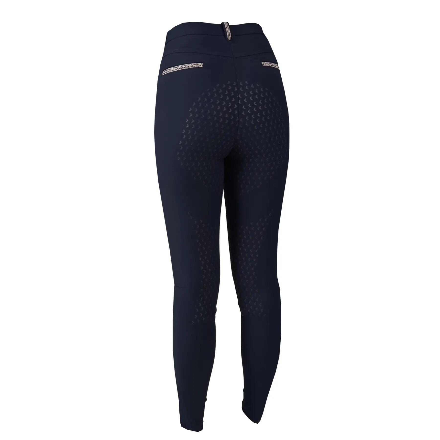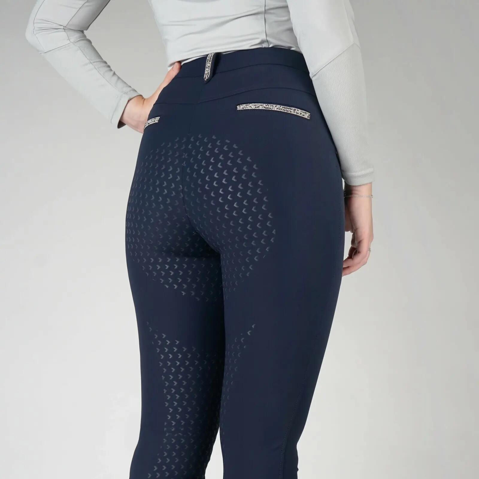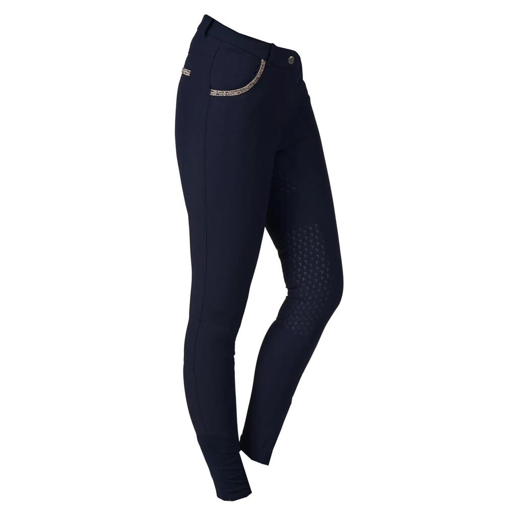 A best-selling technical fabric panty with elegant glitter accents. The Nicola panty is a stylish and well designed panty made of highly technical Super X fabric. Water repellent, moisture wicking, breathable and with cooling properties. The glittery stripe on the rear belt loops and on the front and rear pockets, as well as the subtly printed silicone patches all over the seat, make these breeches a must-have for both casual riding and competition. The size range is from 128 to 46 and is available in 4 standard colors, with the addition of a new color to match the latest seasonal collection.Product Specifications:- Stylish and fashionable riding breeches made of highly technical Super X fabric- Water repellent, moisture wicking, breathable- Subtle glitter stripe finishes on pockets and belt loops- Front pockets deep enough to hold a cell phone- Available in 1 seasonal color and 4 standard colors- Elasta- Ankle closure- Matte silicone patches all overMaterial:88% Nylon, 12% Spandex, Super X- woven fabricSpecifications-Size