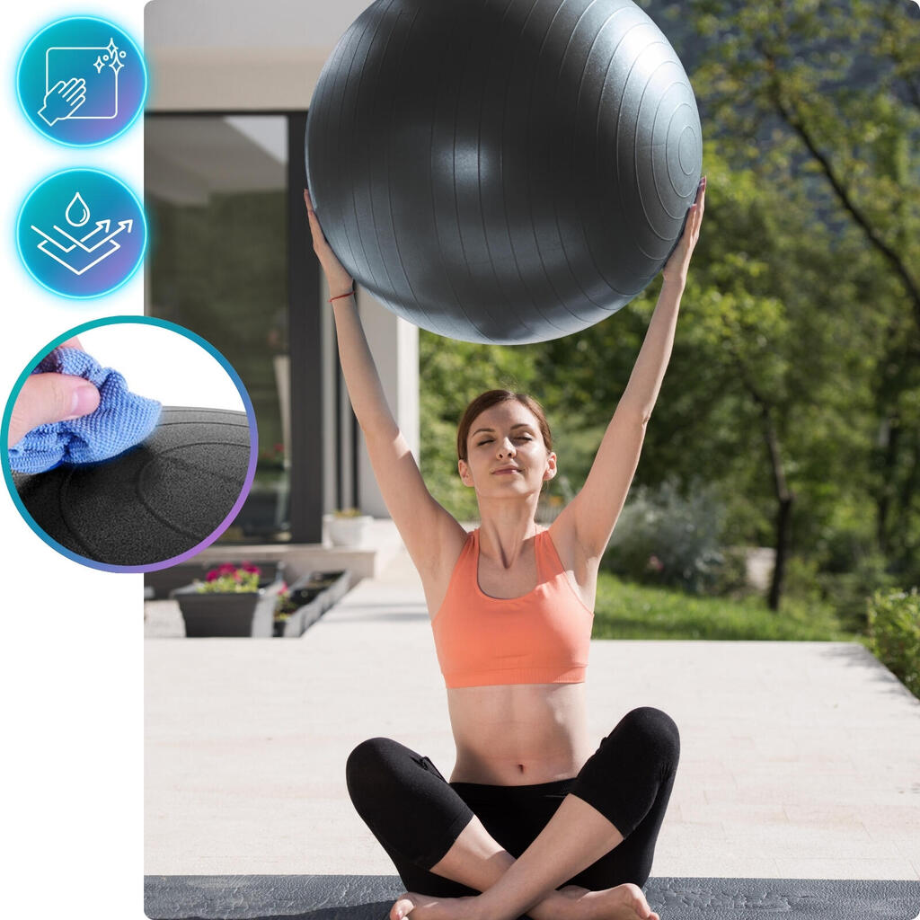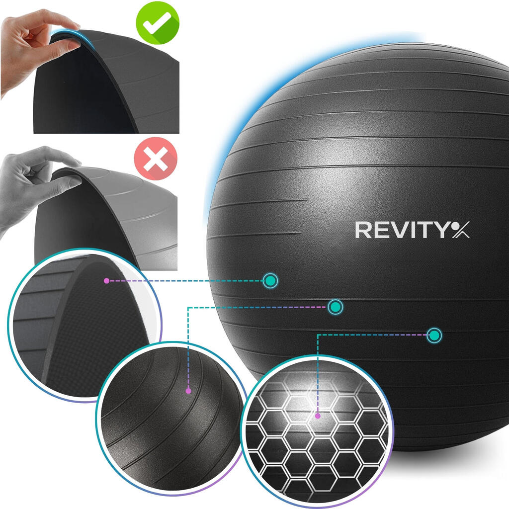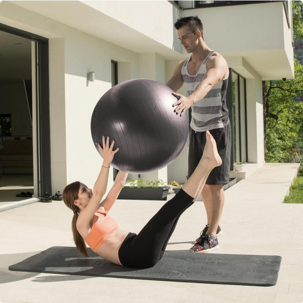 High-density PVC swiss ball: 2.5mm wall, non-slip surface. You get full kit -pump, 2 plugs, tape measure, tool + exercise guide in PDF included.