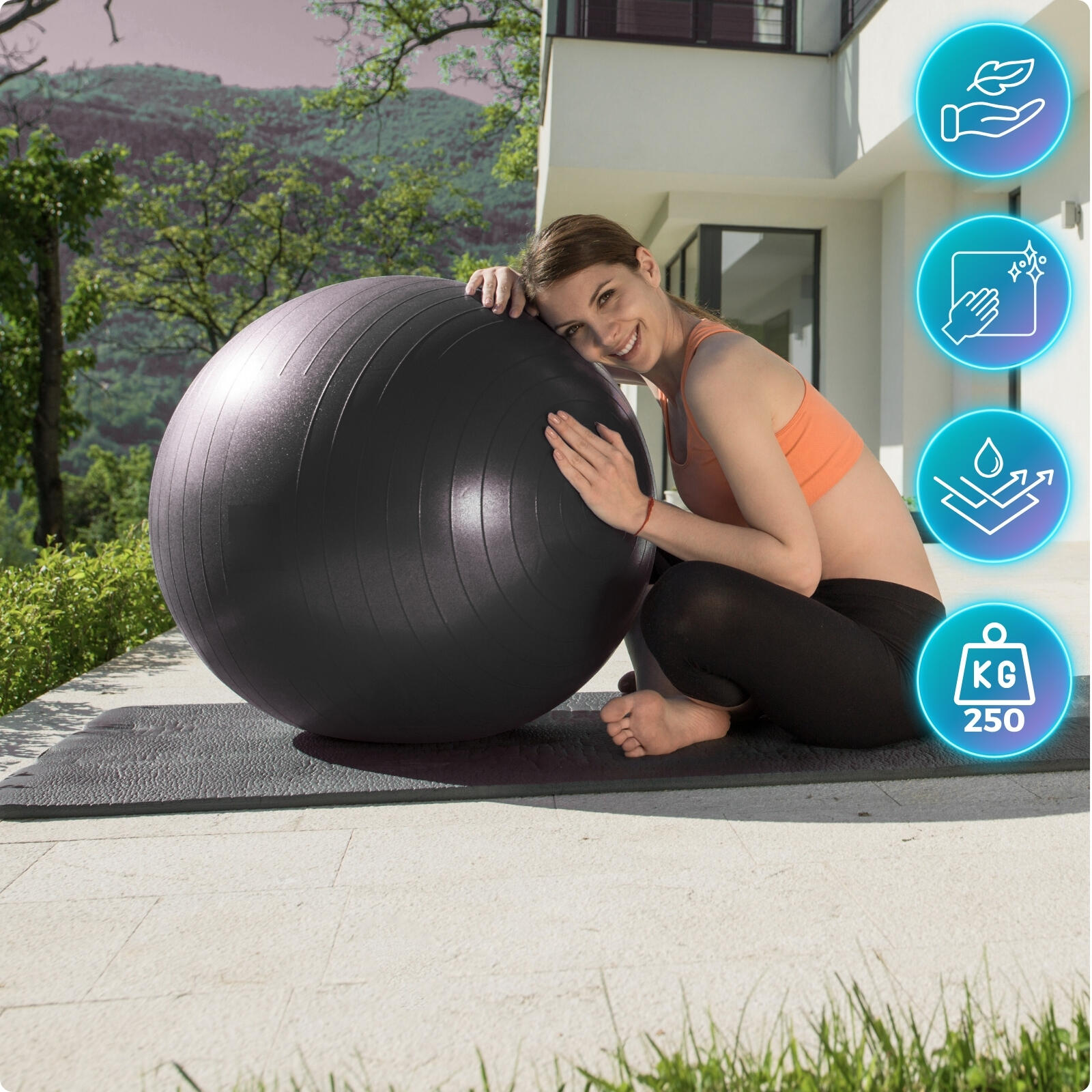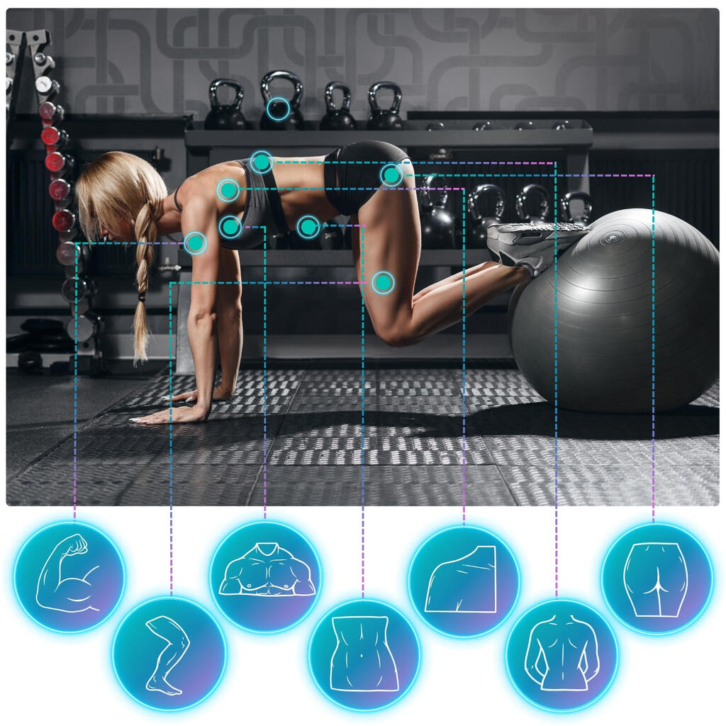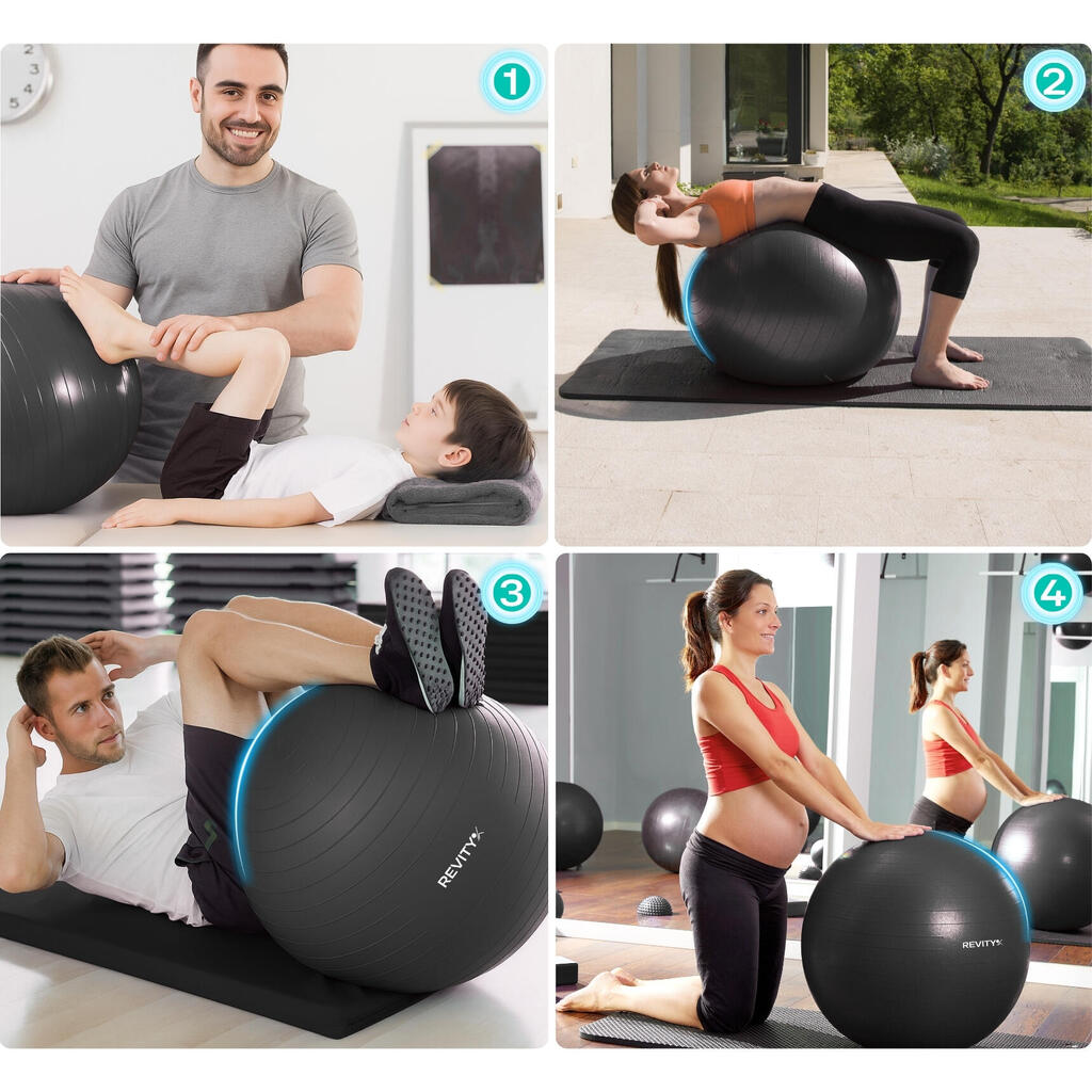 High-density PVC swiss ball: 2.5mm wall, non-slip surface. You get full kit -pump, 2 plugs, tape measure, tool + exercise guide in PDF included.