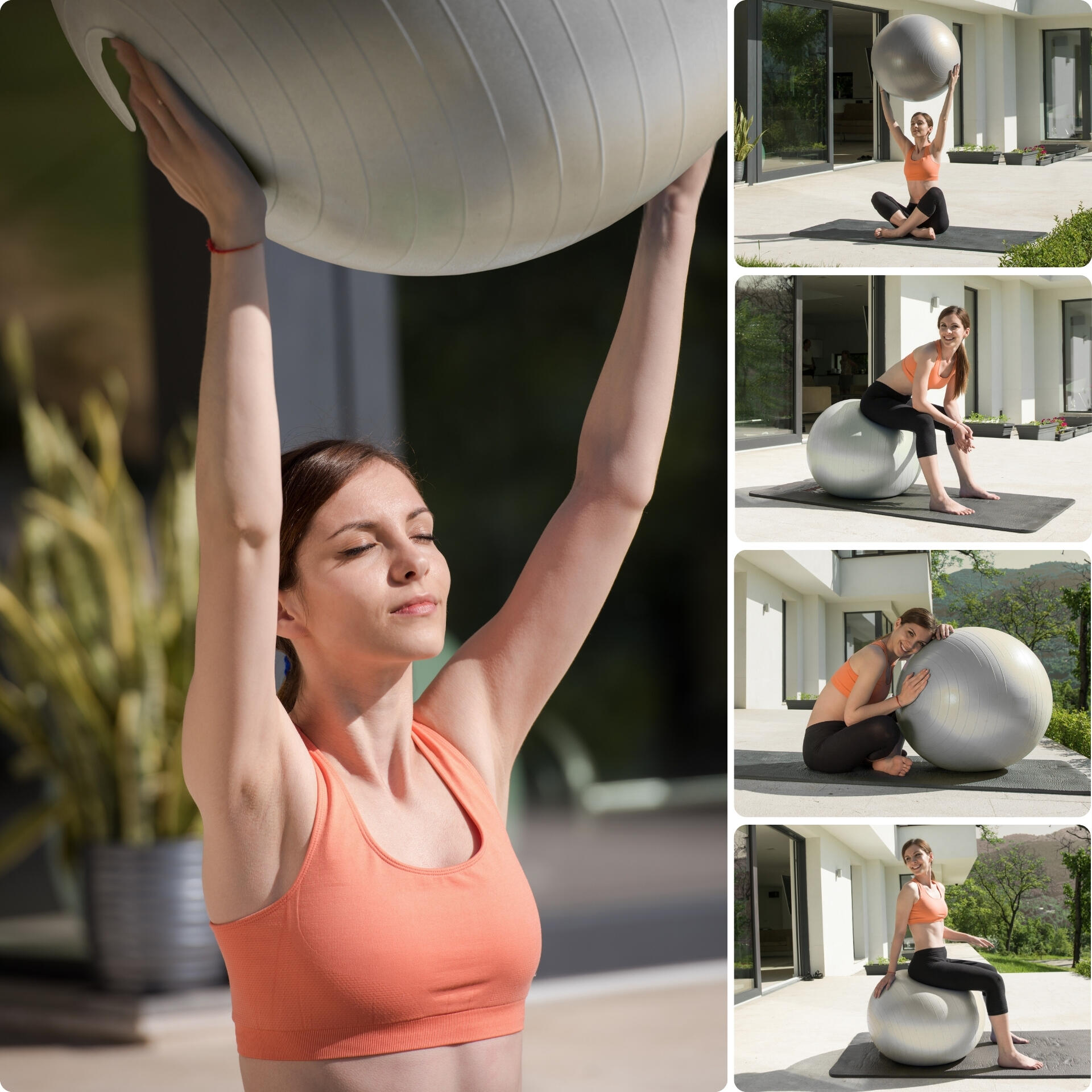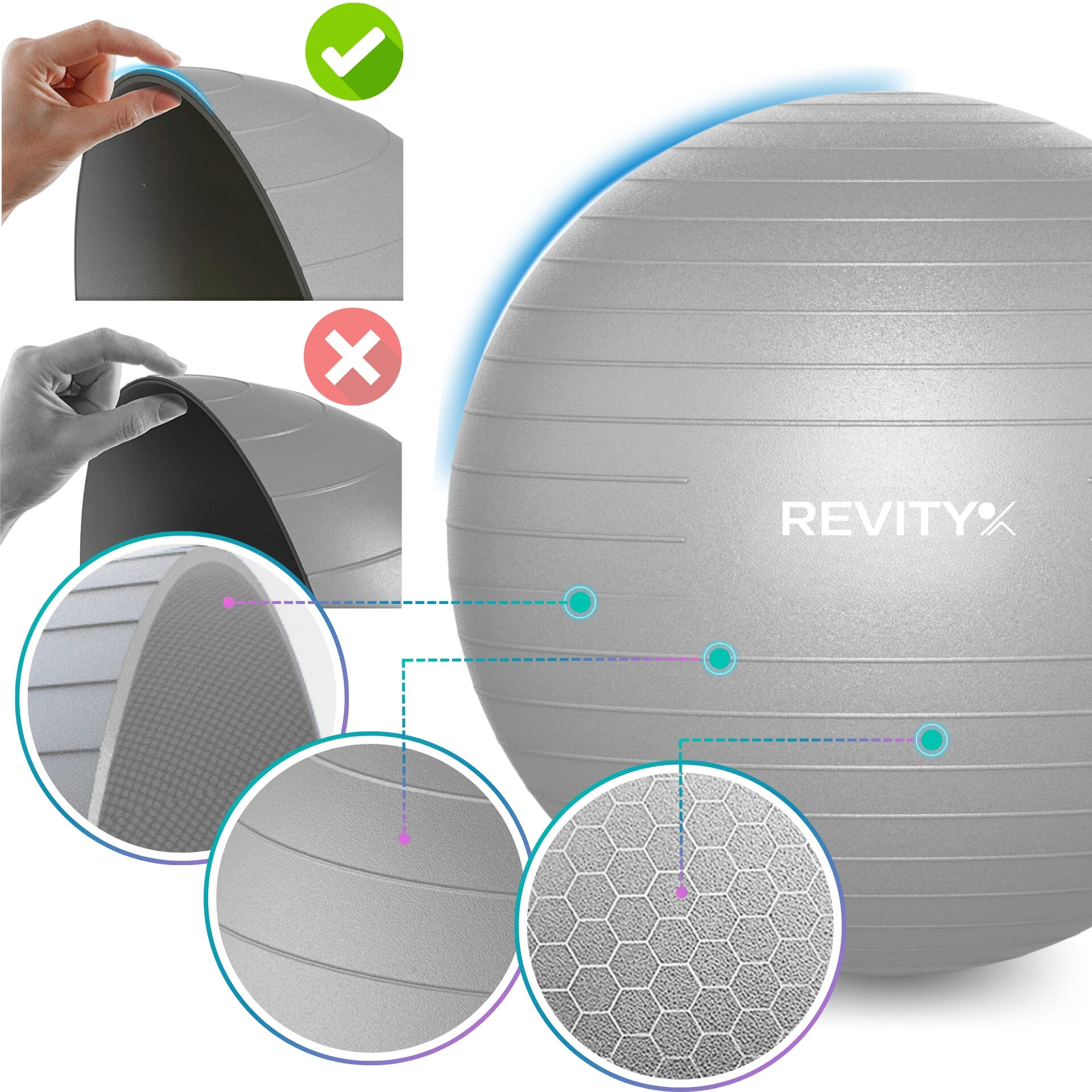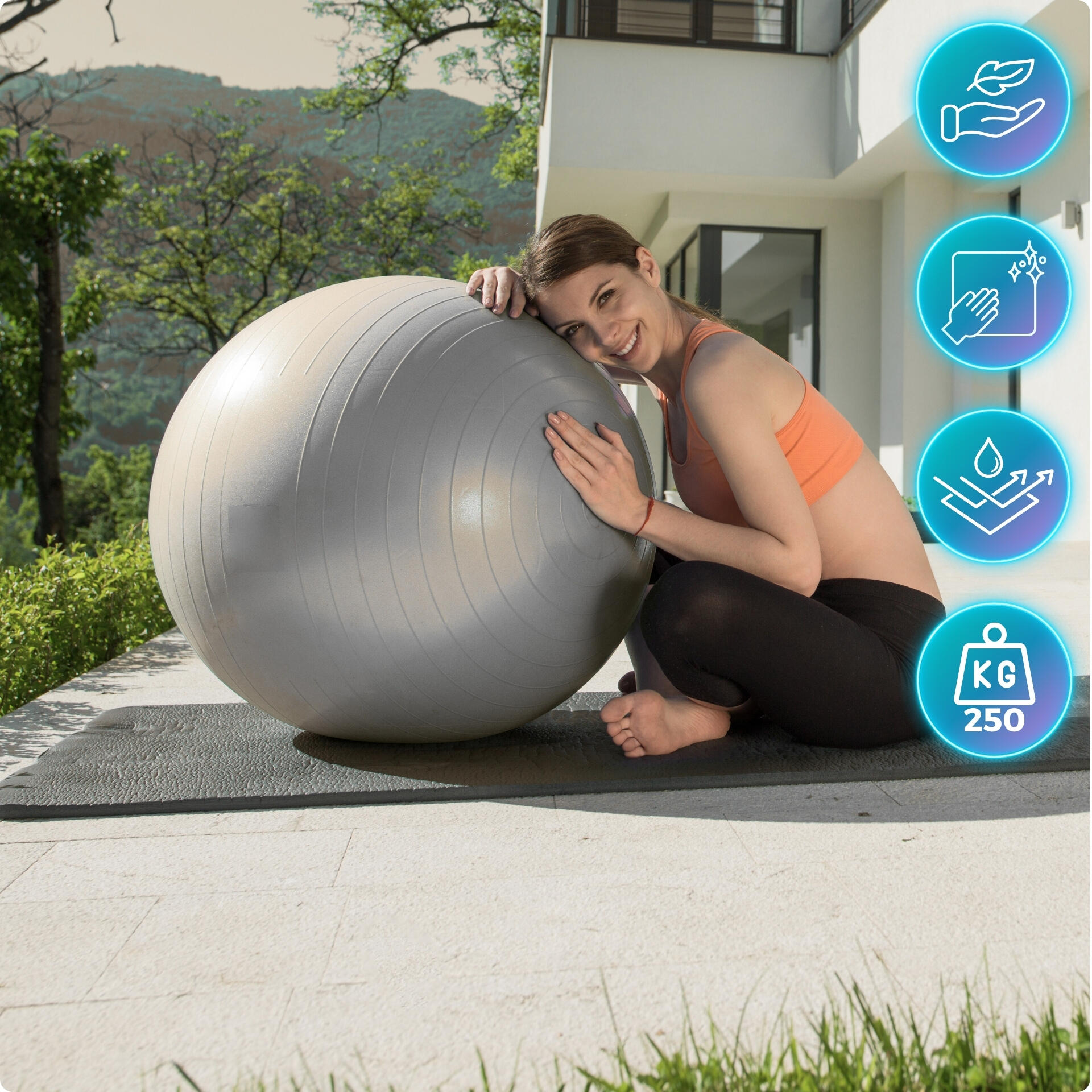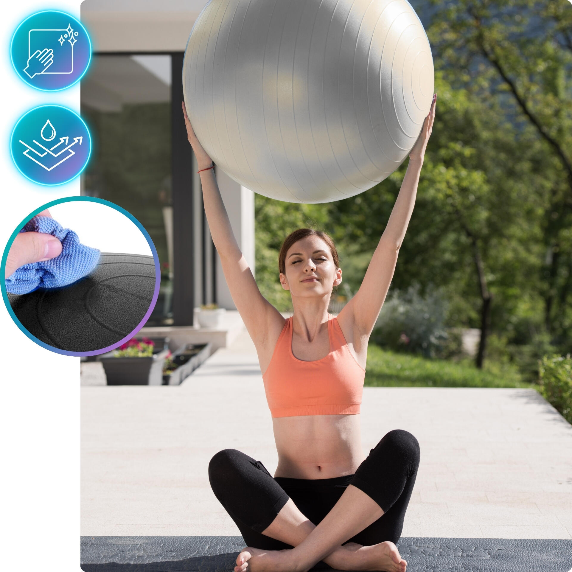 High-density PVC swiss ball: 2.5mm wall, non-slip surface. You get full kit -pump, 2 plugs, tape measure, tool + exercise guide in PDF included.
