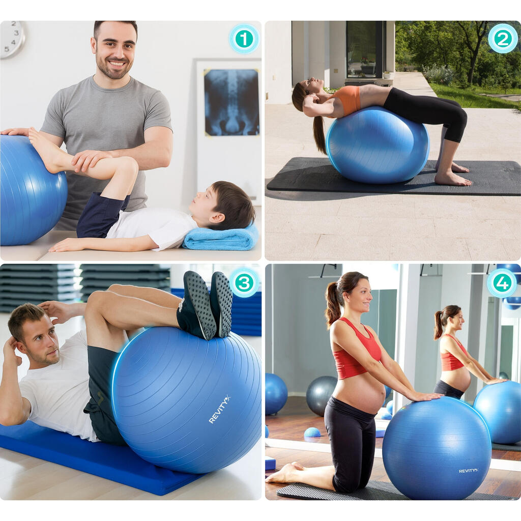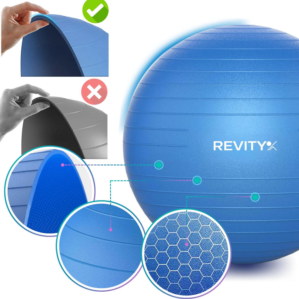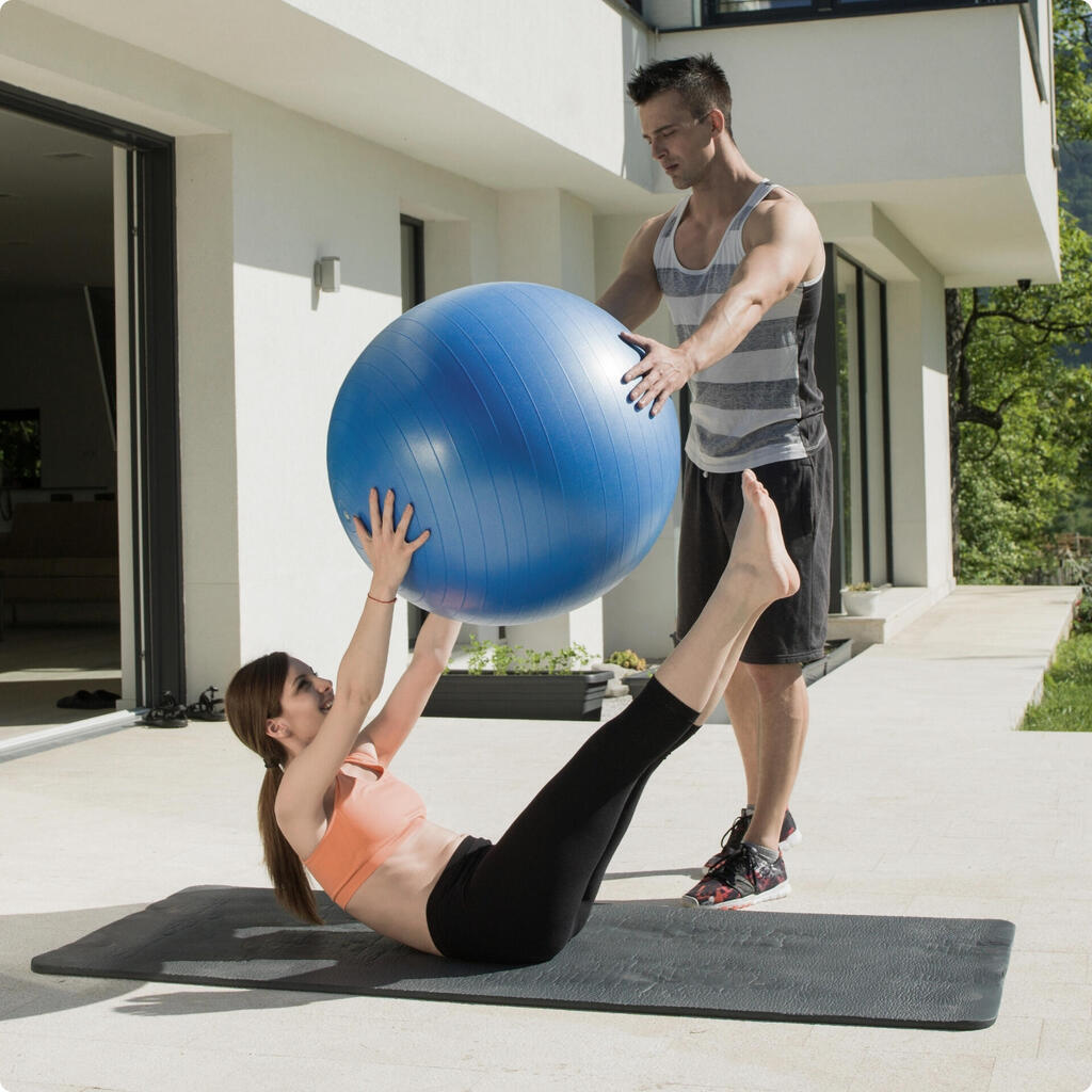 High-density PVC swiss ball: 2.5mm wall, non-slip surface. You get full kit -pump, 2 plugs, tape measure, tool + exercise guide in PDF included.