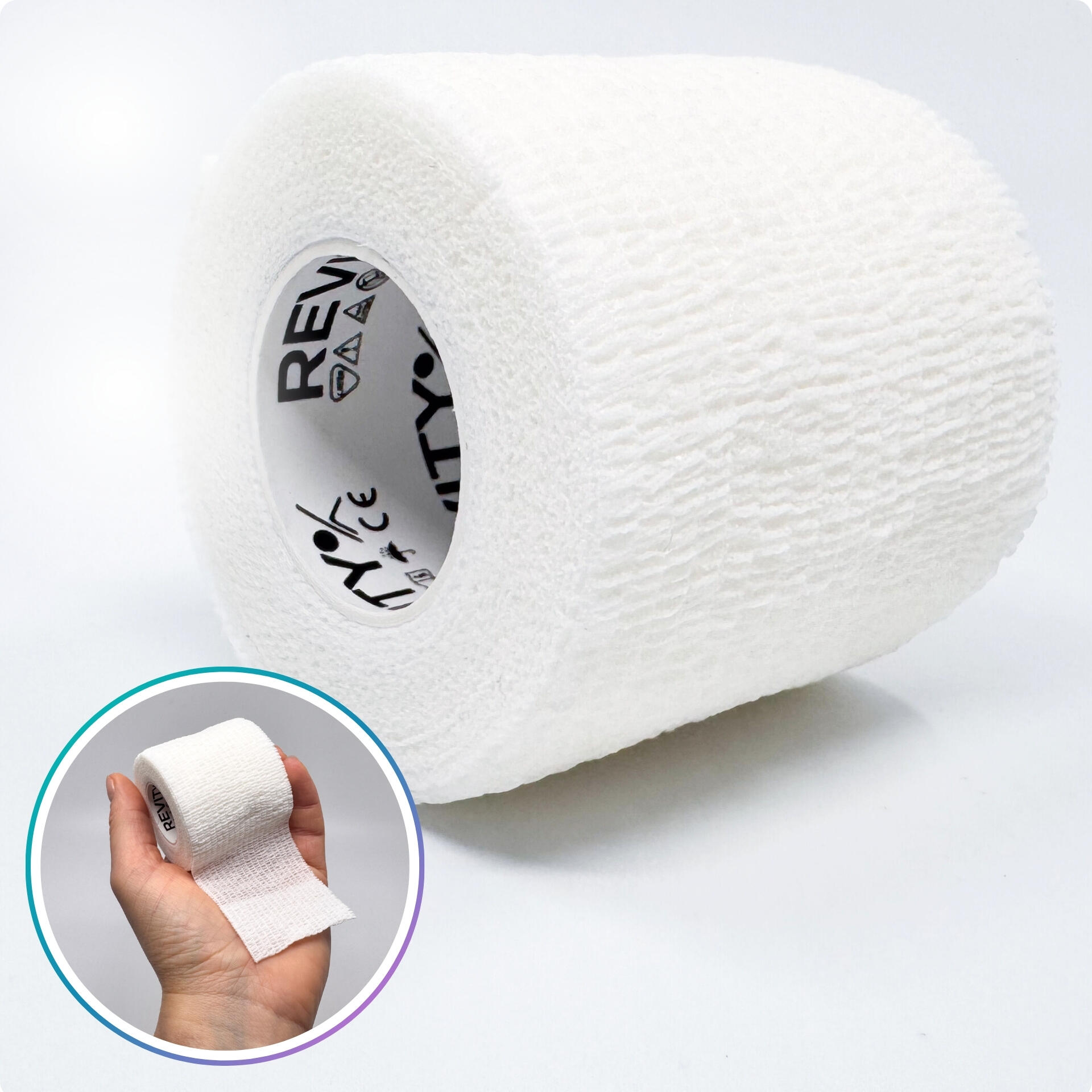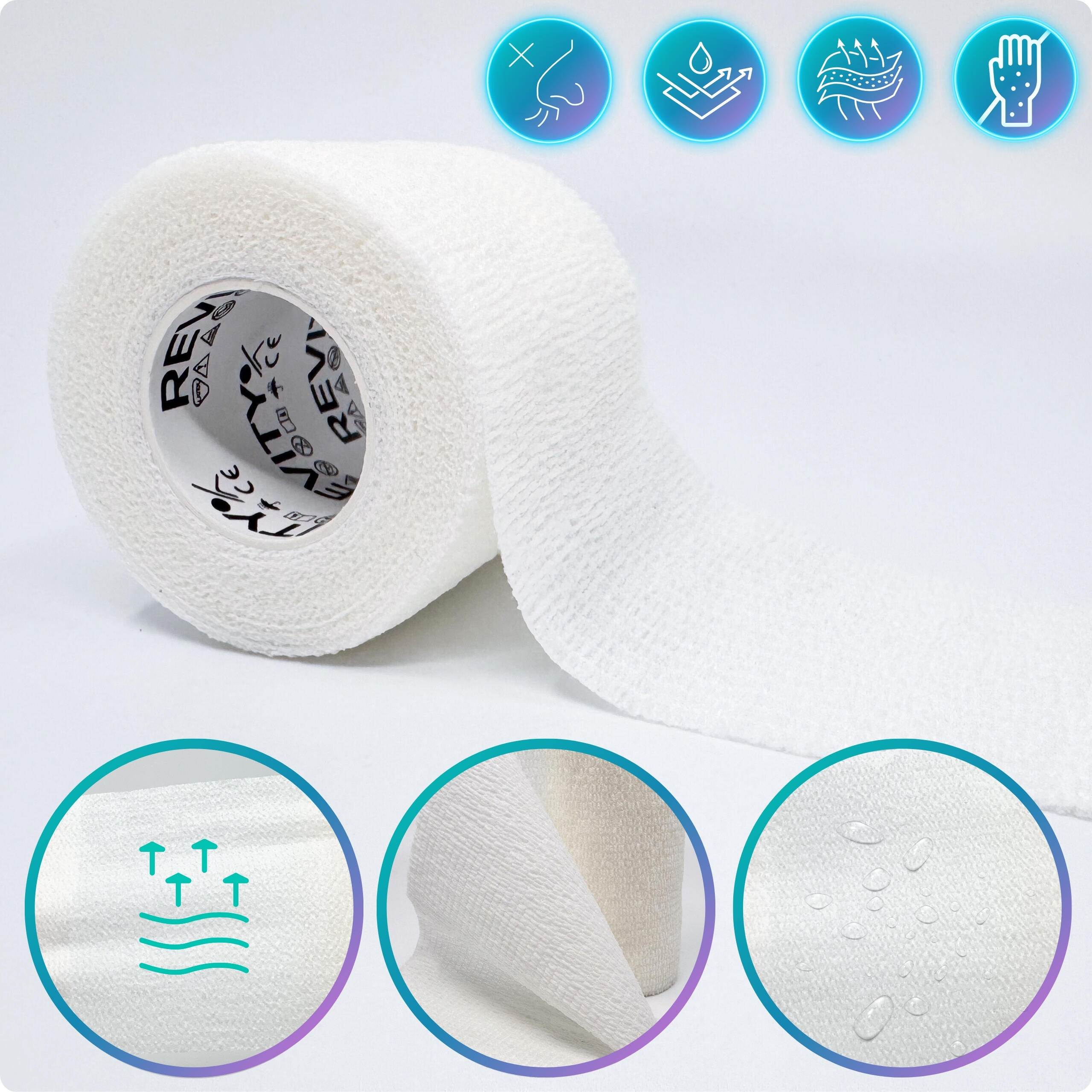 **REVITY FLEX WRAP** is a specific type of securing bandage: it **sticks to itself**, but **does not adhere** to skin, hair/fur, or other surfaces. It is **breathable** (lets the skin breathe) and **does not absorb water**, which makes it useful in many situations.