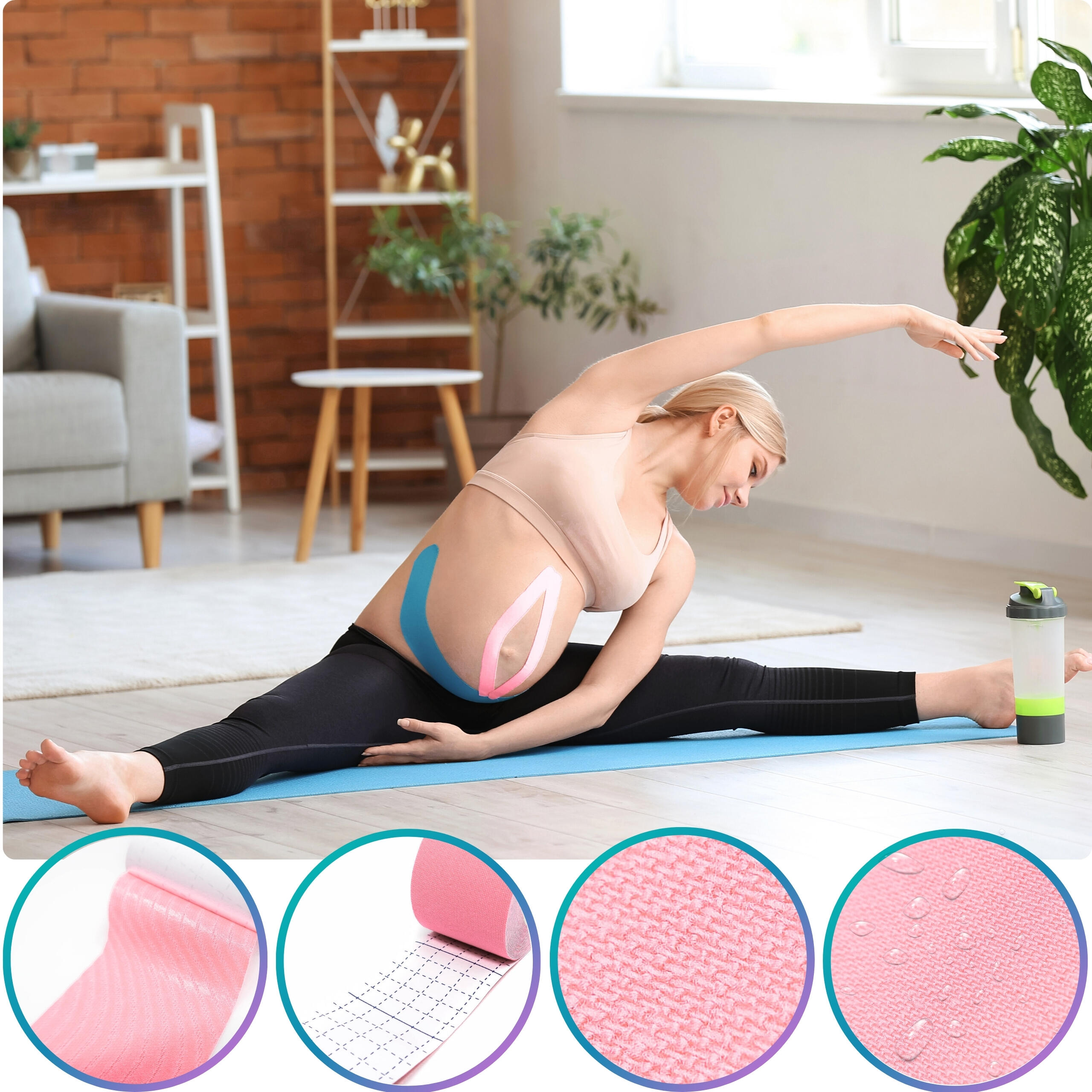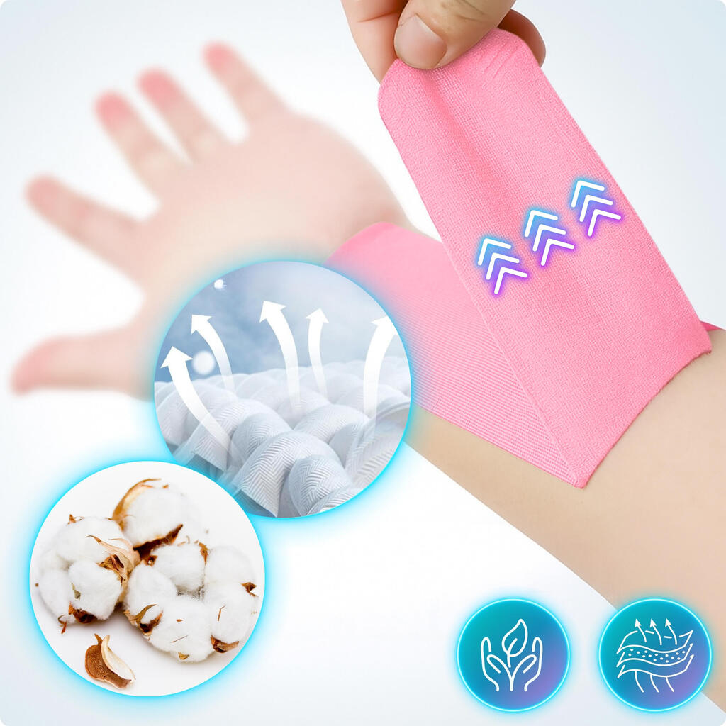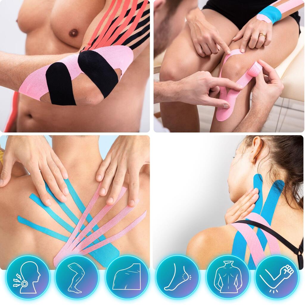 Sports kinesio tape: helps reduce pain and support recovery. Breathable cotton/spandex, hypoallergenic acrylic adhesive, strong hold up to 7 days.
