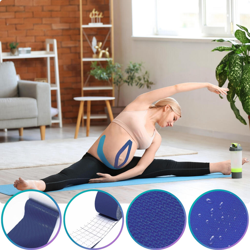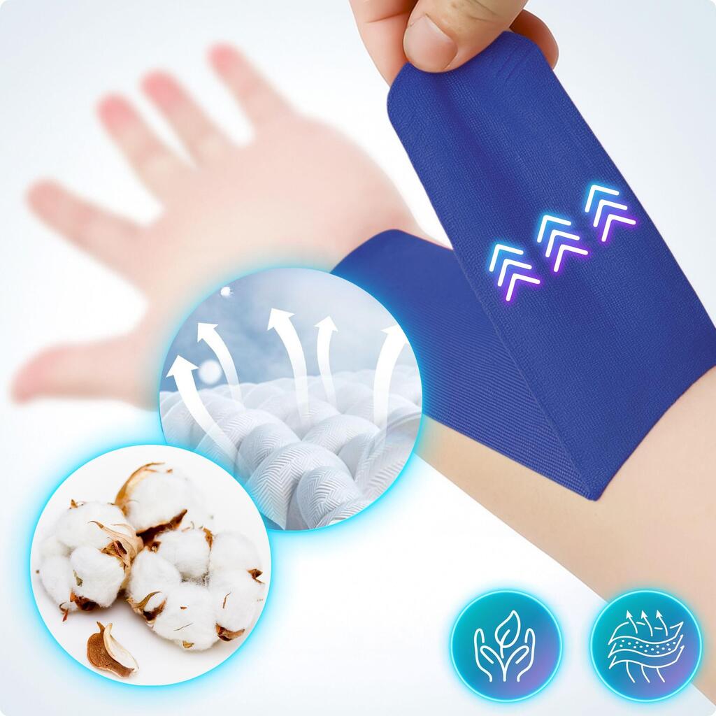 Sports kinesio tape: helps reduce pain and support recovery. Breathable cotton/spandex, hypoallergenic acrylic adhesive, strong hold up to 7 days.
