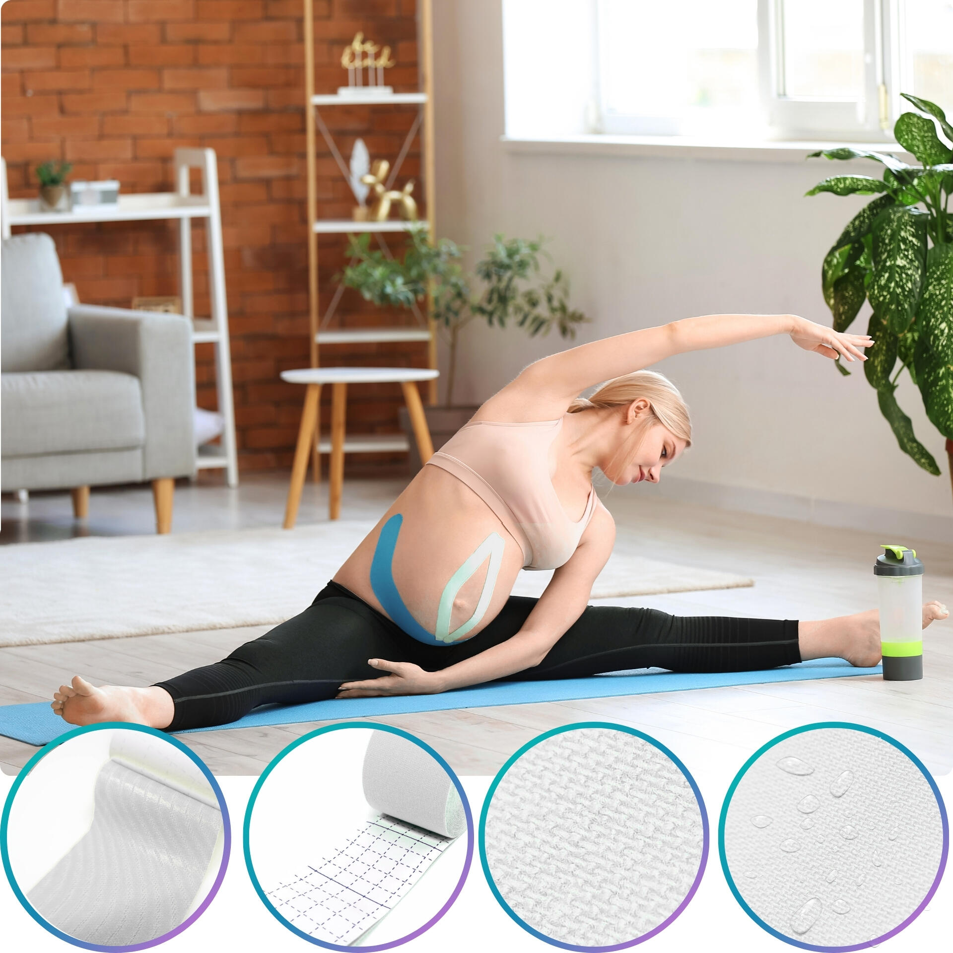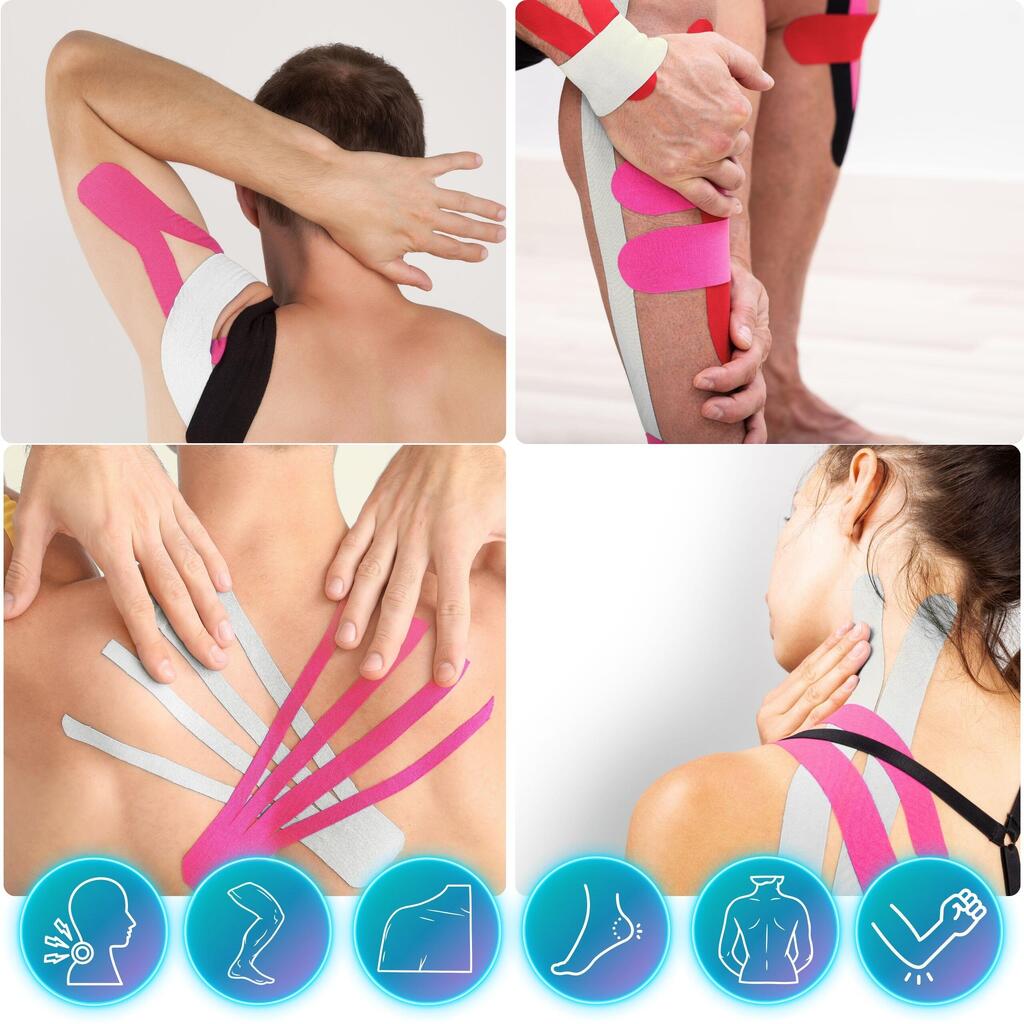 Sports kinesio tape: helps reduce pain and support recovery. Breathable cotton/spandex, hypoallergenic acrylic adhesive, strong hold up to 7 days.