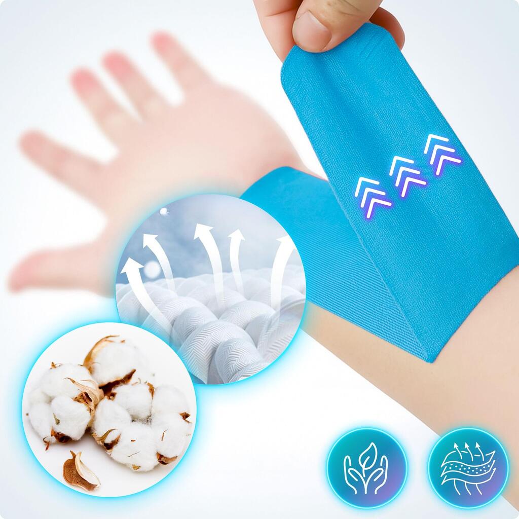 We added improvements that make this tape an excellent choice: quality base materials (cotton + spandex), premium hypoallergenic adhesive, and **medical device** status (strict standards). It is durable, does not fray, stretches well, and adheres properly.