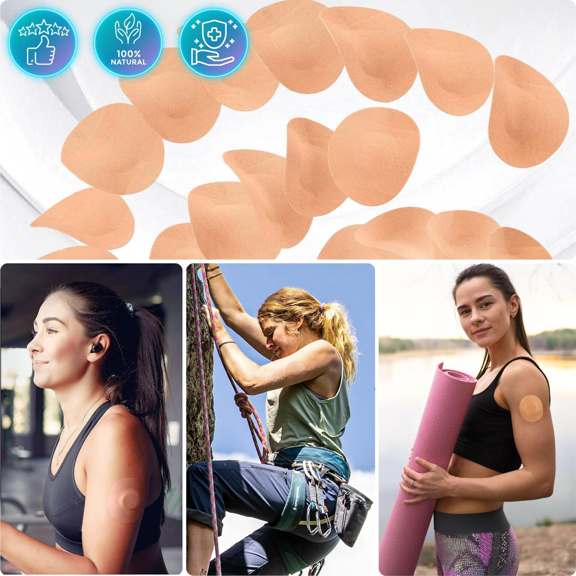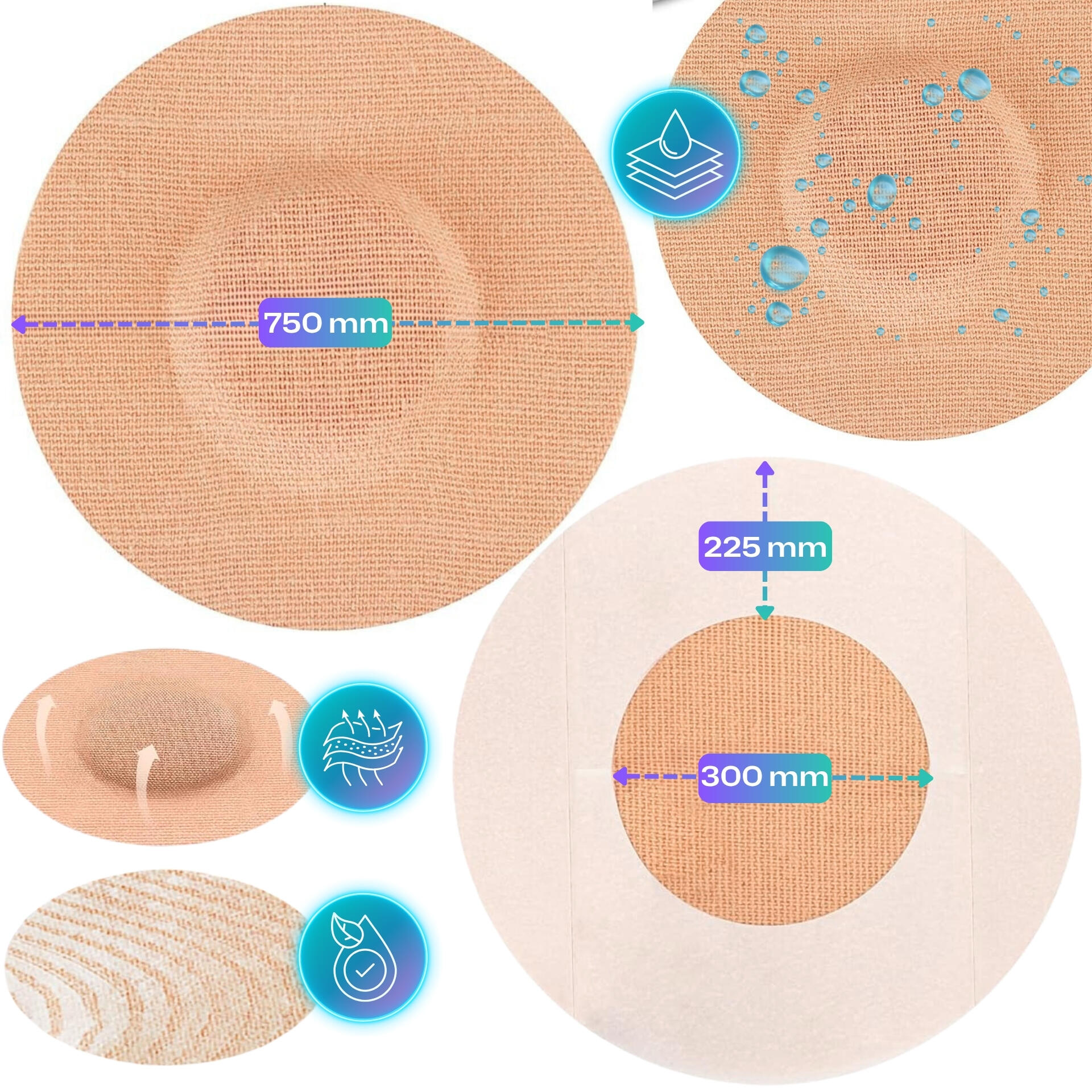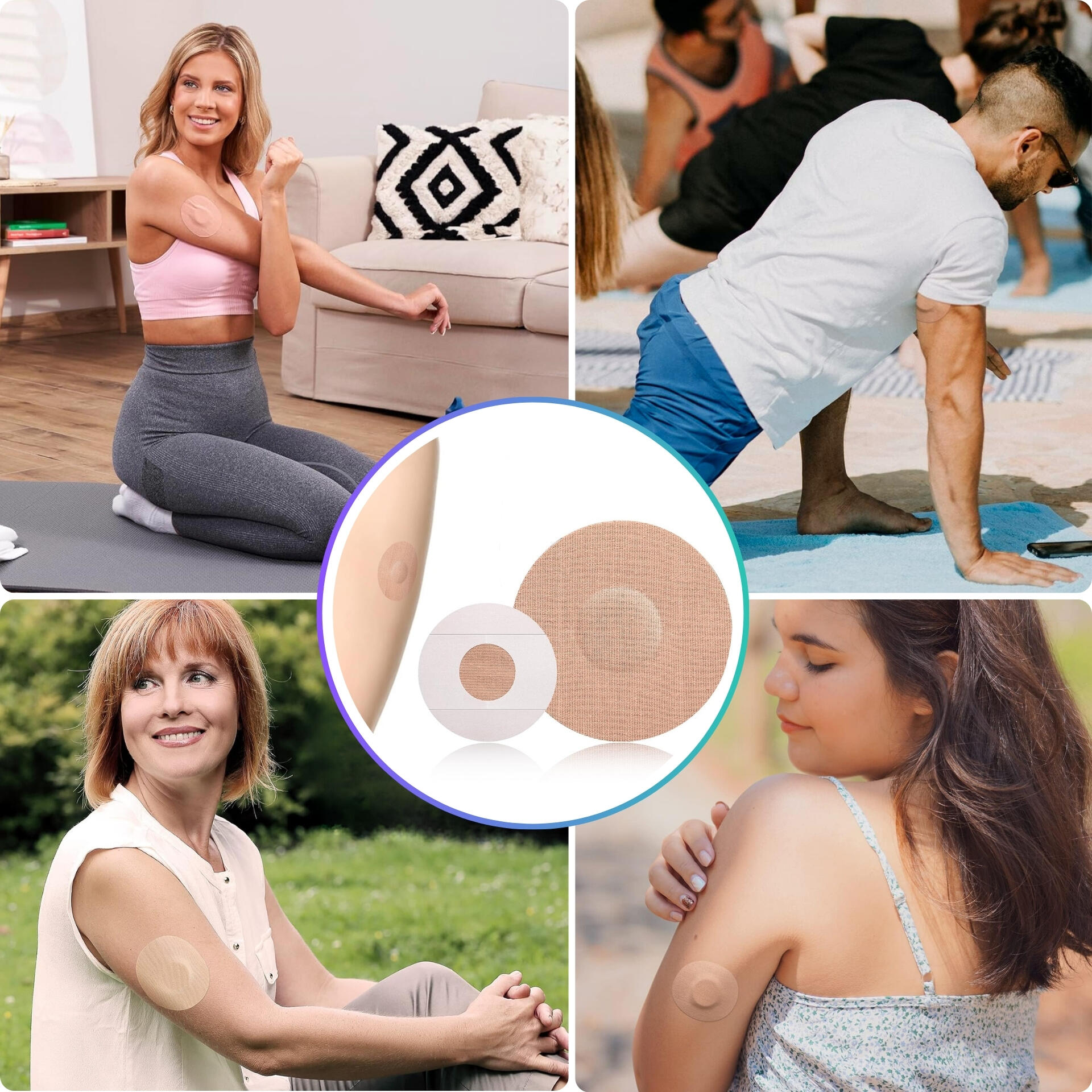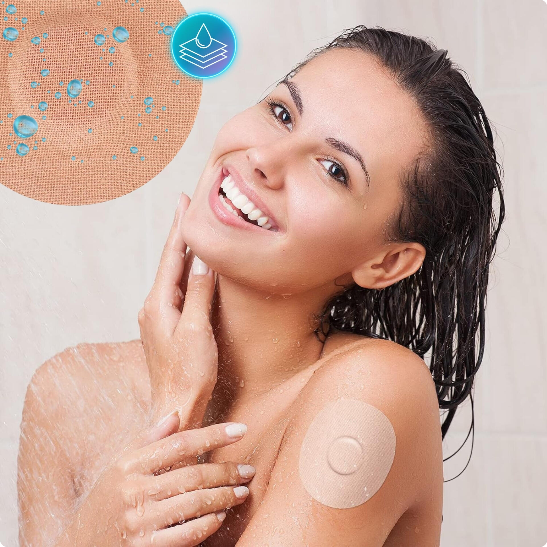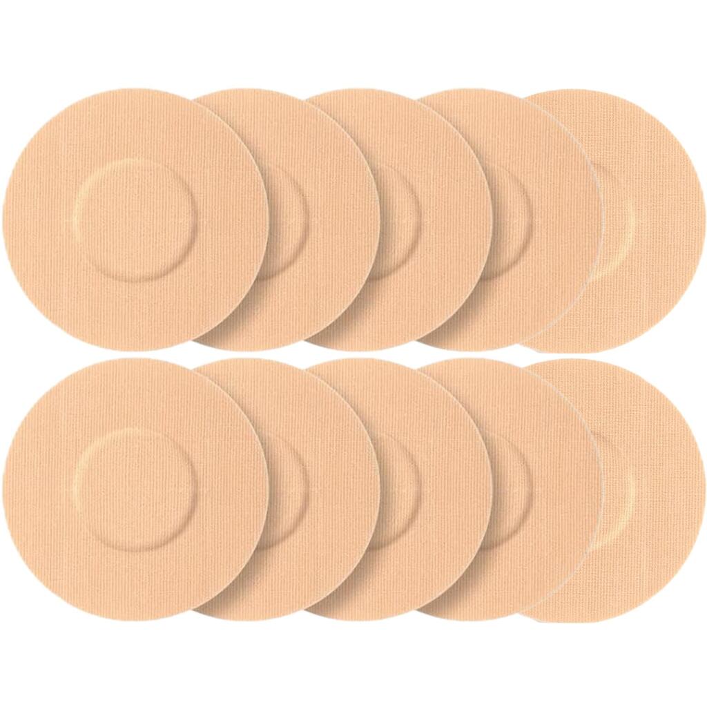 Round 7.5cm patches to secure your sensor daily and during sport: breathable kinesio-inspired textile, hypoallergenic adhesive, non-adhesive centre. Light beige.