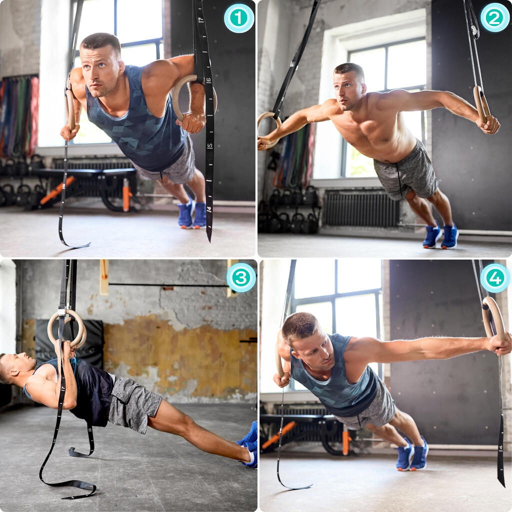 - The kit includes an **exercise guide with training plans**, as well as an **illustrated setup manual** to help you install the rings correctly and train safely.