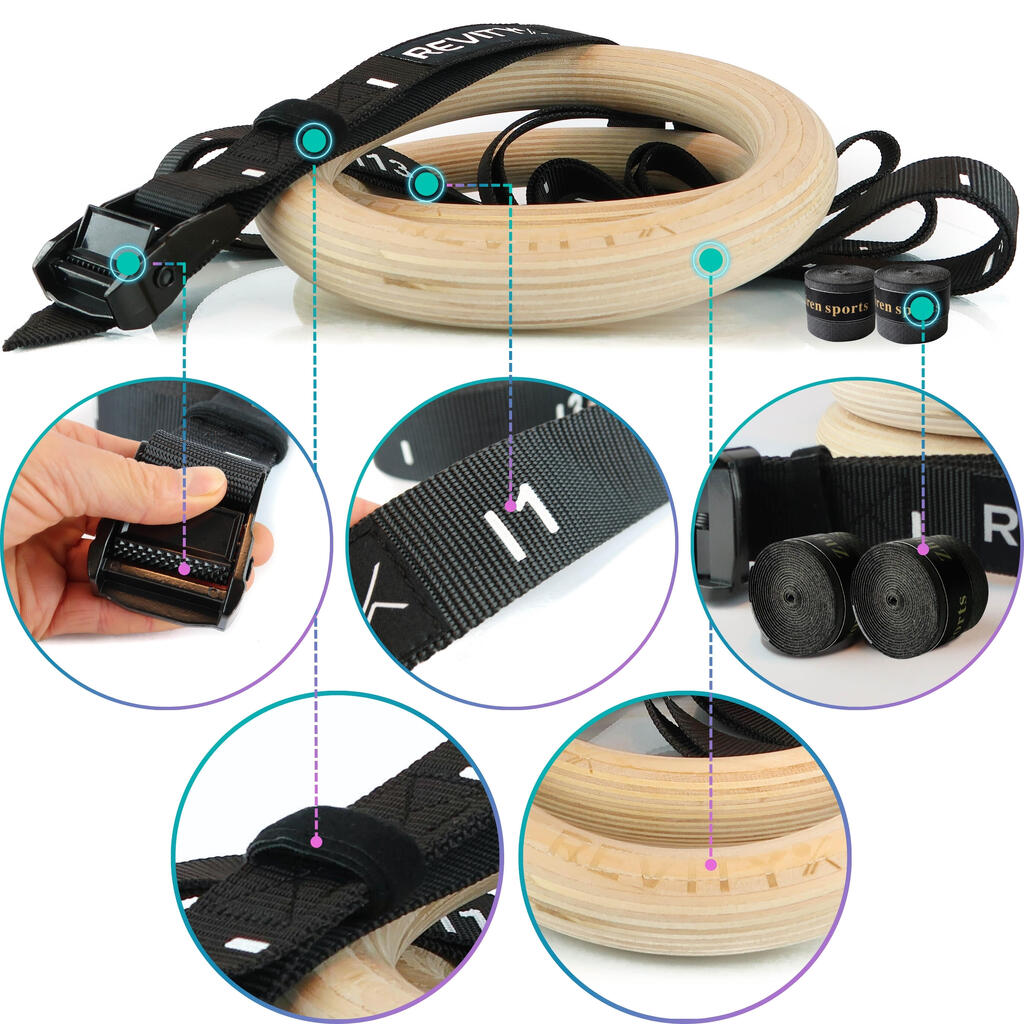 - The rings are made from **laminated wood that is sanded for a smooth finish**, which helps limit warping, and paired with **thick, wide, high-strength straps** and **black metal toothed buckles**. The kit also includes **grips to improve hold**.