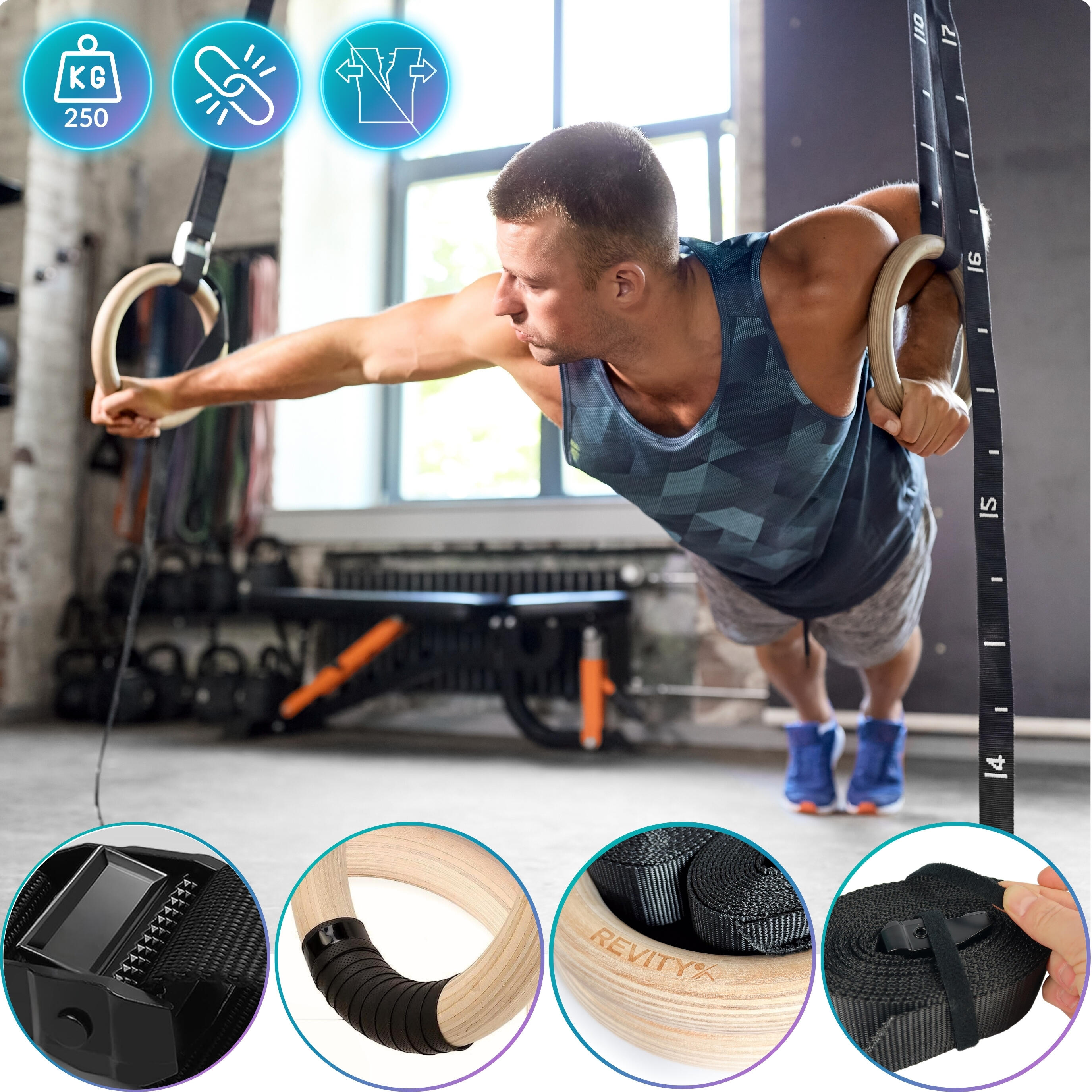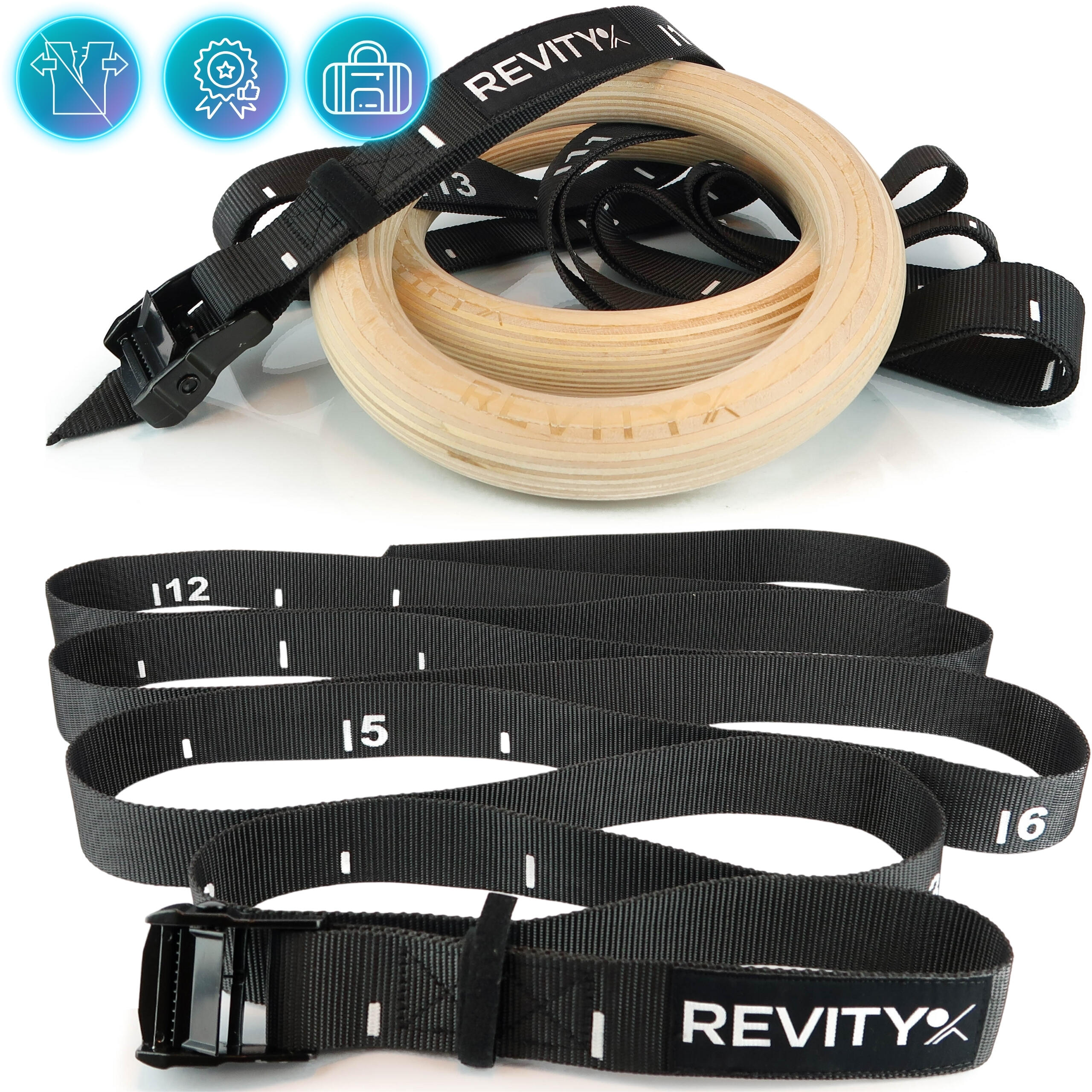 The **REVITY Gym Rings** are gymnastics rings made with premium materials: **high-strength straps, powder-coated steel buckles and smooth wooden rings.**