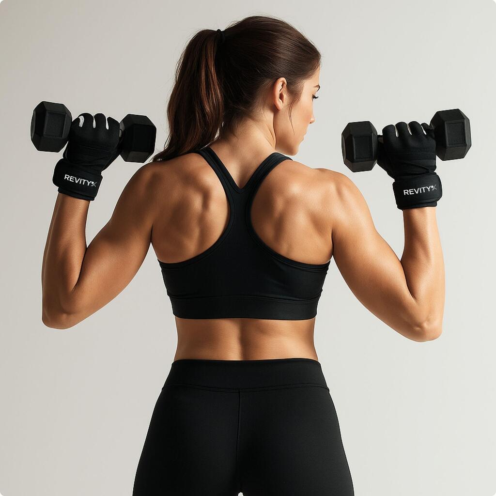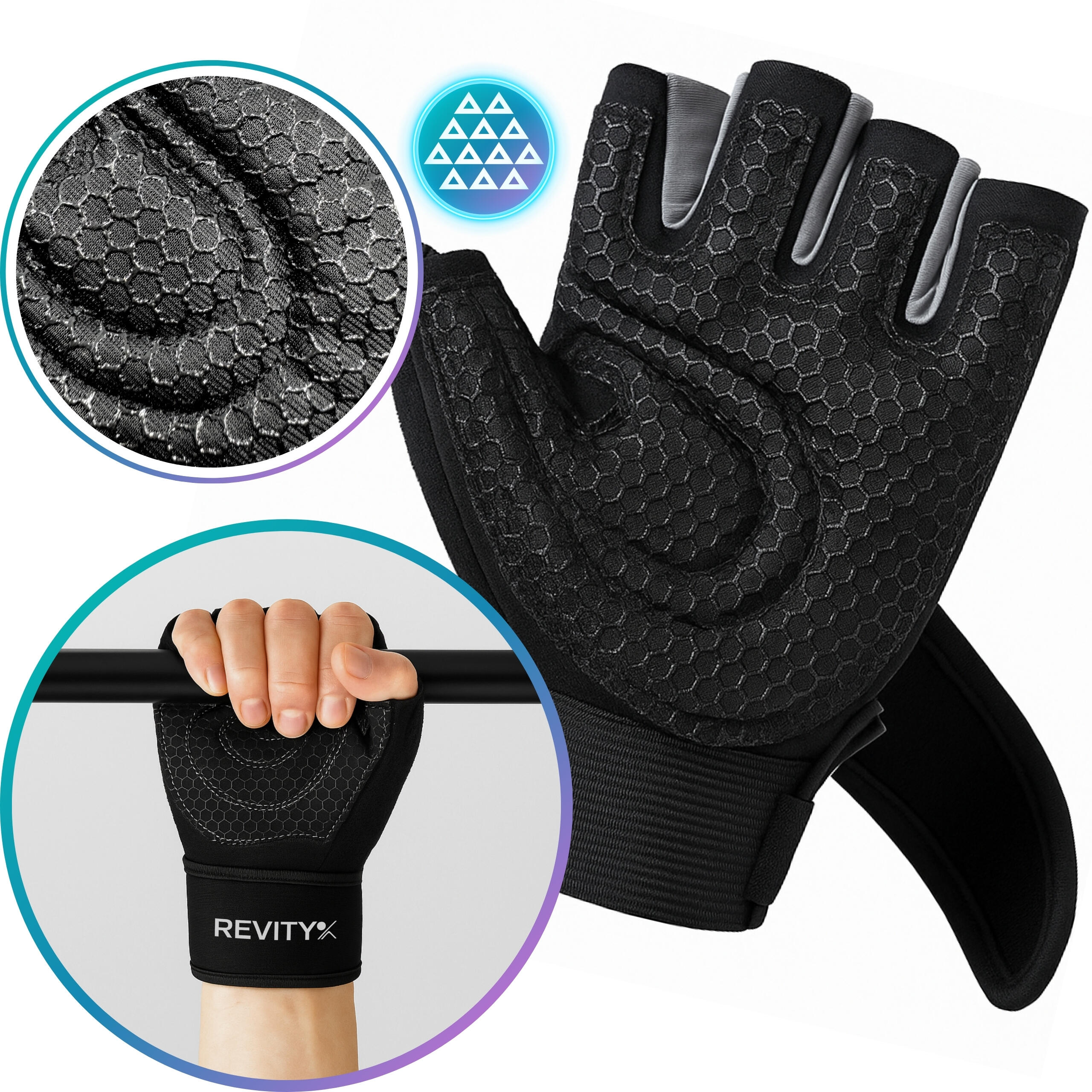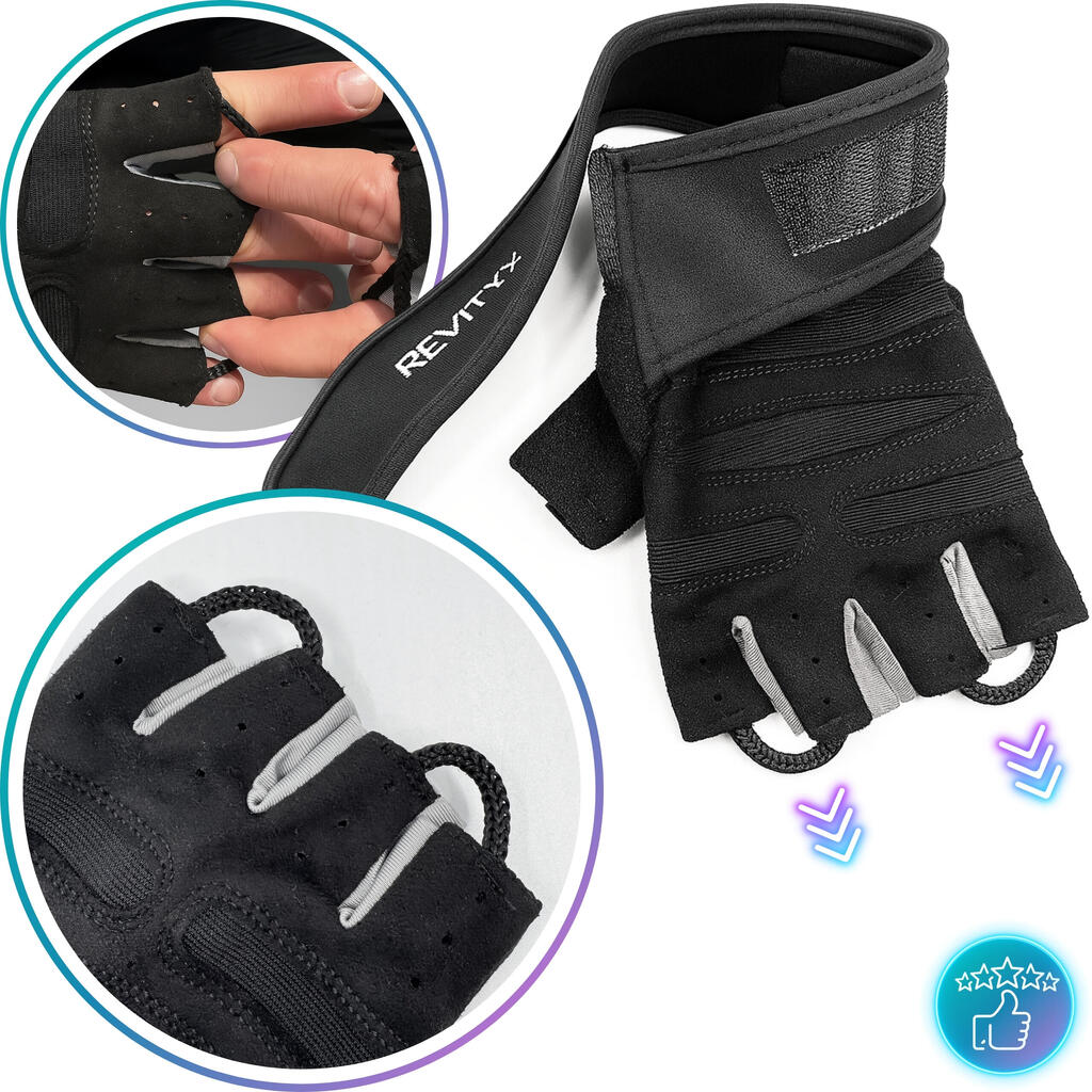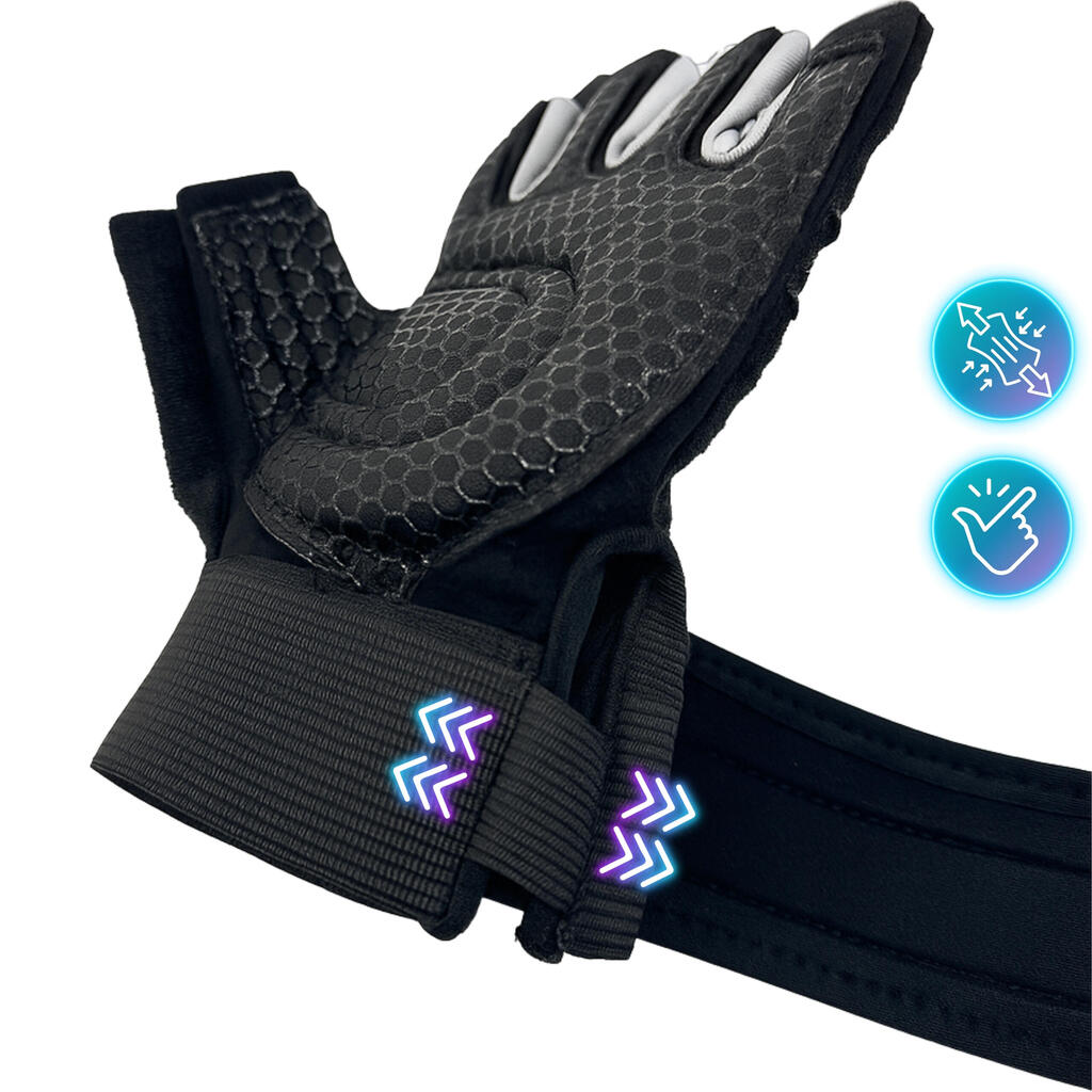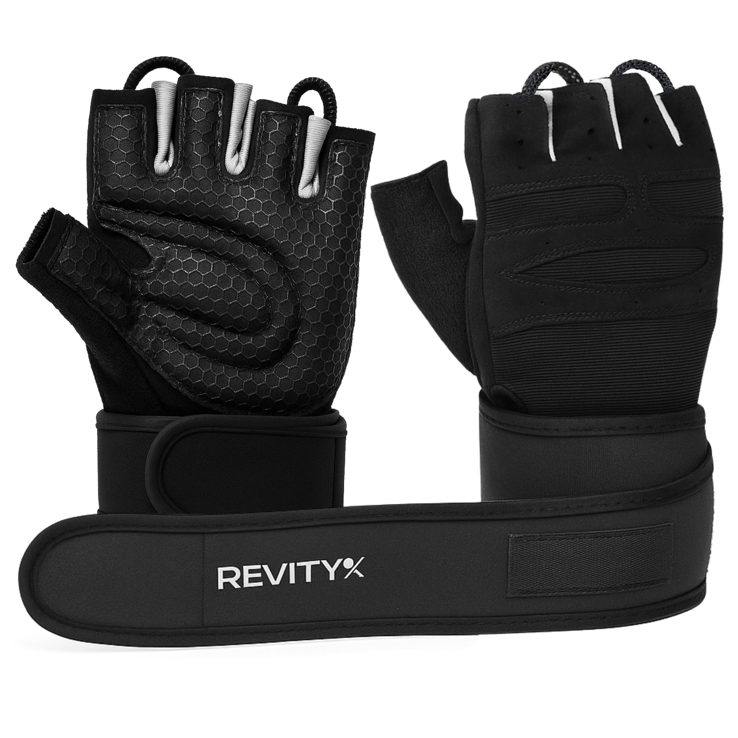 2-in-1 gym gloves: hand protection + wrist support wraps, long stabilising straps, anti-slip palm for reliable grip, pull loops for easy removal.