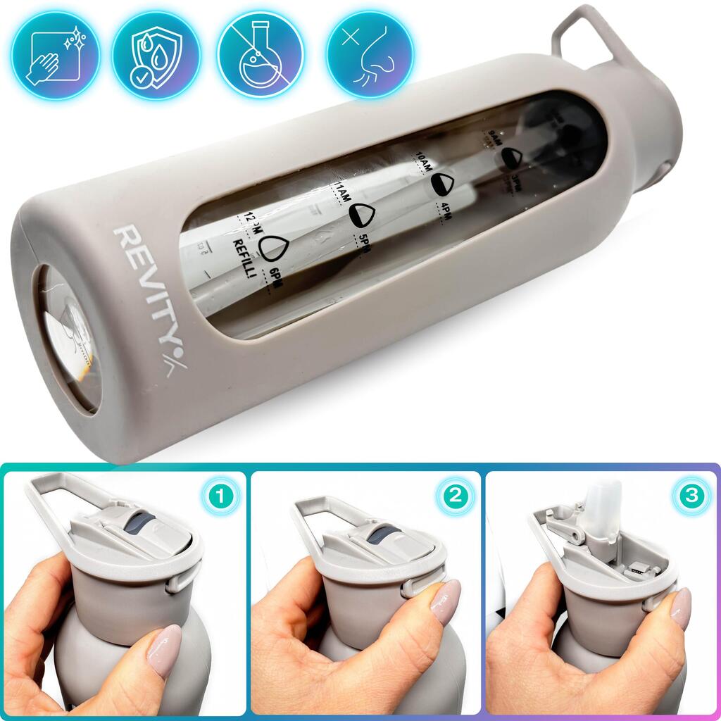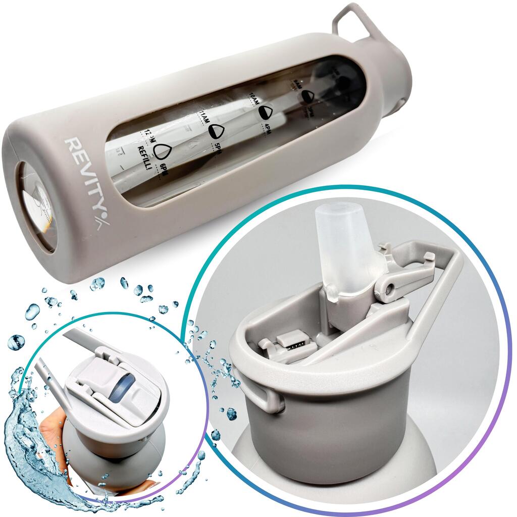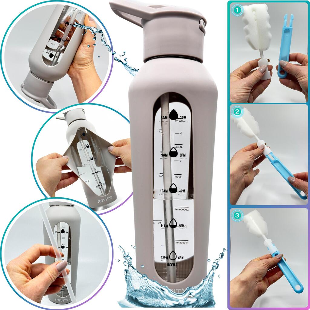 Motivational borosilicate glass sport bottle with time marks: shockproof silicone sleeve, quick-open lid with straw—drink without tilting. BPA-free.