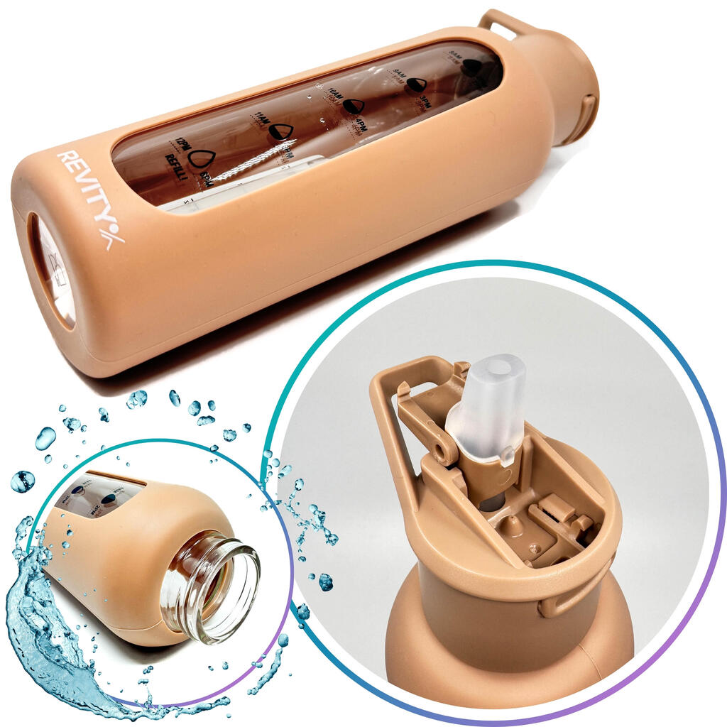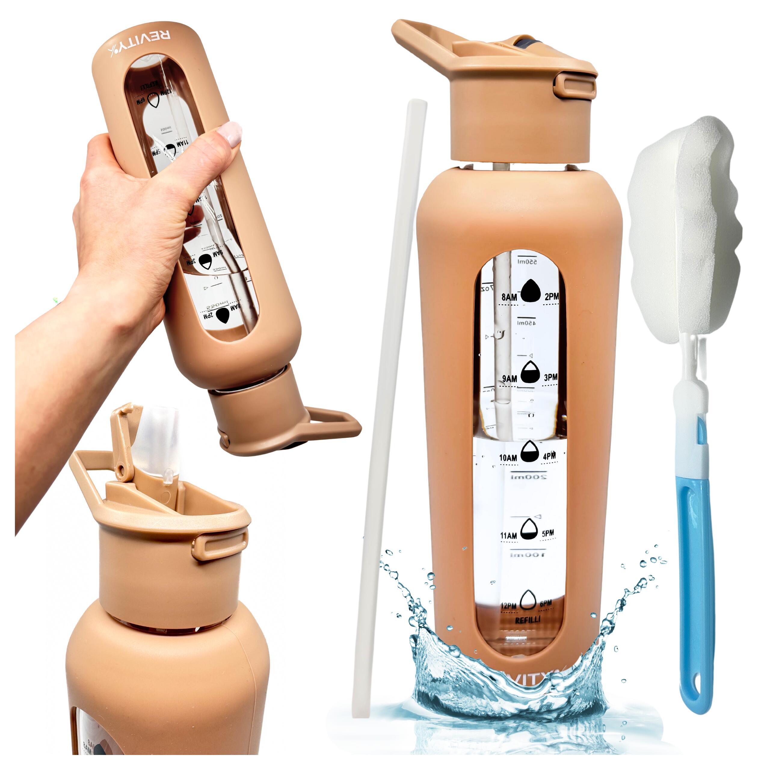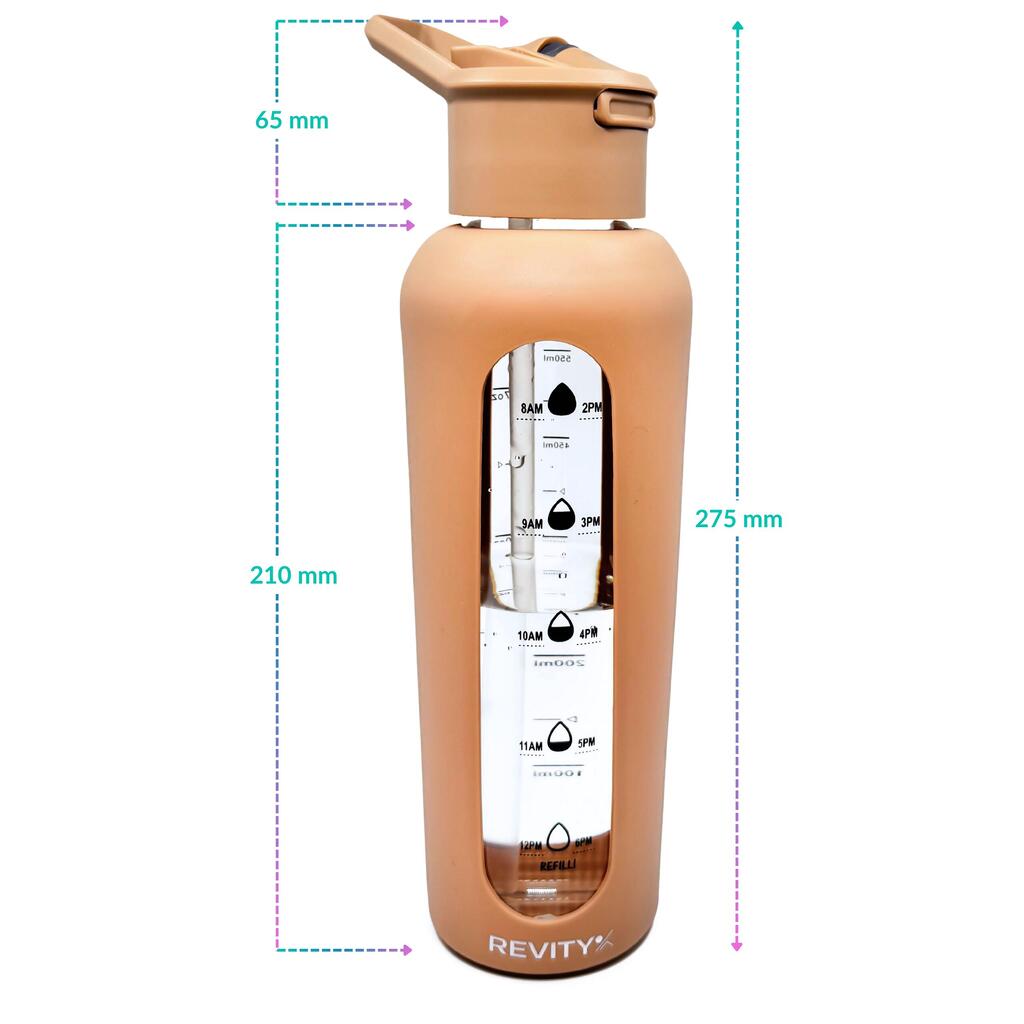 Motivational borosilicate glass sport bottle with time marks: shockproof silicone sleeve, quick-open lid with straw—drink without tilting. BPA-free.