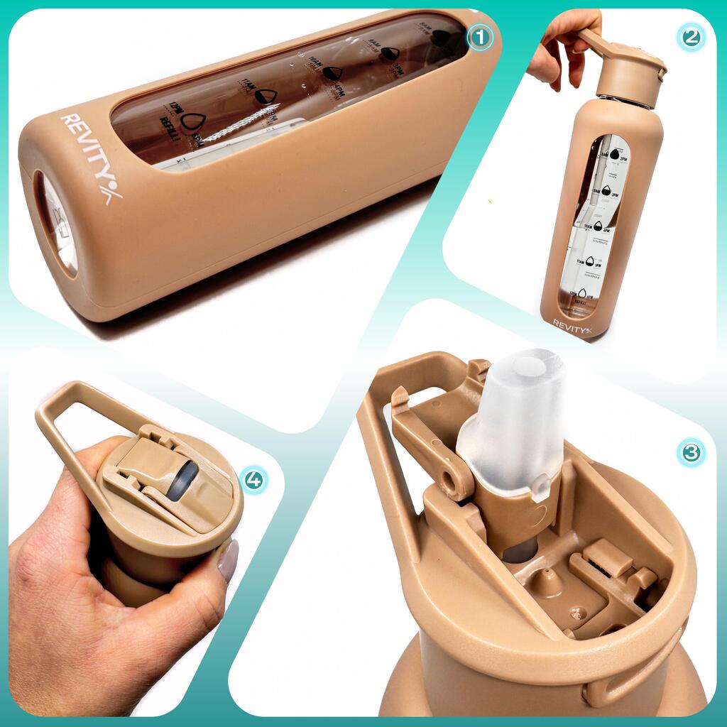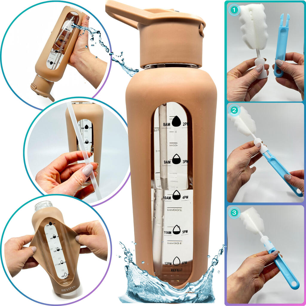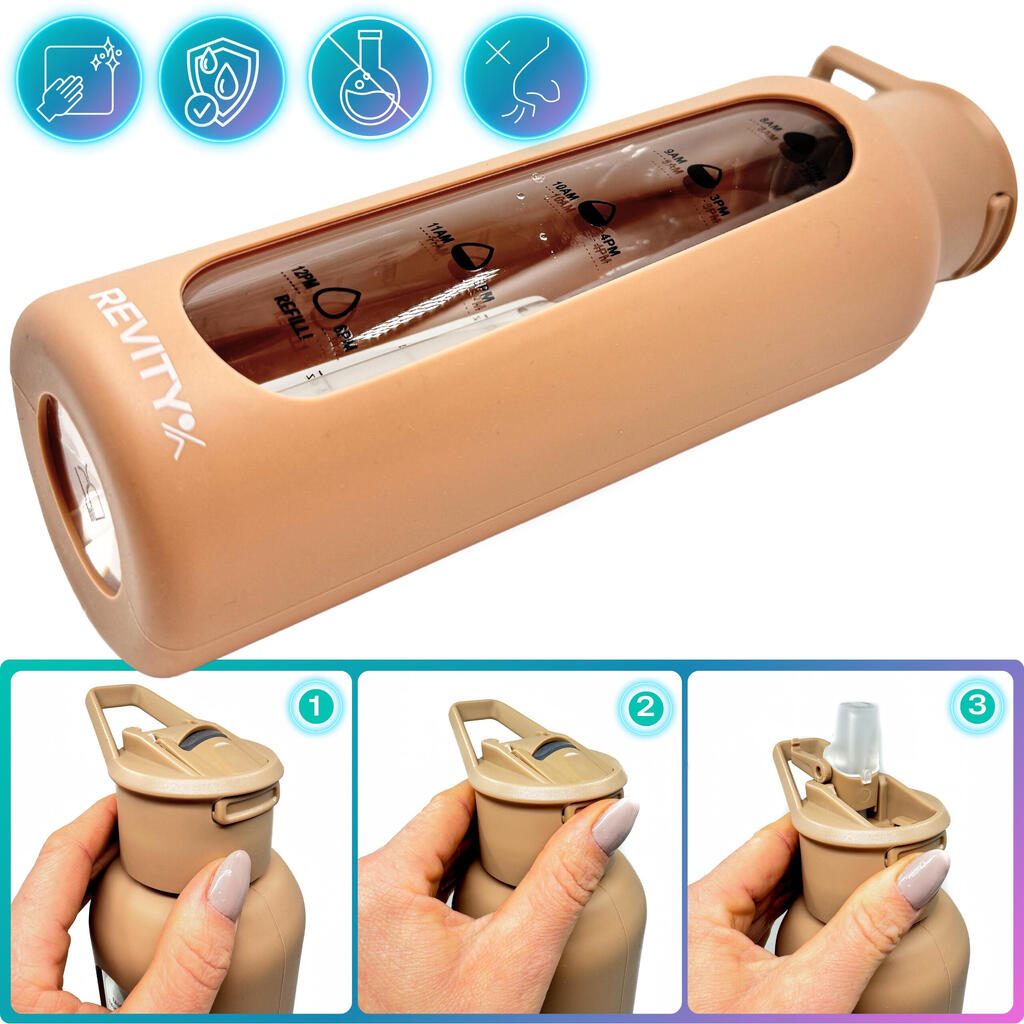 Motivational borosilicate glass sport bottle with time marks: shockproof silicone sleeve, quick-open lid with straw—drink without tilting. BPA-free.