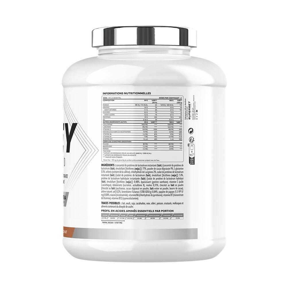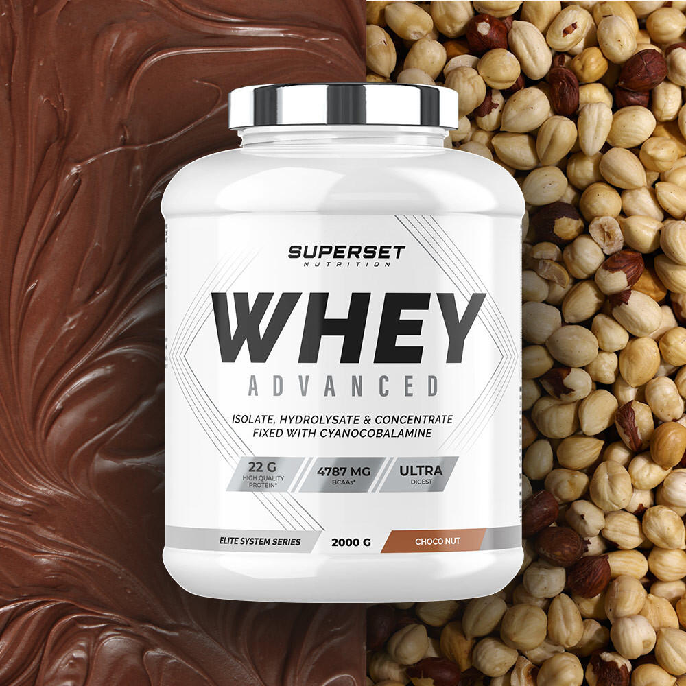 100% WHEY PROTEINE ADVANCED (2KG): Your ally in building lean muscleThis ultra-filtered whey protein, formulated by Superset Nutrition, is designed to help you build muscle. Naturally rich in BCAAs and glutamine, it combines whey concentrate with amino acids from isolate and hydrolysate, providing you with a high concentration of essential nutrients.22g of protein per dose, to help you build muscle.Only 117 kcal.Less than 1.4g of sugars, ideal for building lean body mass.Ultra-filtered formula for improved nutrient purity and assimilation.Rich in BCAA, to support your amino acid needs.2 in 1: Maximum performance and optimized digestion100% WHEY PROTEINE ADVANCED (2KG) has a higher biological value than conventional whey, which may improve your body's utilization of protein. It also contains cyanocobalamin, which helps build red blood cells and maintain normal muscle function...Vitamin B12, to help your sporting performance.Digestive enzymes and prebiotics for digestive comfort.For body-builders, endurance athletes and athletes in the definition phase,But also beginners and advanced athletes looking for an easily digestible whey,Or people concerned about their nutrition. Tasty fragrancesChocolateBanana SplitVanillaChocolate HazelnutStrawberry YogurtCookiesPassion Chocolat BlancStrawberry Mango