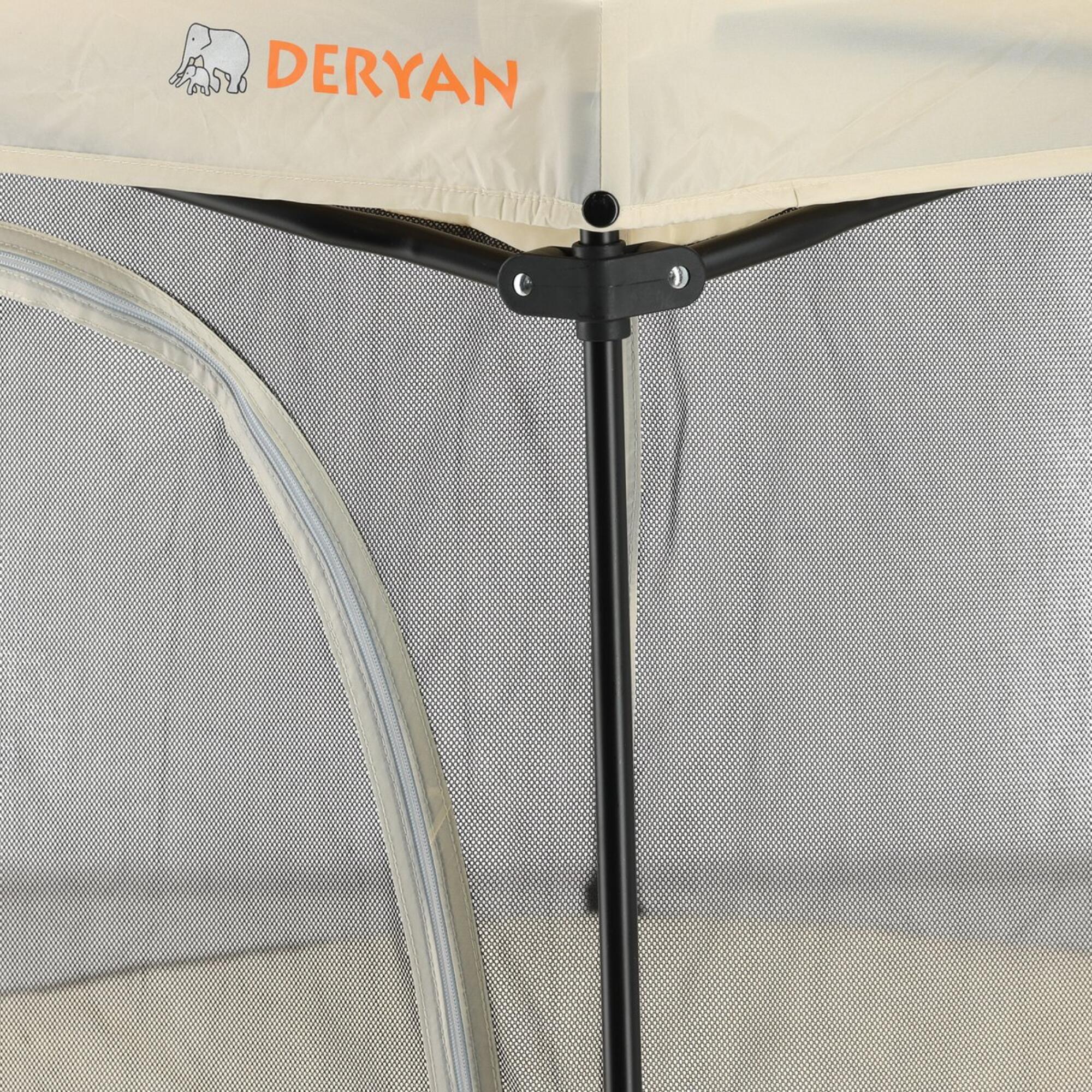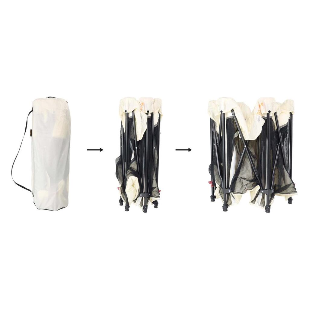A fully closable, spacious, luxury playpen – that’s the DERYAN Up To Go! Safe for your child and incredibly easy to set up and fold down. Who wouldn’t want that? Advantages Fully closable: no insects For children of all ages Secure zipper Removable sunshade Easy to fold in and out Includes pegs and ropes This playpen is perfect for young children of all ages. Thanks to the spacious size of the tent, there is even room for several little ones. The tent is mainly made of polyester and transparent mesh, allowing you to keep an eye on your child at all times – and the other way around. The simple folding system makes this playpen extremely user-friendly. In just two steps, it’s ‘up to go’! The playpen comes standard with a small sunshade, which is easy to attach. It also includes pegs and ropes to ensure even greater stability. Specifications Color: black – sand Folded dimensions: 14.5 x 14.5 x 89 cm Unfolded dimensions: 150 x 170 x 125 cm Weight: 2.5 kg