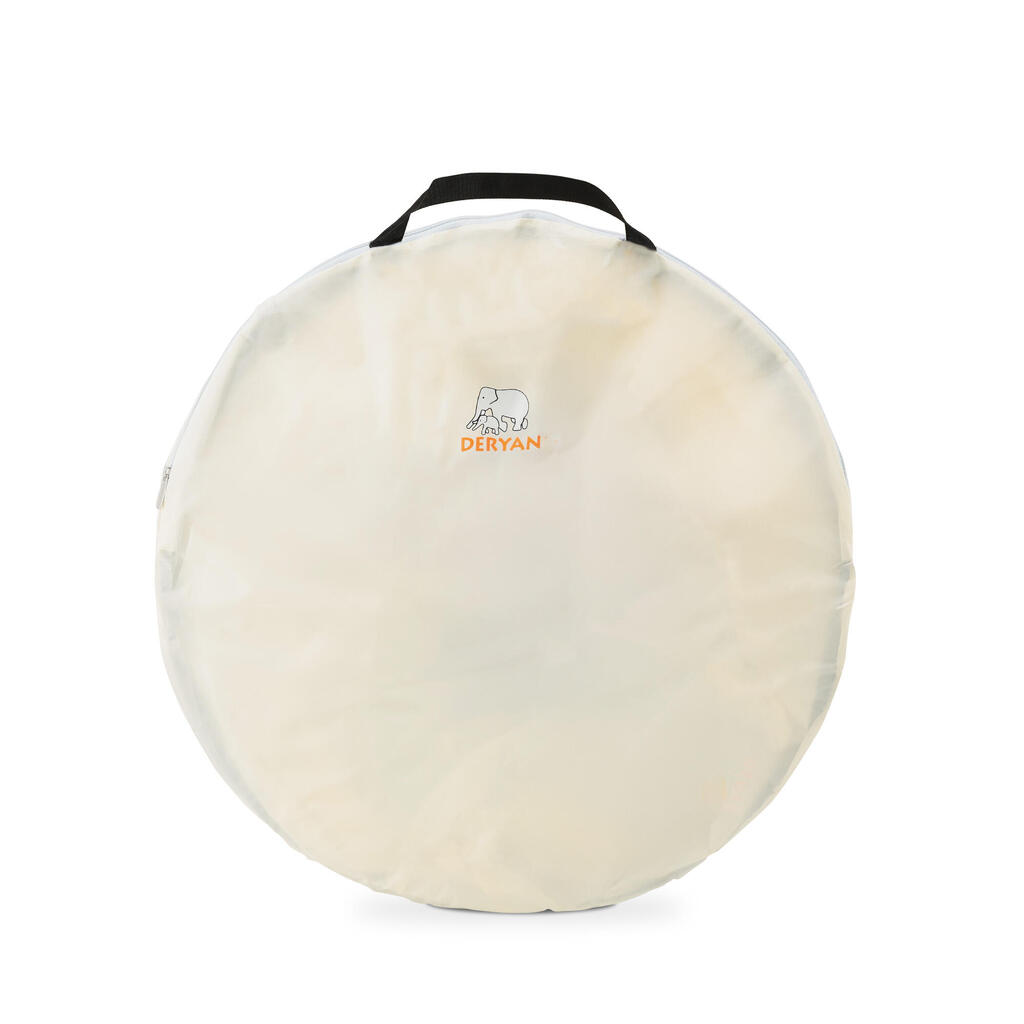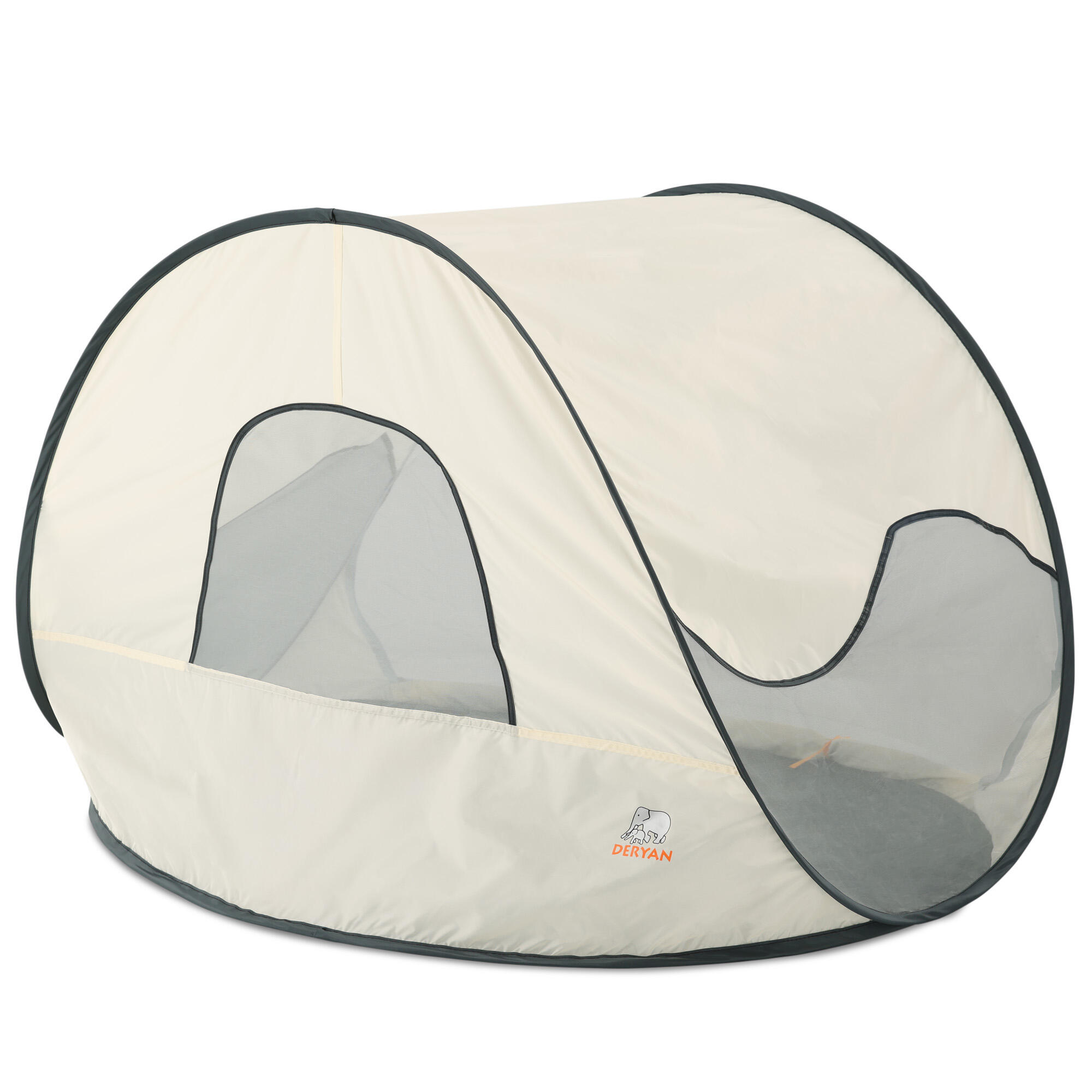 **Protect your child from the sun with the Deryan Beachtent** The DERYAN Beachtent is a handy tent that protects your child at the beach, camping or when travelling from the sun/UV rays. Folding the DERYAN Beachtent is almost as easy as unfolding it; in just a few seconds, the DERYAN pop-up principle allows you to fold the Beachtent in a flash. **Advantages** - Pop-up system - 2 seconds - 50% UV protection - Compact & lightweight **Ideal to carry, packed and unpacked in 2 seconds** It is quick to set up and fold together. Besides being lightweight, the Deryan Beachtent offers extra protection from wind and sand. The Beachtent contains a sloping shape, allowing it to be positioned well into the wind. There is also a mesh window at the back of the tent, which can be closed if required. At the back of the tent, there are loops for securing the DERYAN Beachtent with pegs, as well as pockets to optimise its sturdiness with sand. The Beachtent is easy to carry with the handy carrying bag. **Product specifications:** Content: Beach tent, two pegs and carrying bag Material: Polyester Weight: 1.0 kg Dimensions unfolded (l x w x h): 120 cm x 90 cm x 100 cm Dimensions folded (l x w x h): 45 cm x 45 cm x 5 cm Features: Fire-resistant, 50% UV-protective