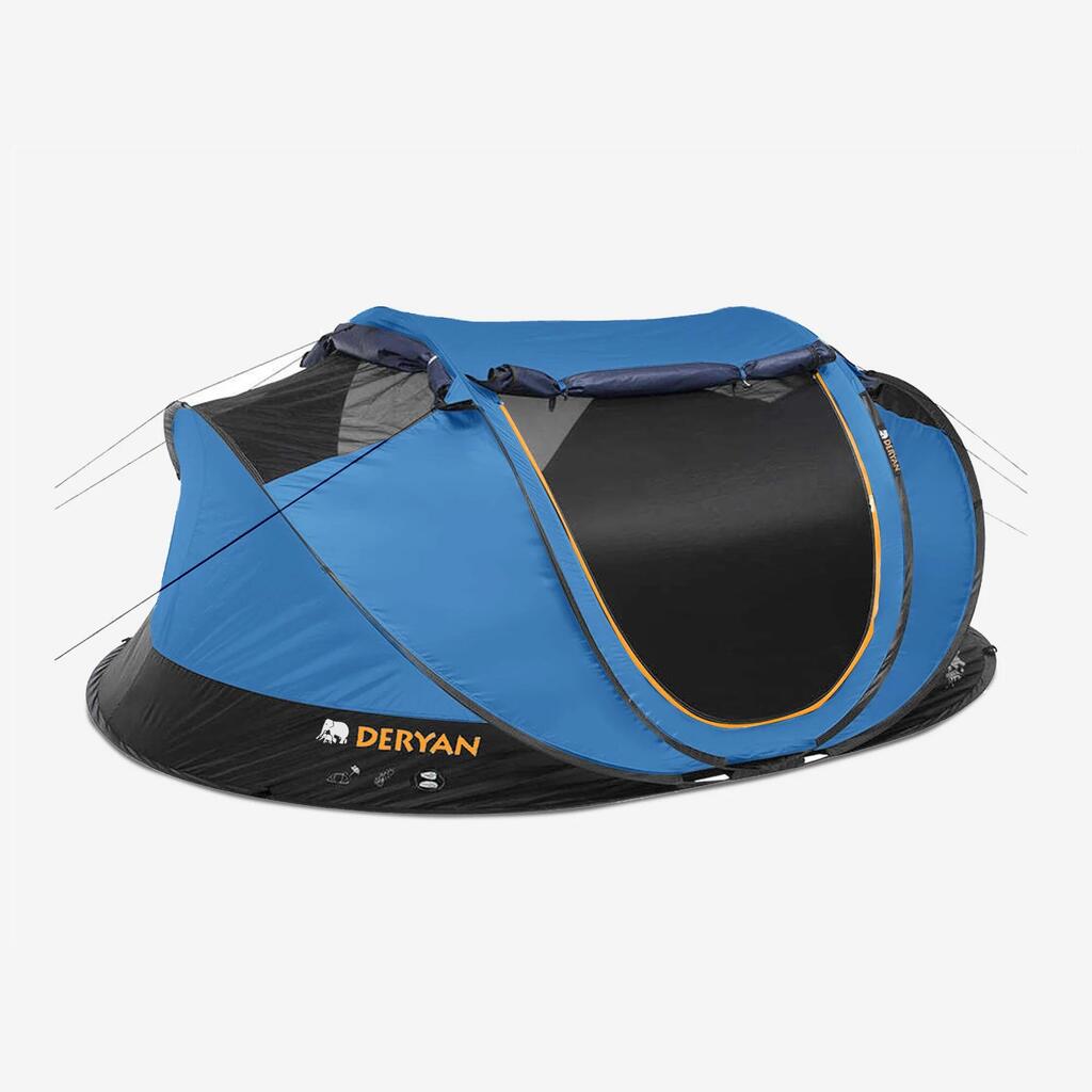 **Camping has never been so effortless with the DERYAN Pop-Up Cocoon!** In just 2 seconds, this spacious tent is ready for use—no hassle with poles. Lightweight and compact, it's ideal for any occasion. It also folds down in seconds, making it perfect for travel! **Advantages:** ✓ Quick Setup: The pop-up system sets up the tent in seconds, giving you more time to enjoy your adventures. ✓ Compact & Portable: Easy to store in the carry bag and perfect for travel—whether on holiday, a weekend getaway, or a festival. ✓ Room for 2: Spacious enough for 2 people, offering comfort and ease during all your camping trips. ✓ Waterproof: 2000 mm water column rating and sealed seams with special tape. ✓ Dual Light-Blocking Fabric: The interior features a double layer that blocks out light and sun for a cool and dark tent. **Product specifications:** - Color: Navy - Tent size: 230 x 145 x 100 cm - Packed size: Ø 90 cm - Capacity: 2 persons - Outer material: 190T Polyester, PU 2000 mm - Bottom material: 210D Oxford, PU 2000 mm - Frame material: Fiberglass Ø 6 mm - Includes pegs and ropes