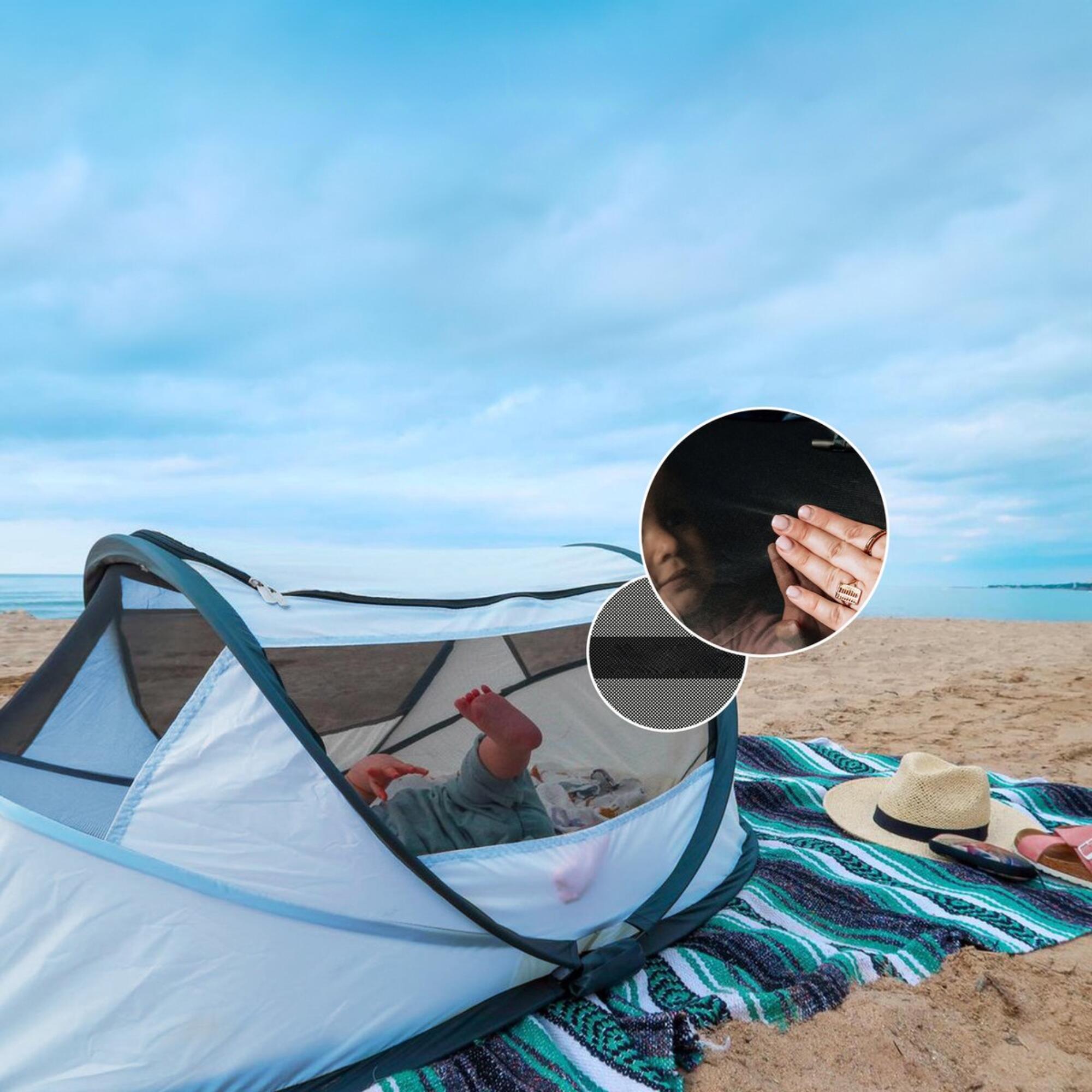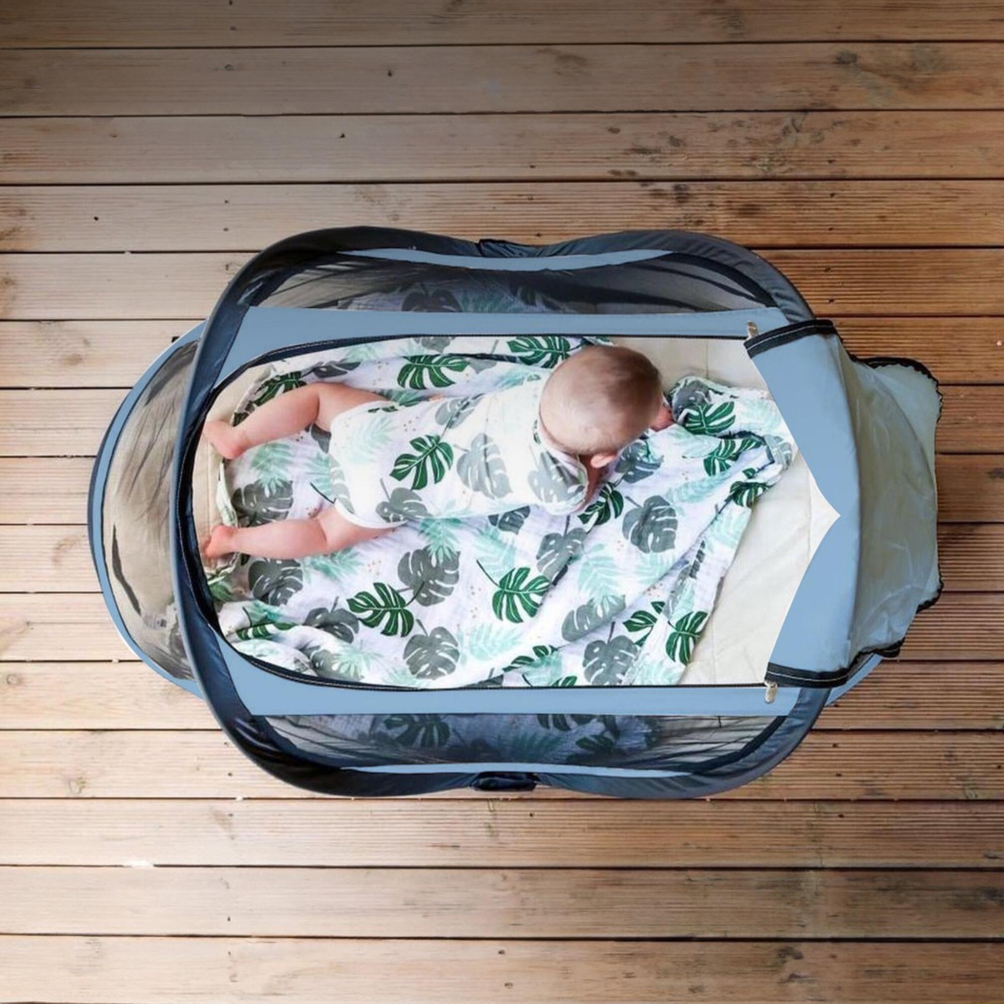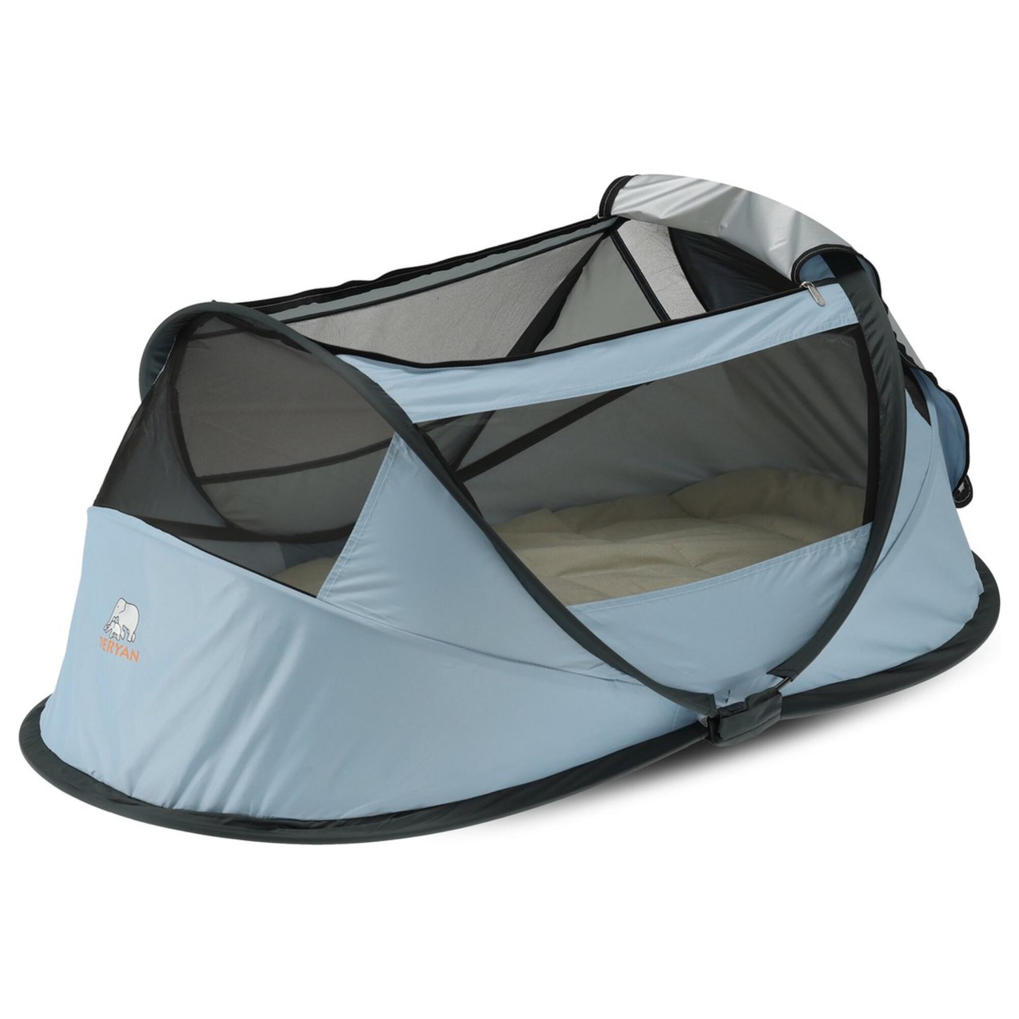 **The DERYAN Baby Box is the perfect replacement for the heavy camping bed. With its 1.5 kg, you can easily take it with you on holiday, on a visit, to the park, etc.** **Advantages** ✓ Comfortable & lightweight ✓ Easy to take with you ✓ Pop-up system – set up in 2 seconds! ✓ 50% UV protection ✓ Keep insects away from your child This camping bed comes with an underblanket and a handy carrying bag. The bed is suitable for children from 0 to approximately 2 years old. User-friendliness and quality are of paramount importance to the DERYAN family. The materials with which the DERYAN Baby Luxe is made are fire-retardant and 50% UV-resistant. Thanks to the handy and very strong mesh, which is smaller than 1 mm, the DERYAN Baby Luxe keeps out all mosquitoes and other insects. An additional advantage is that it provides excellent air ventilation. **Product specifications** - Suitable from 0 to approximately 2 years. - Weight +/- 1.5 kg - Dimensions unfolded: 76 x 46 x 117 cm - Dimensions folded: 36 x 36 x 10 cm **What's in the box?** - Baby Box camping bed - Cotton mat - Carrying bag
