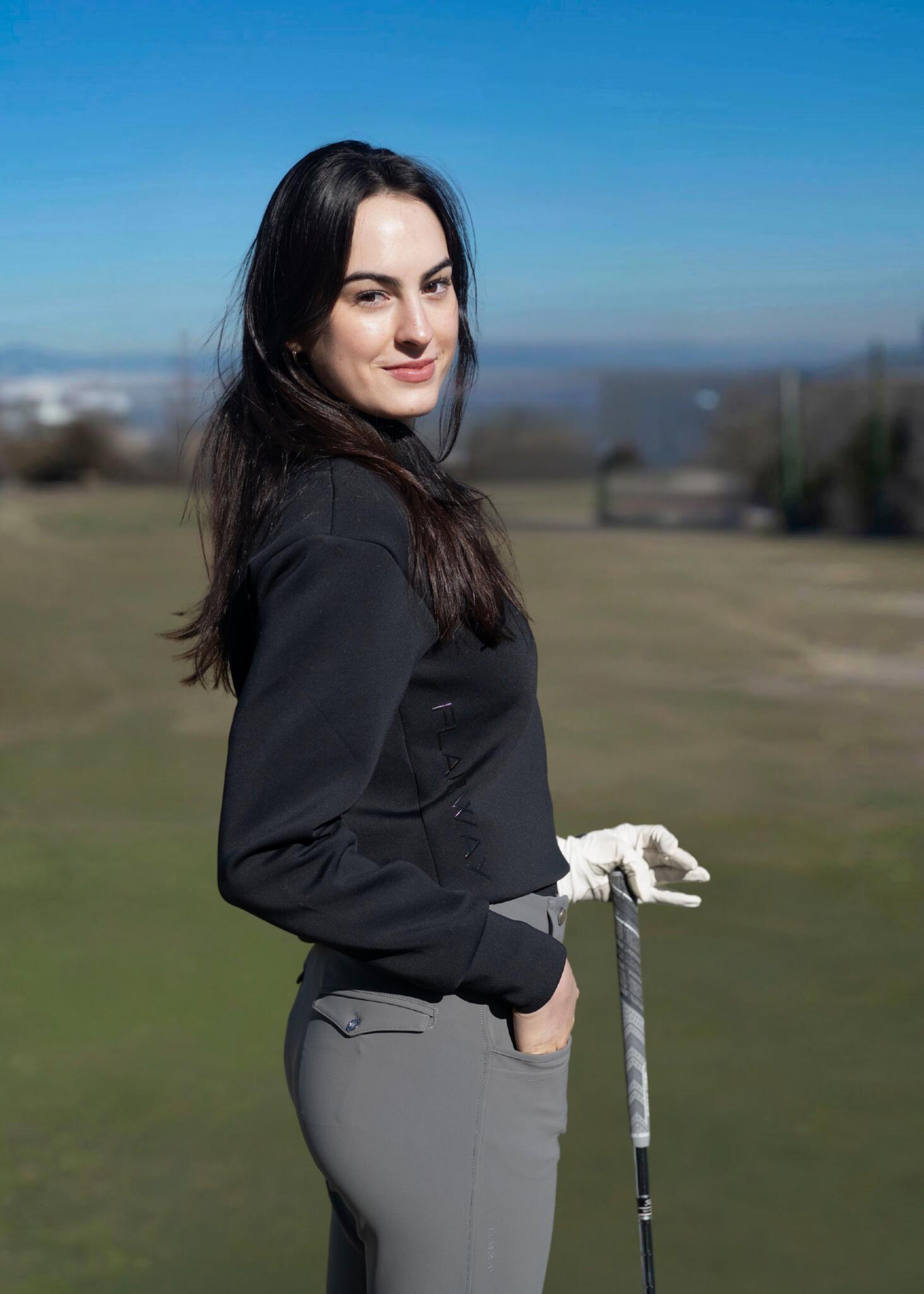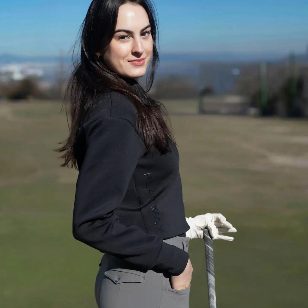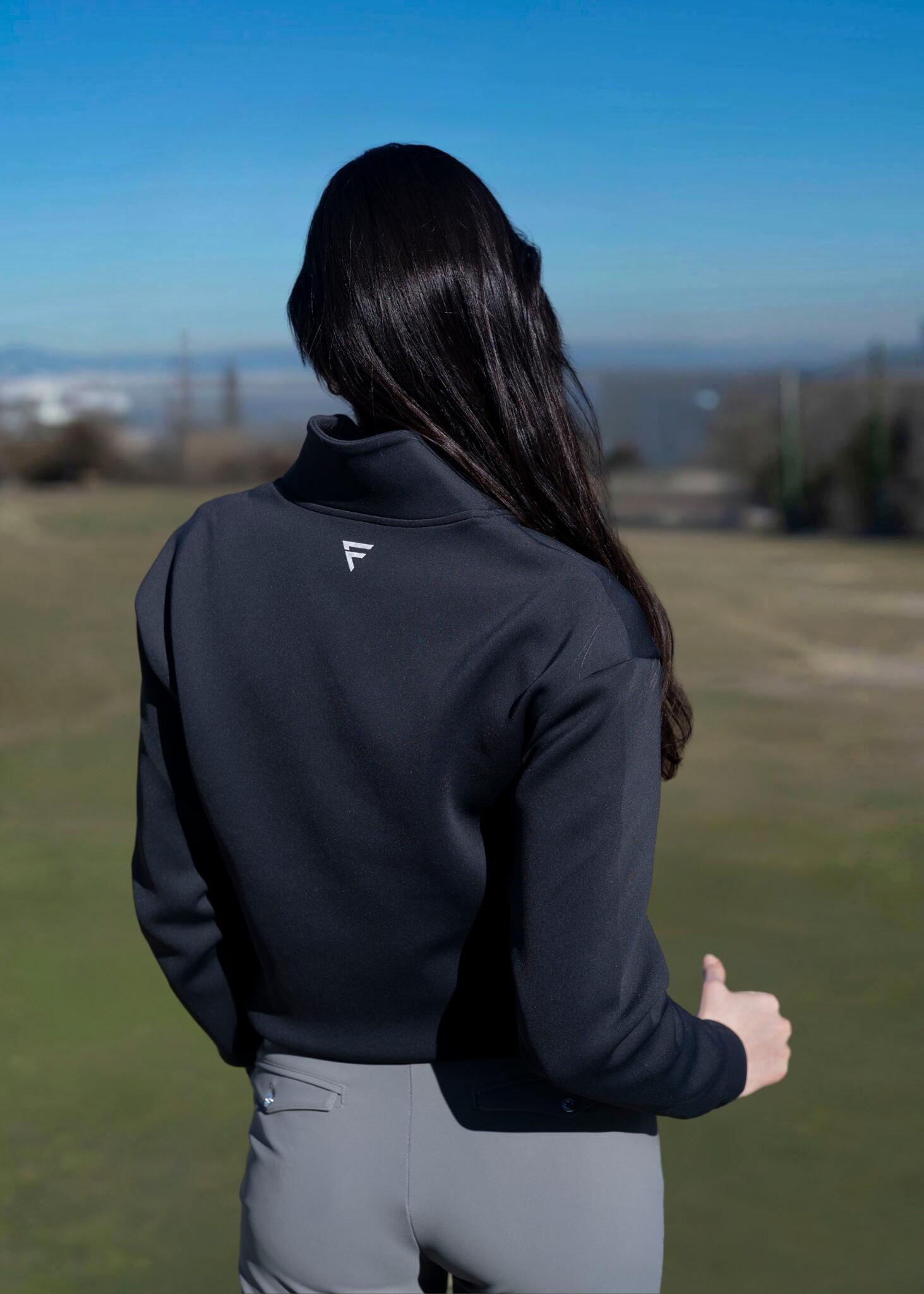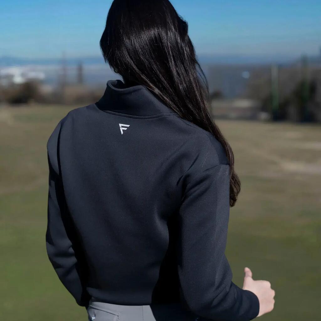 A buttery-soft women’s golf sweater with a sleek quarter zip, stretchy athletic fit, hidden pocket, and quick-dry breathable fabric. Flattering, versatile, and built for confident performance on every