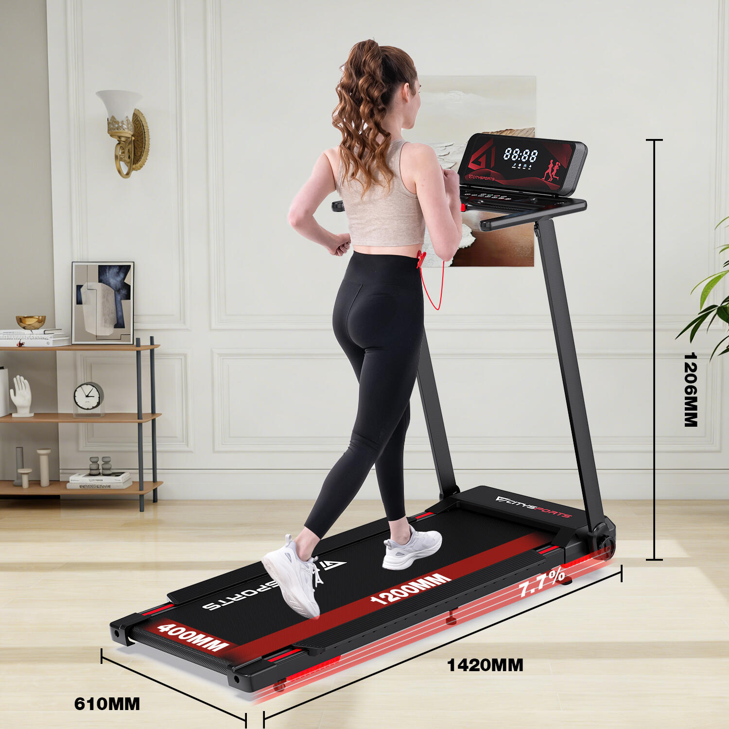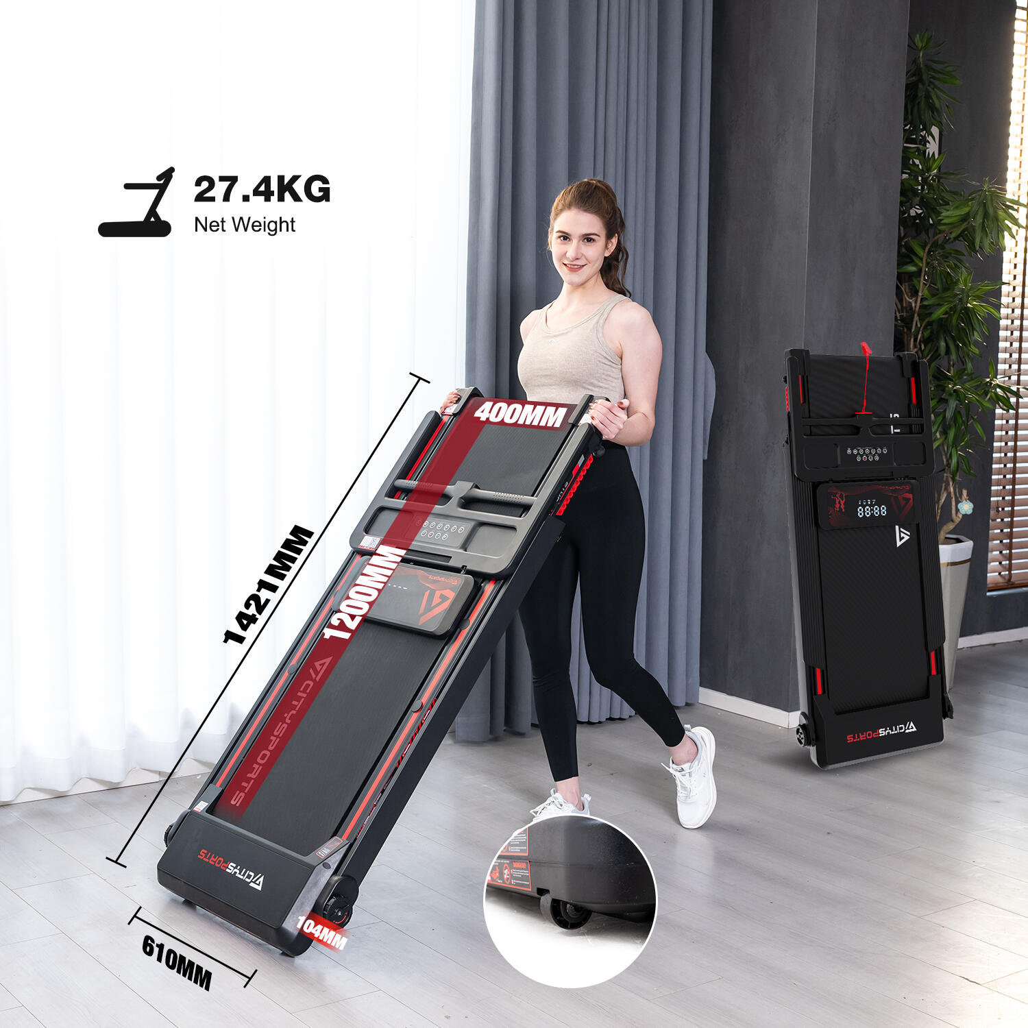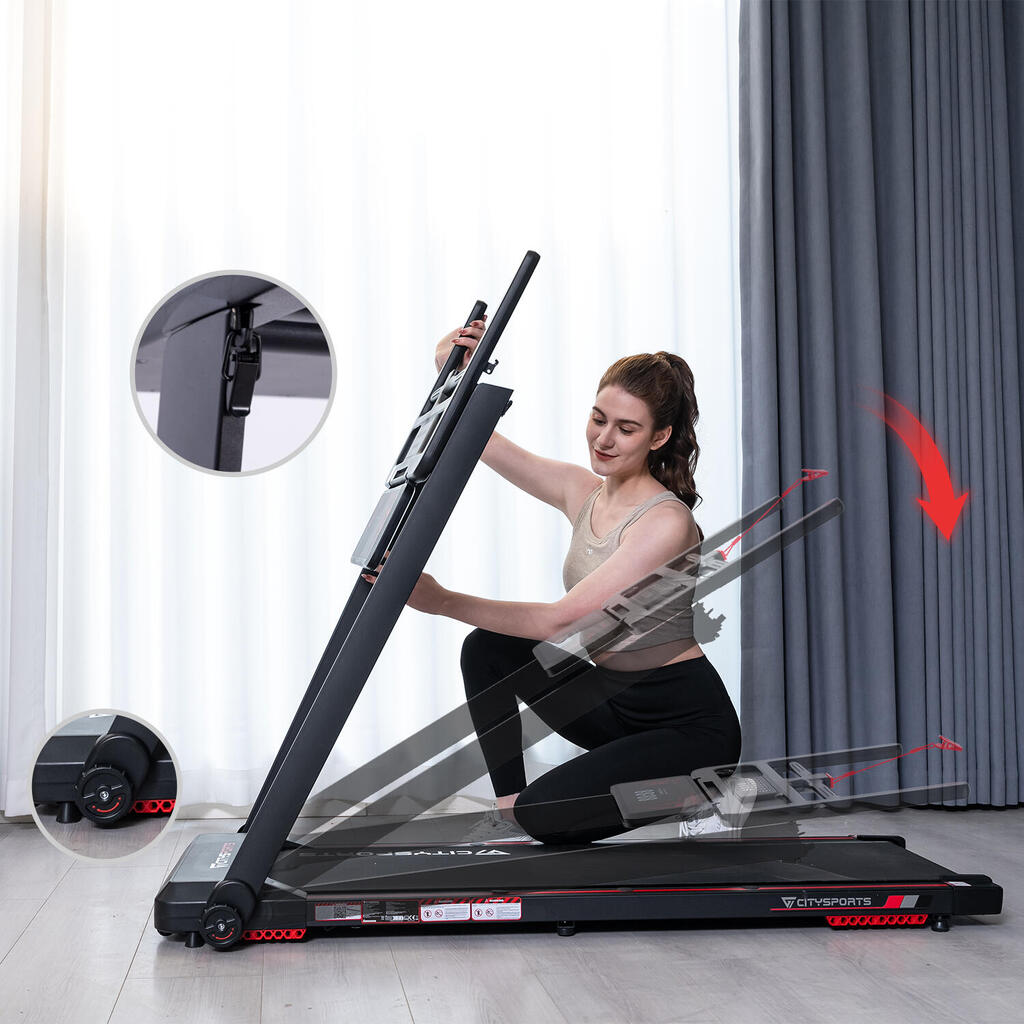 Foldable treadmill with 7.7% incline. 1400W motor, speed up to 12 km/h. Bluetooth App connectivity, safety lock, and transport wheels.