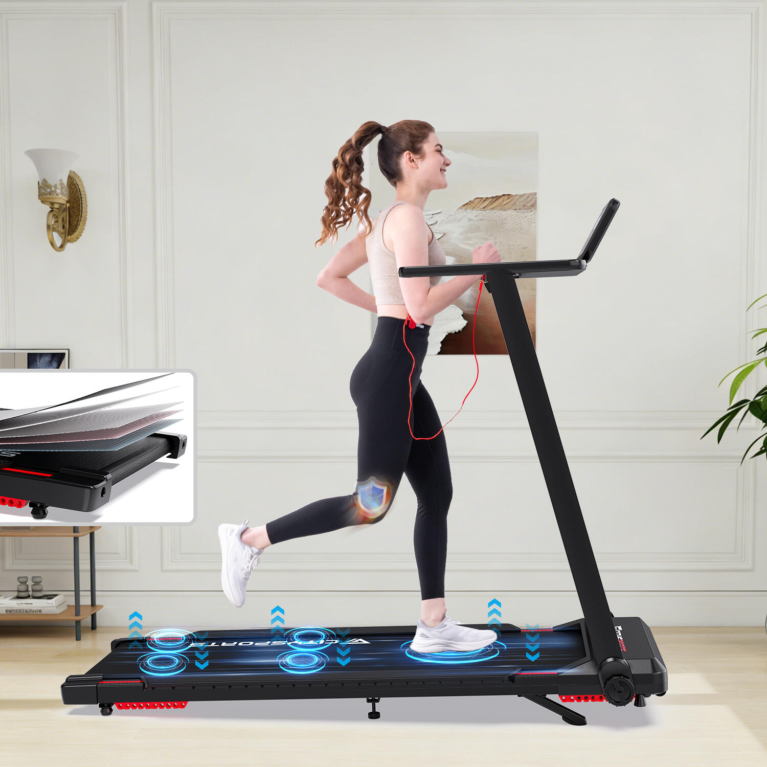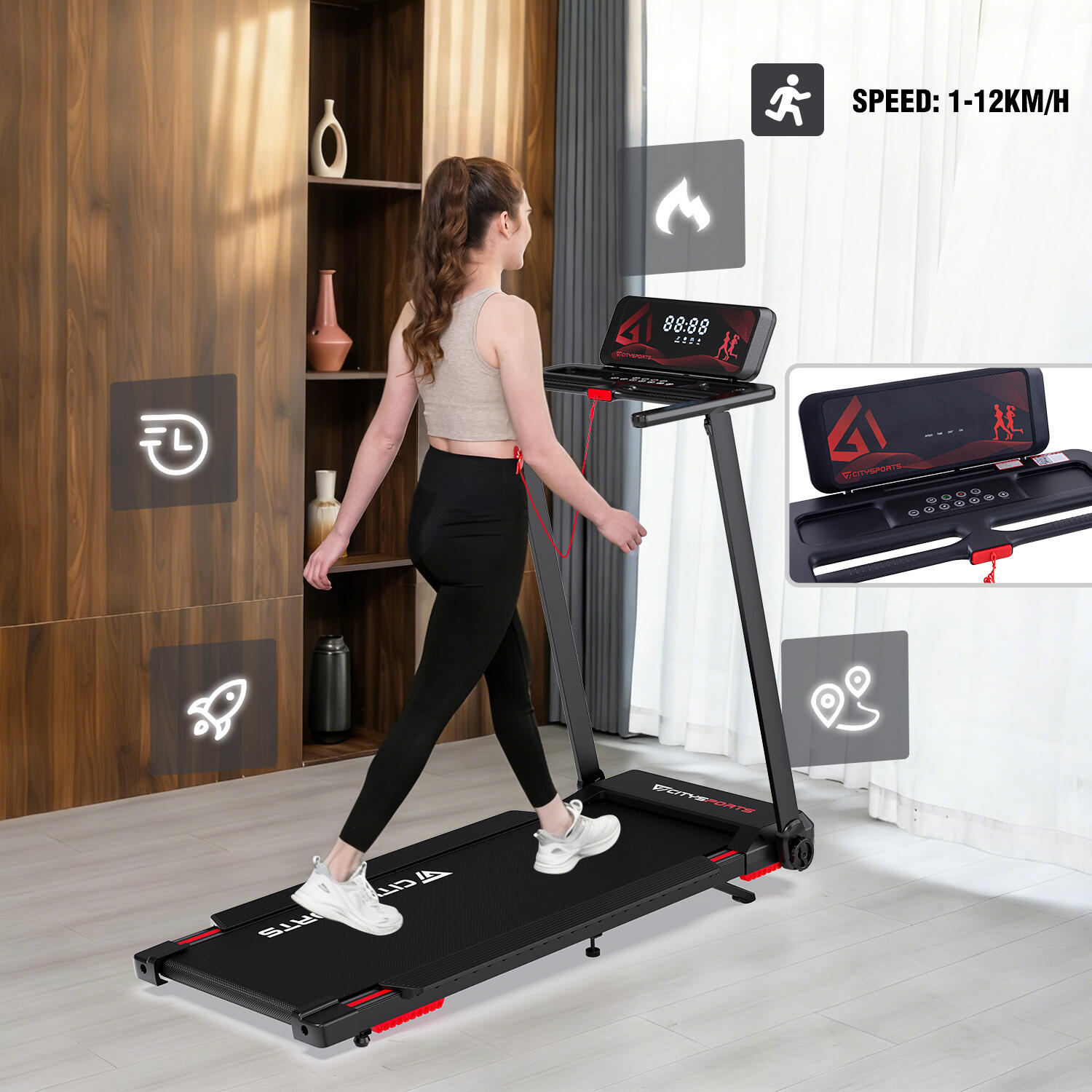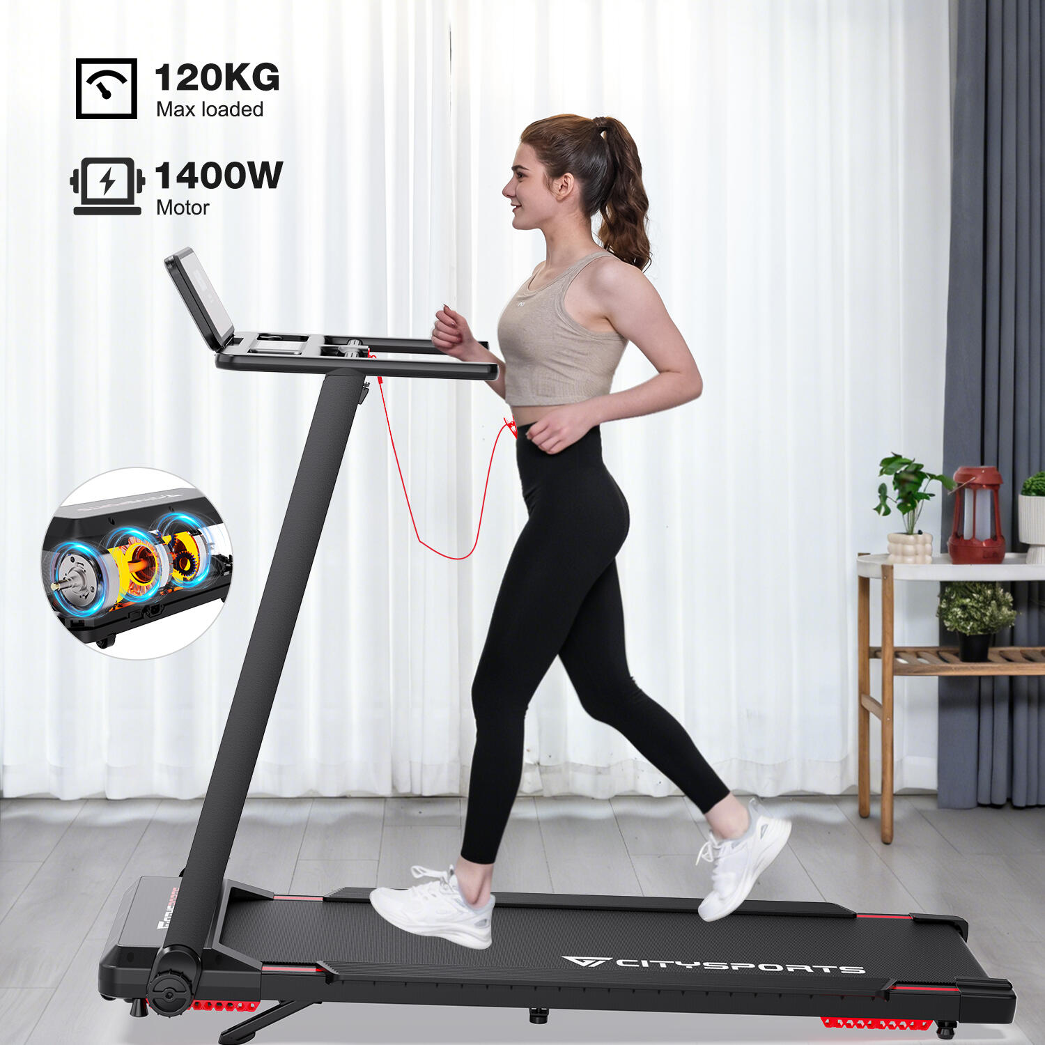 Foldable treadmill with 7.7% incline. 1400W motor, speed up to 12 km/h. Bluetooth App connectivity, safety lock, and transport wheels.