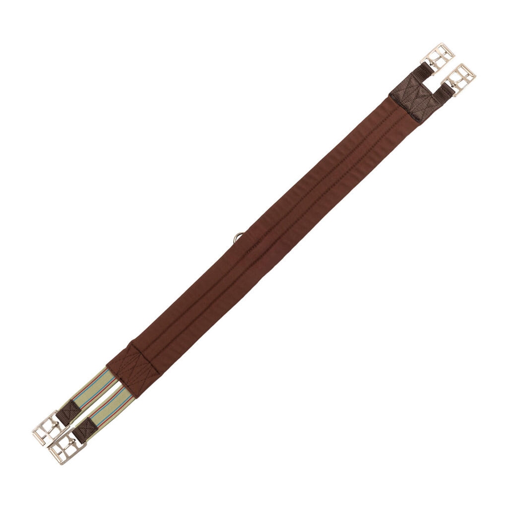 English riding girth in fabric with elastic bands, stainless steel buckles and central ring.