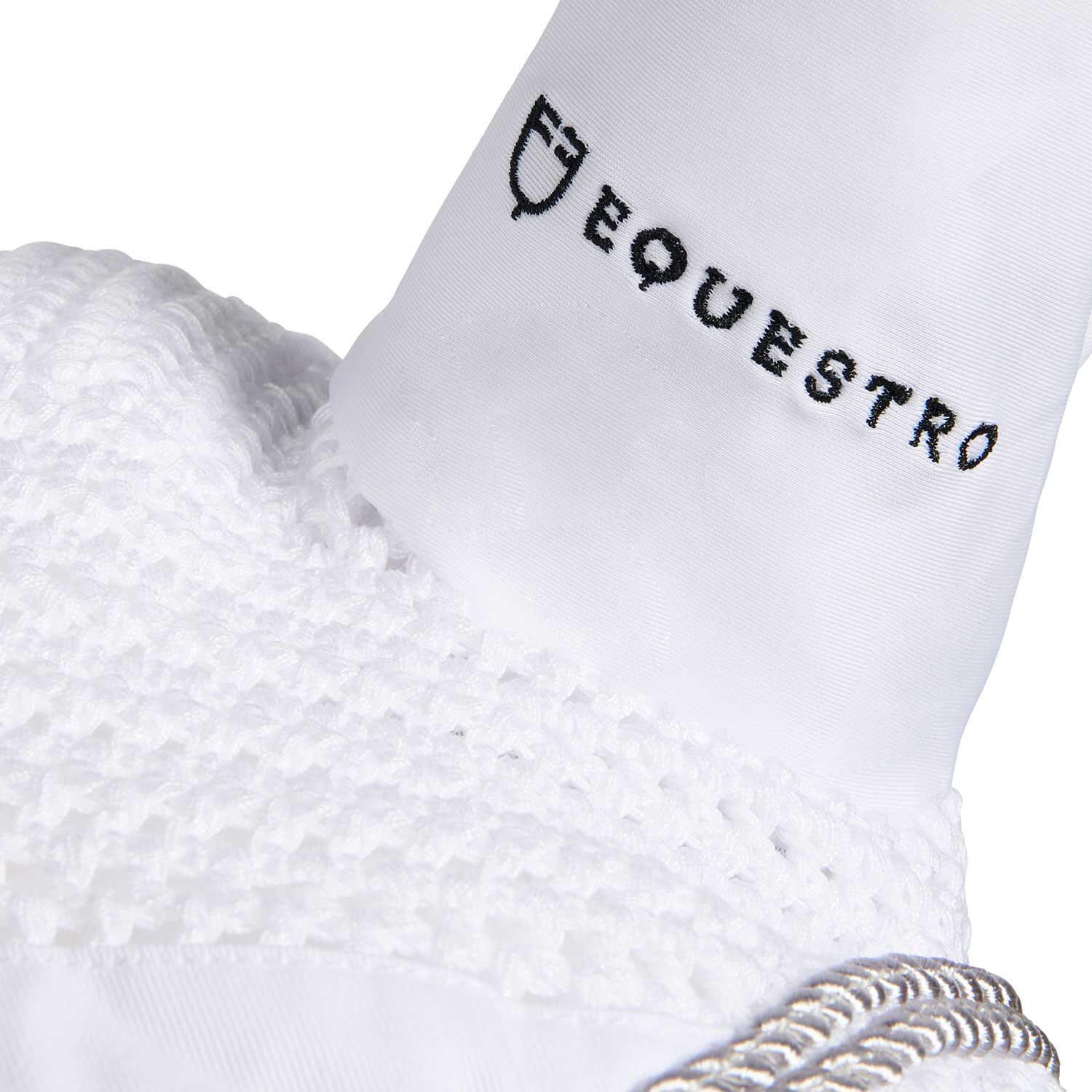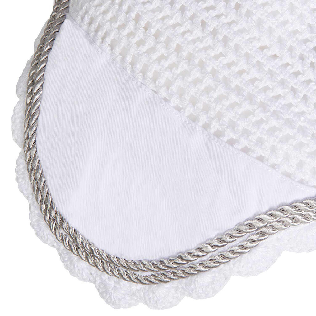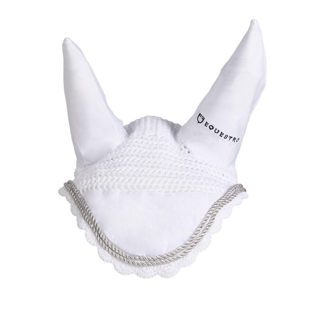 Knitted and lycra fly veil, coordinated with saddle pad and designed to protect the horse's ears from insects and noise.