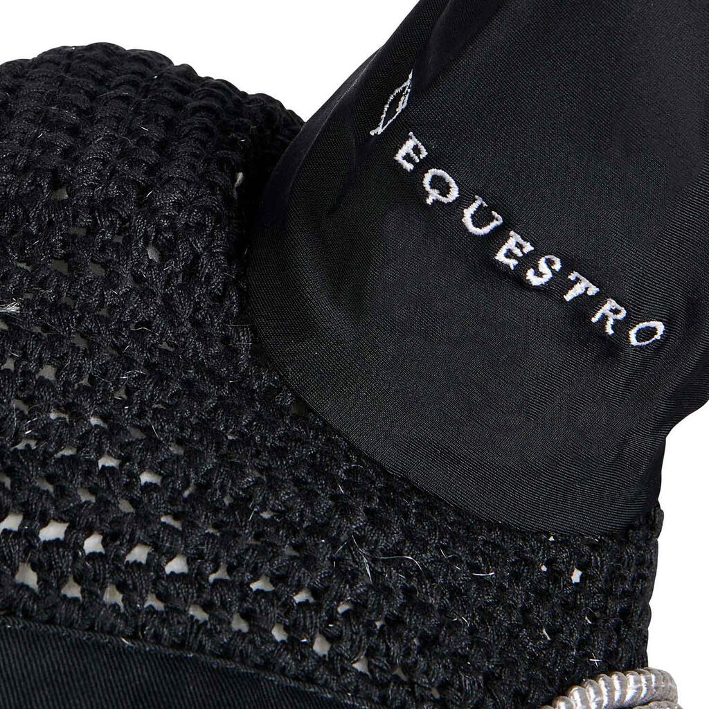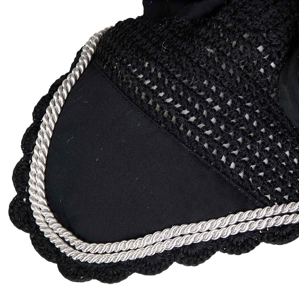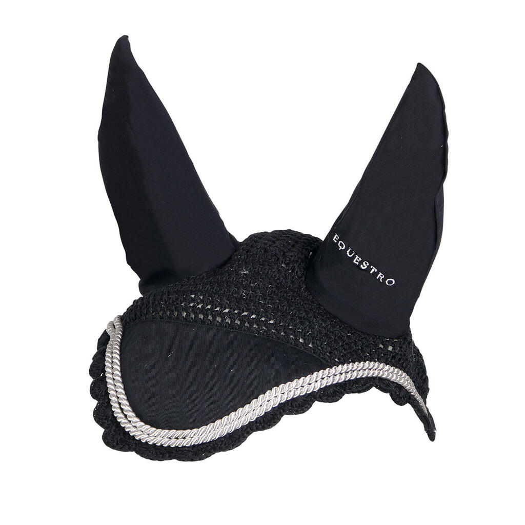 Knitted and lycra fly veil, coordinated with saddle pad and designed to protect the horse's ears from insects and noise.