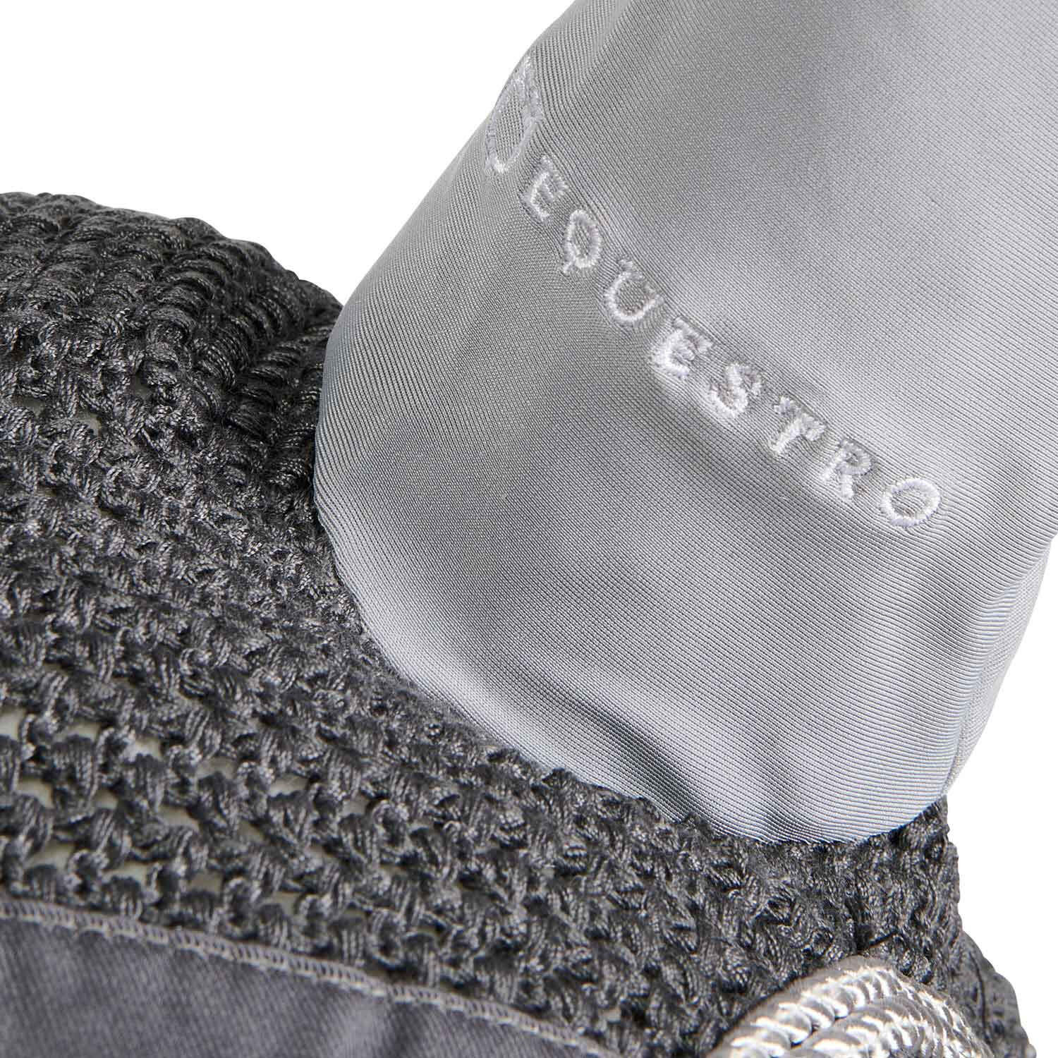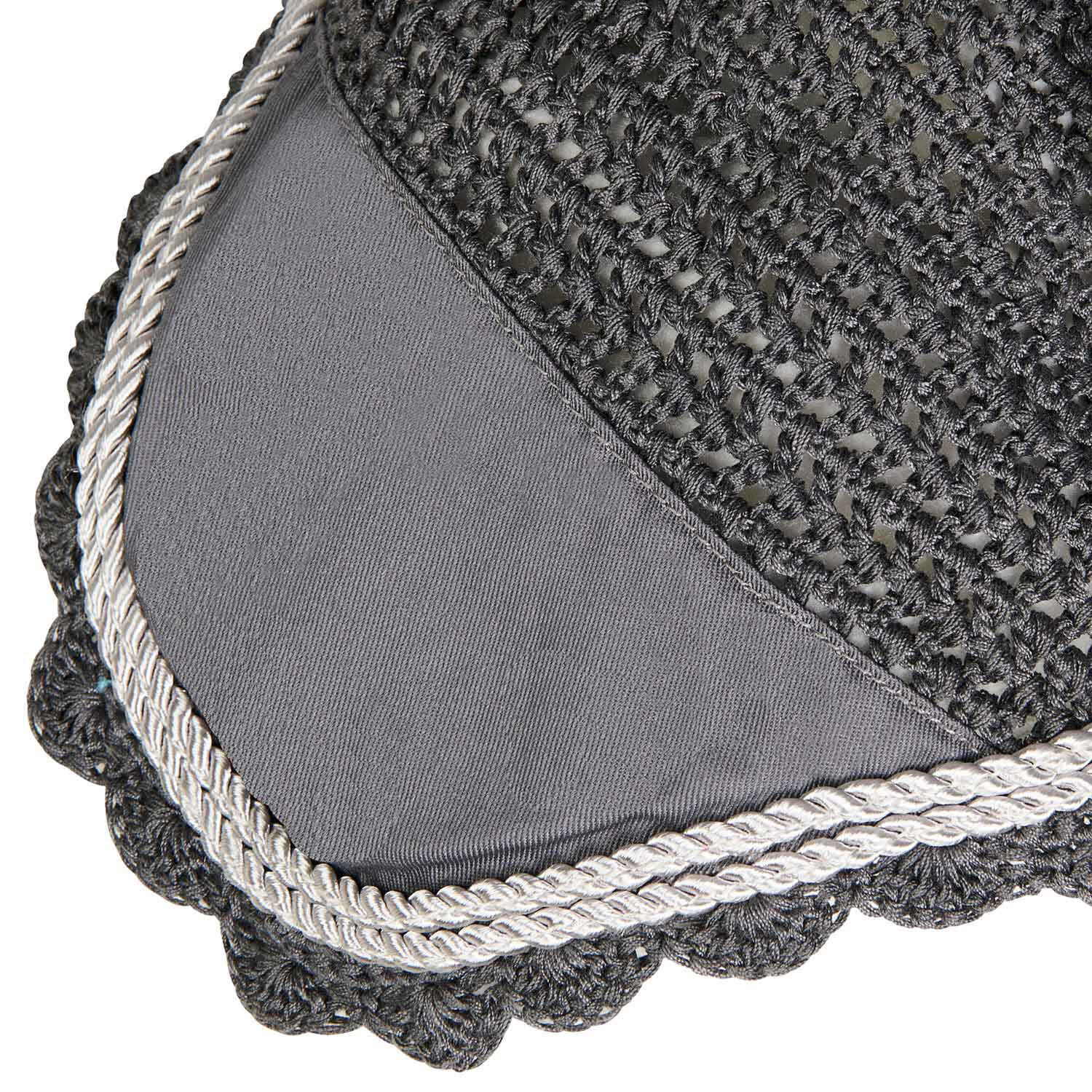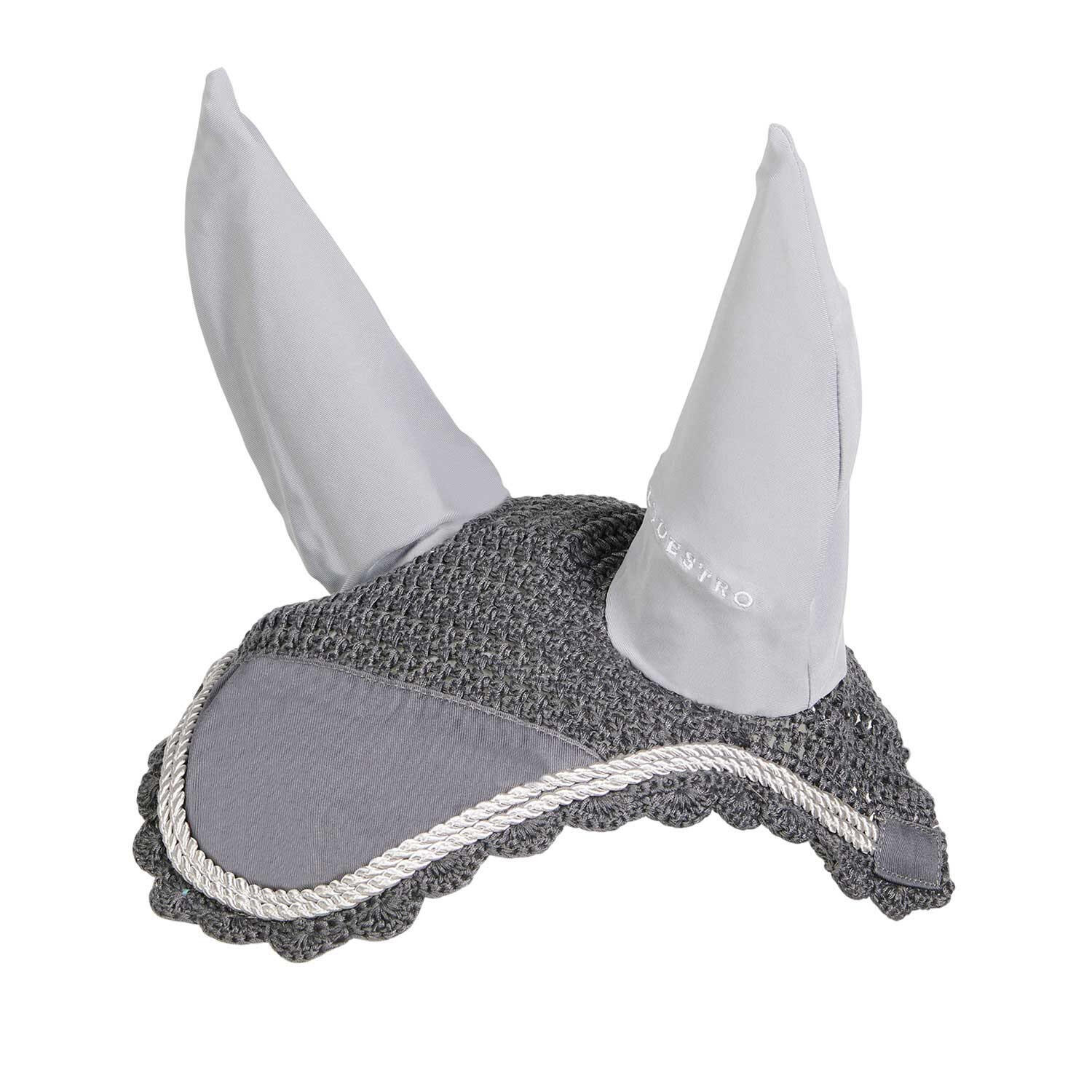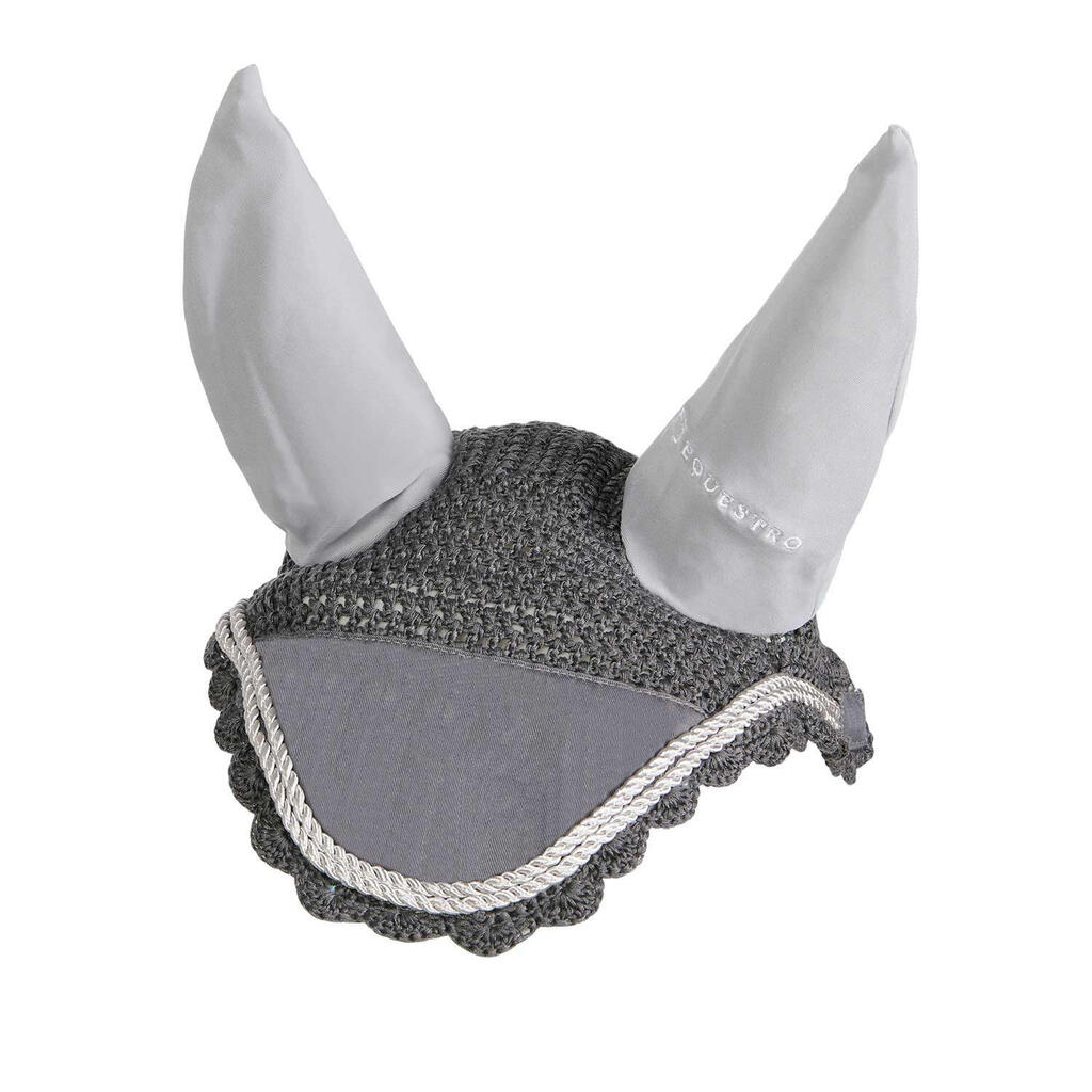 Knitted and lycra fly veil, coordinated with saddle pad and designed to protect the horse's ears from insects and noise.