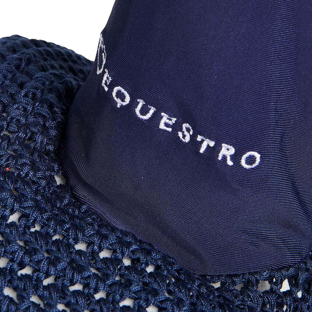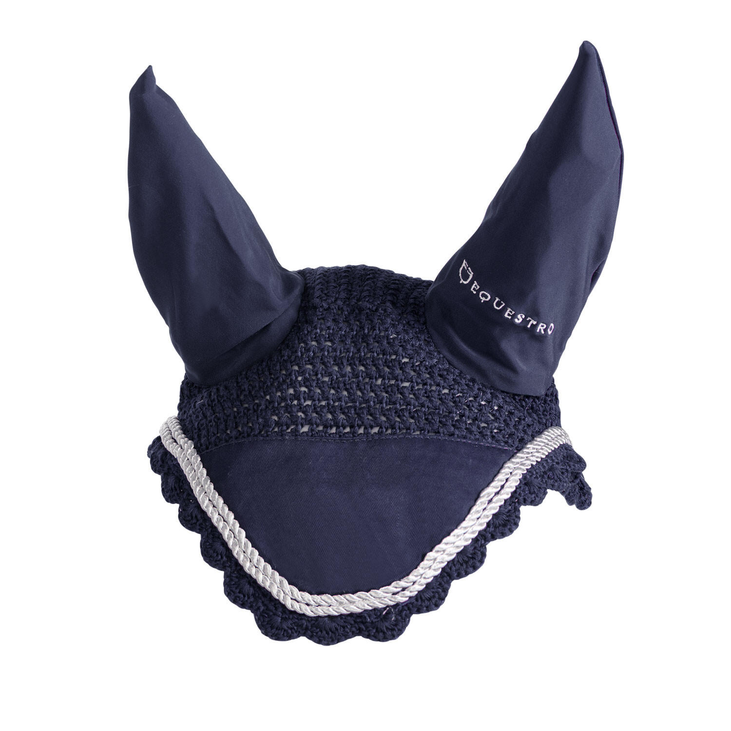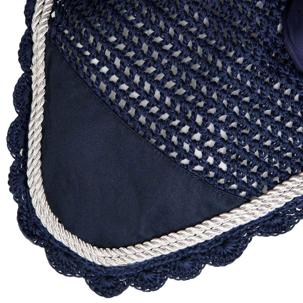 Knitted and lycra fly veil, coordinated with saddle pad and designed to protect the horse's ears from insects and noise.