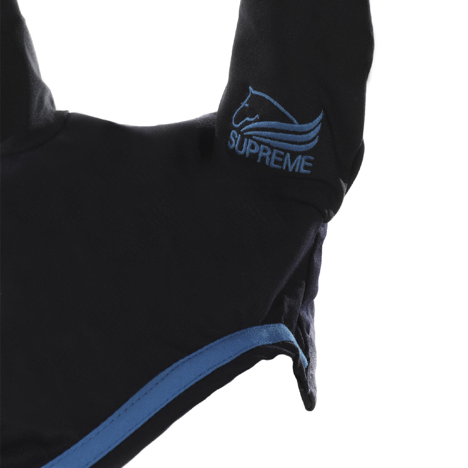 Pony fly veil in soft cotton with contrasting piping. It guarantees an excellent fit and maximum comfort.