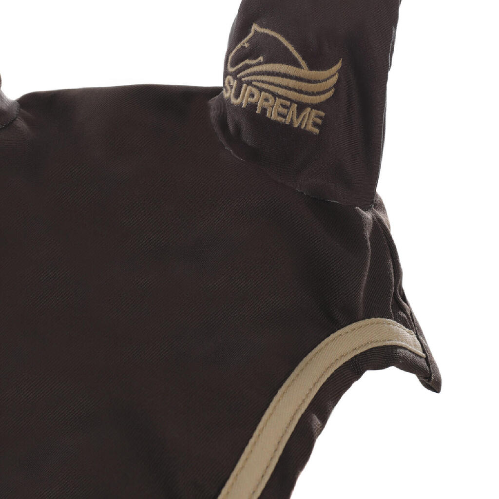 Pony fly veil in soft cotton with contrasting piping. It guarantees an excellent fit and maximum comfort.