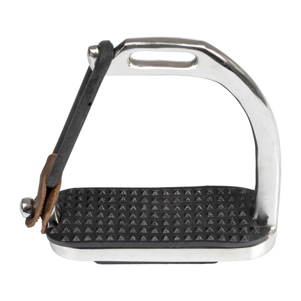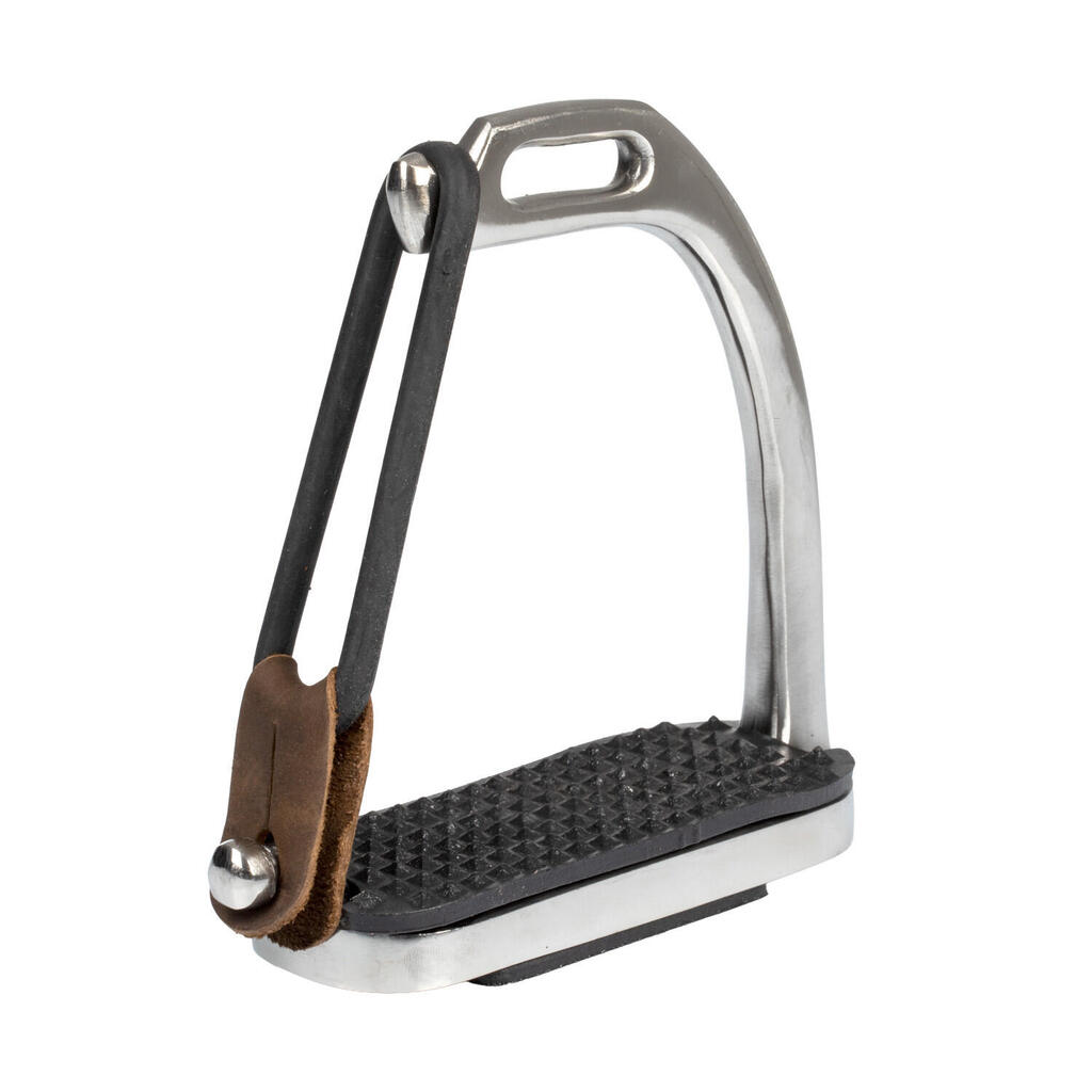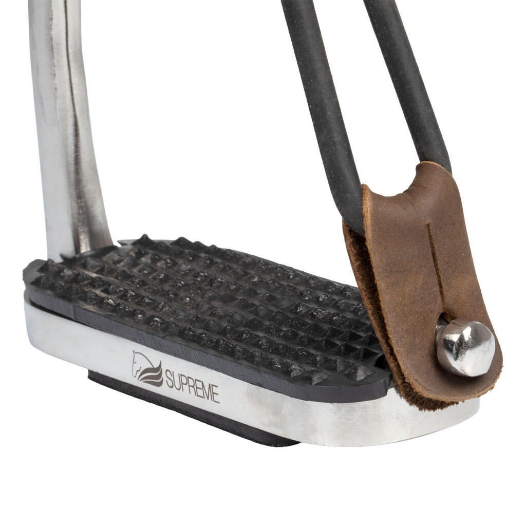 Stainless steel stirrups with side safety elastic, to prevent the foot from getting trapped in the event of a fall.