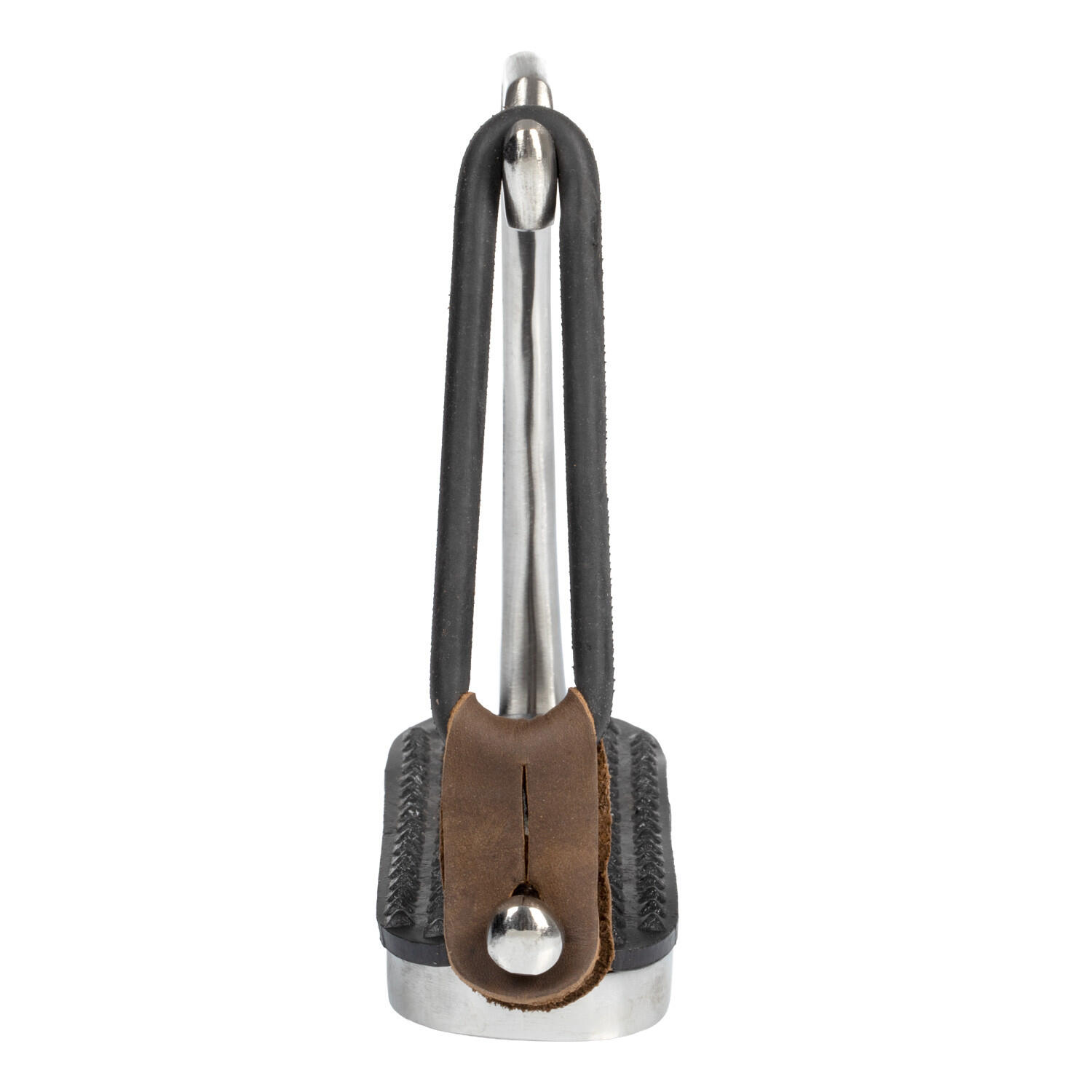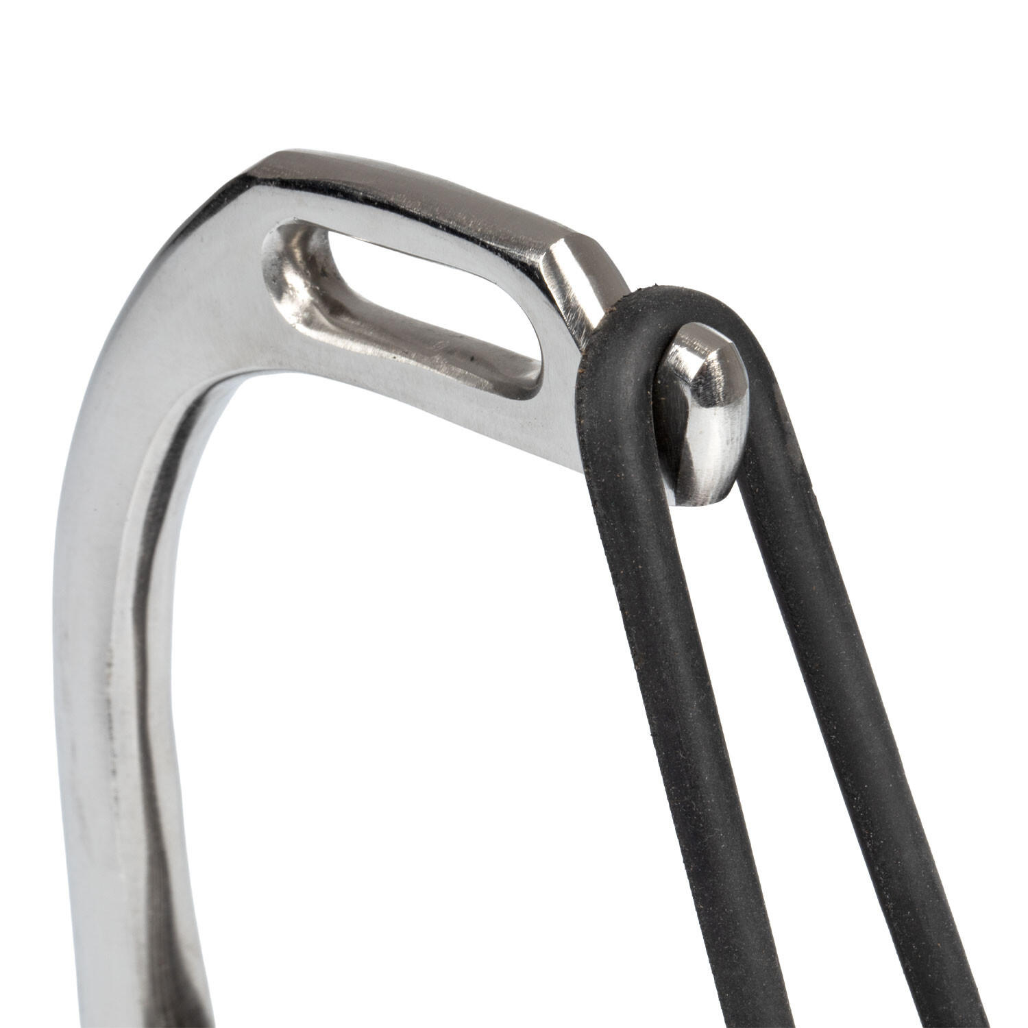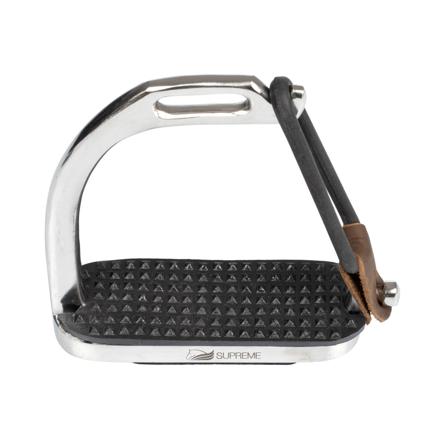 Stainless steel stirrups with side safety elastic, to prevent the foot from getting trapped in the event of a fall.