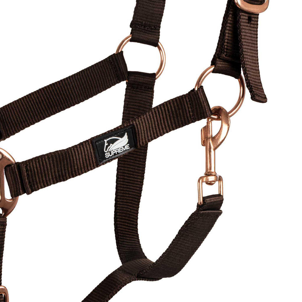 Double nylon halter with neoprene reinforcement and rose gold buckles. Complete with lead rope.