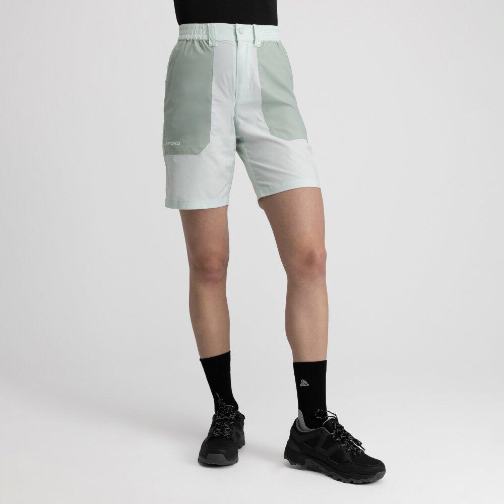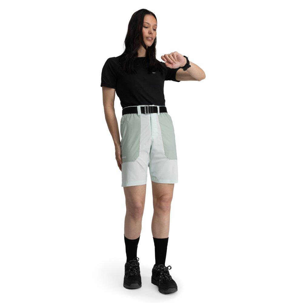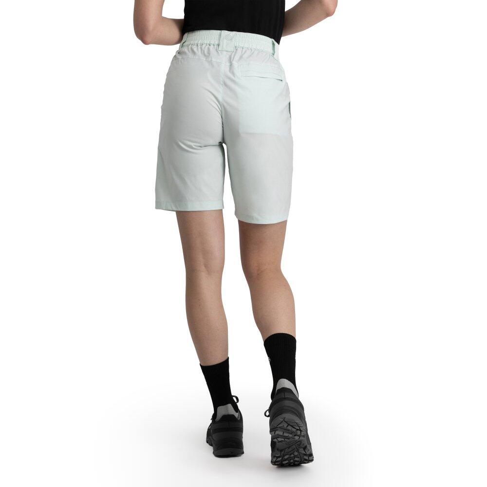 Solara Mint women's hiking shorts in green, lightweight and stretchy with fluorocarbon-free DWR water-repellent finish, elastic waistband and three zip pockets for trekking and outdoor activities.