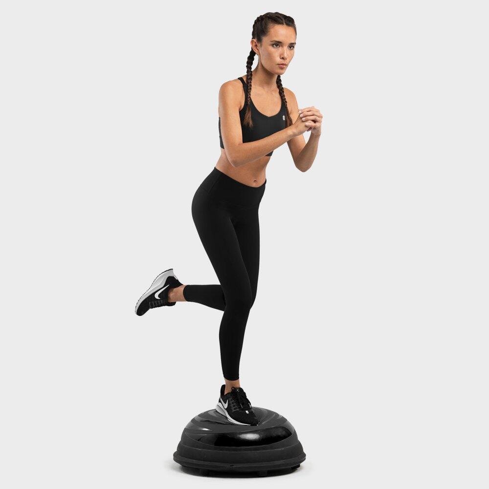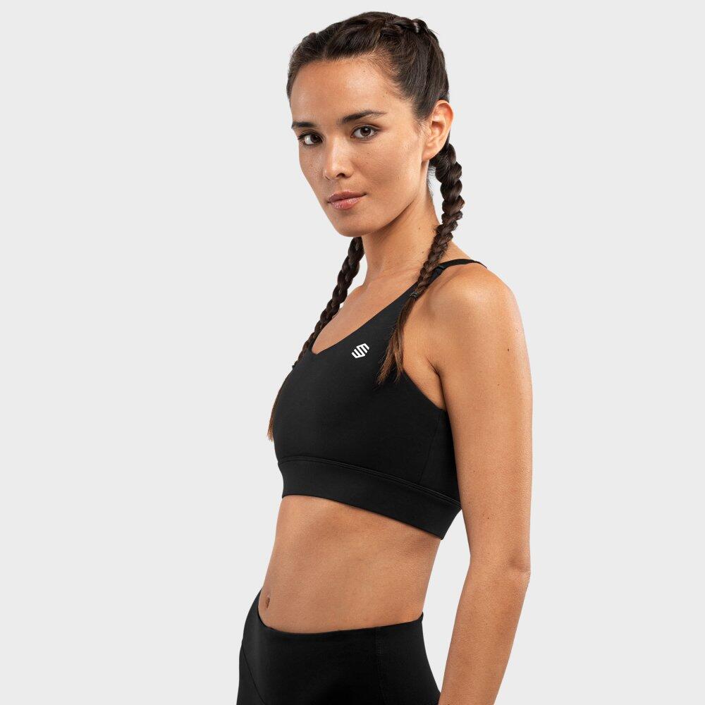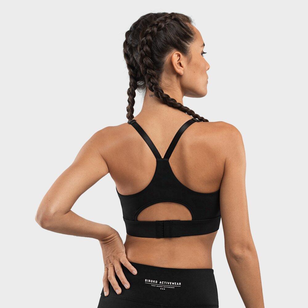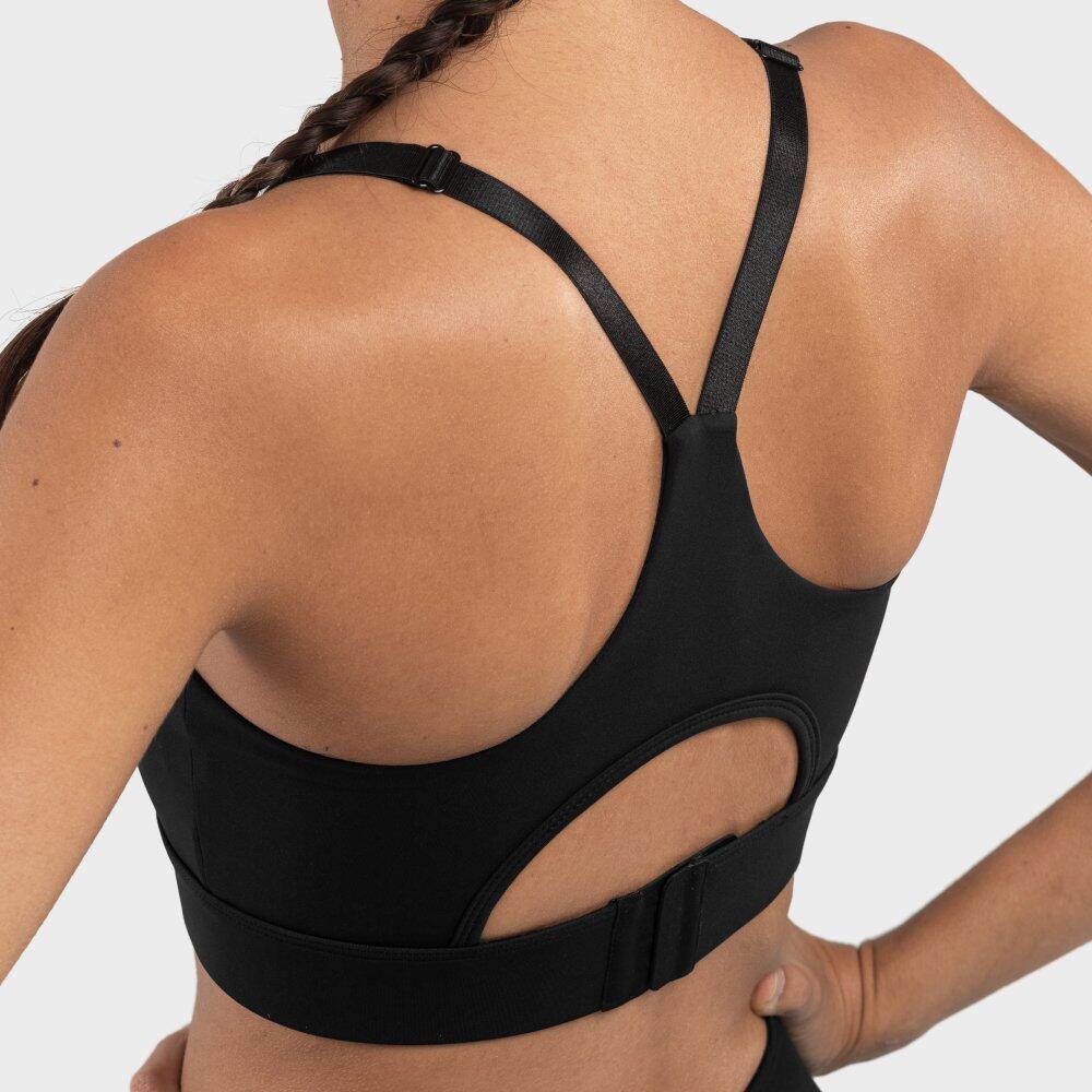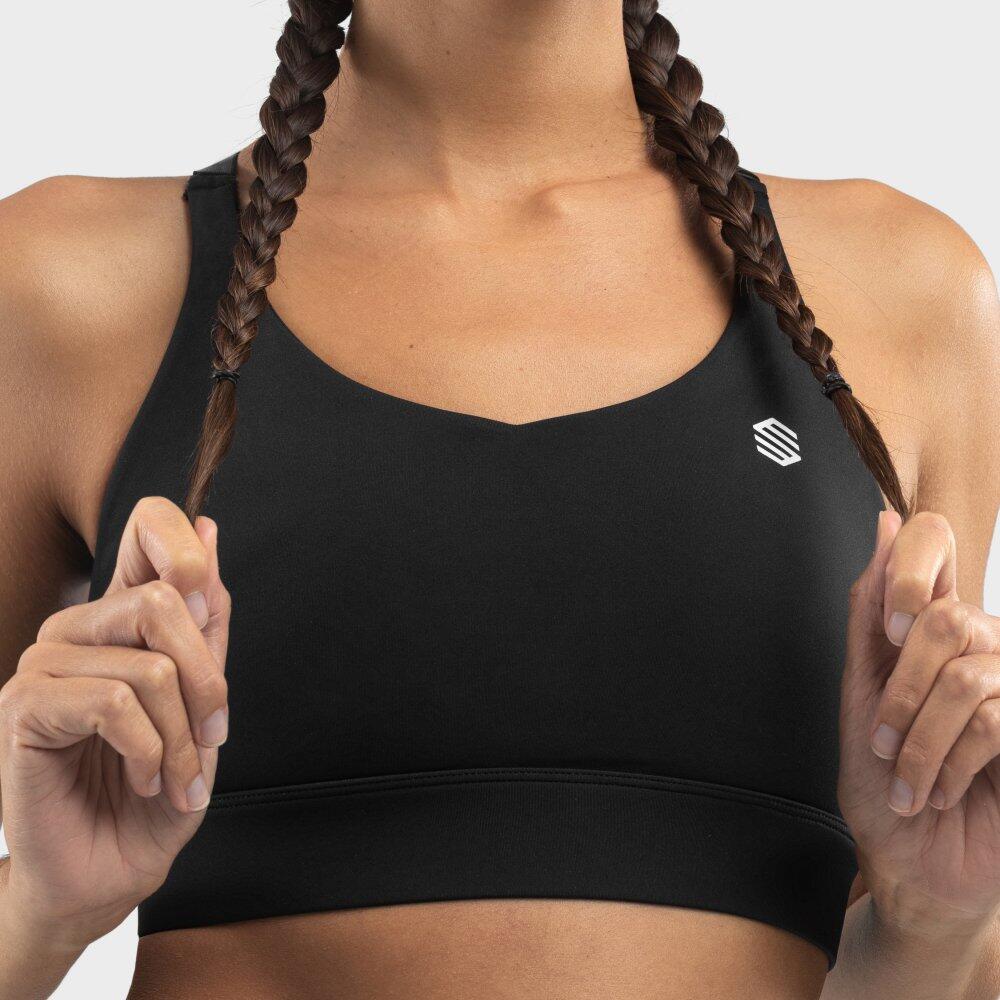 Pacemaker Black sports bra with racerback design and hook and eye closure for high-impact gym and fitness workouts Includes removable pads