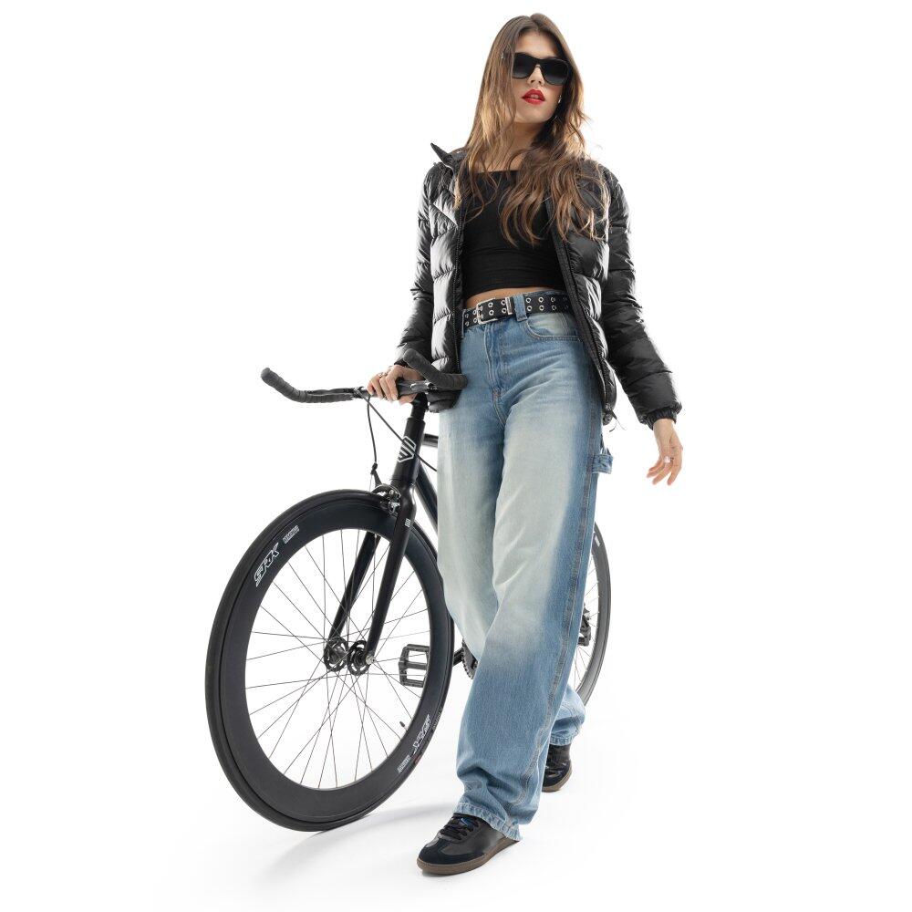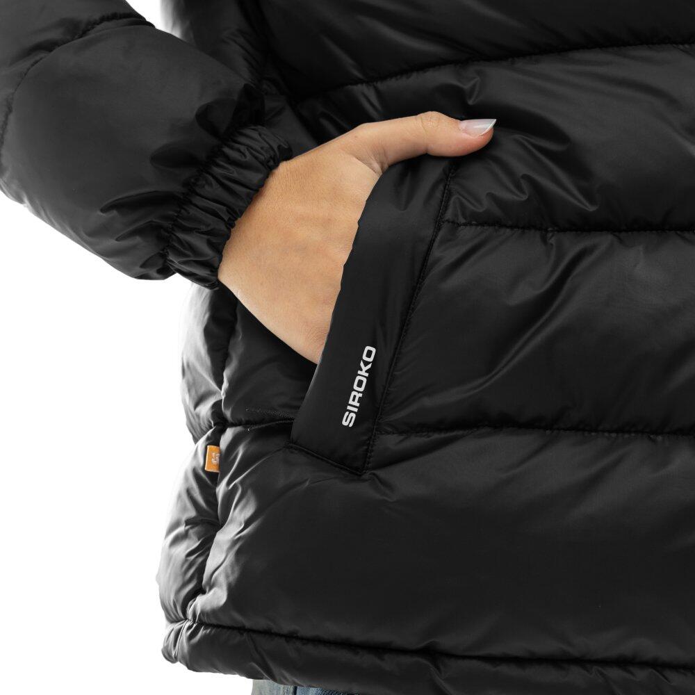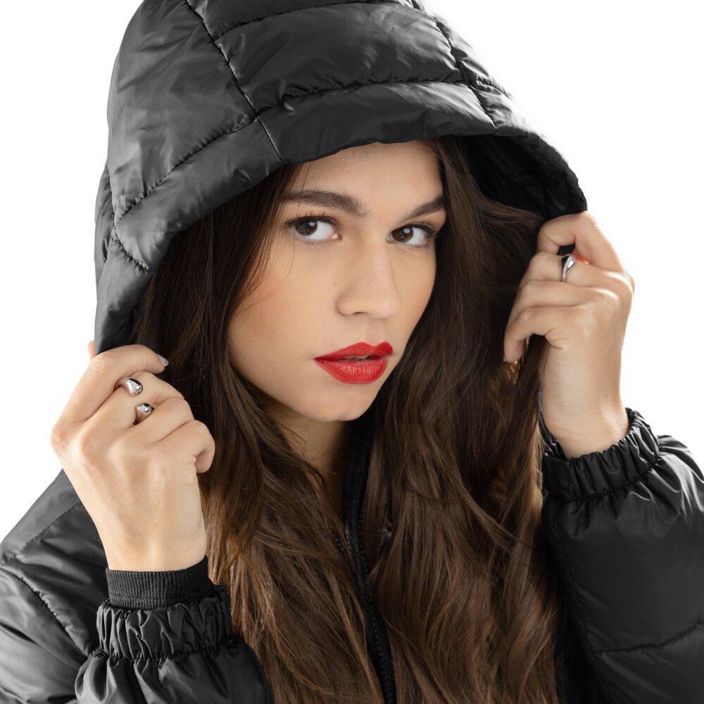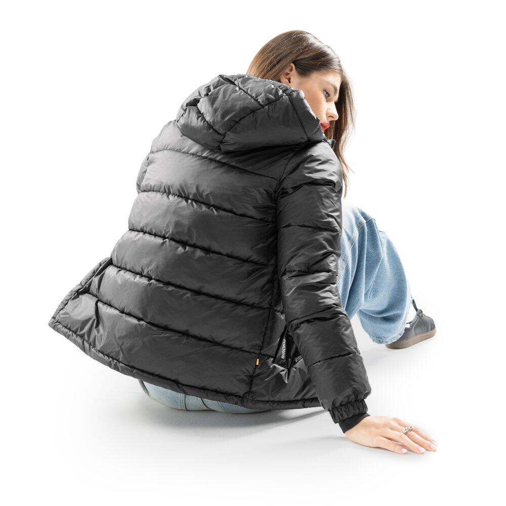 Black women's puffer jacket with Sorona® Aura insulation 320 g/m², ultralight fabric and adjustable hood, featuring two zip pockets and an adjustable hem for sportswear comfort.