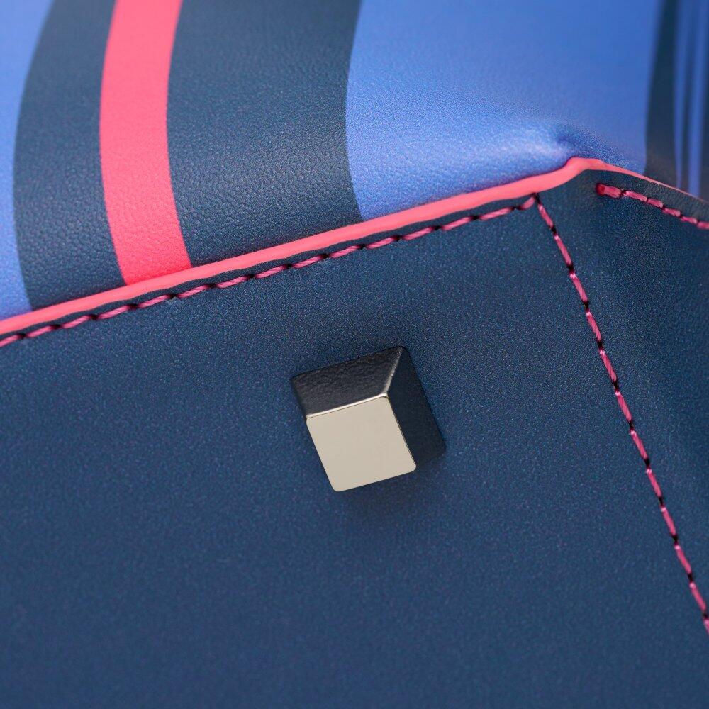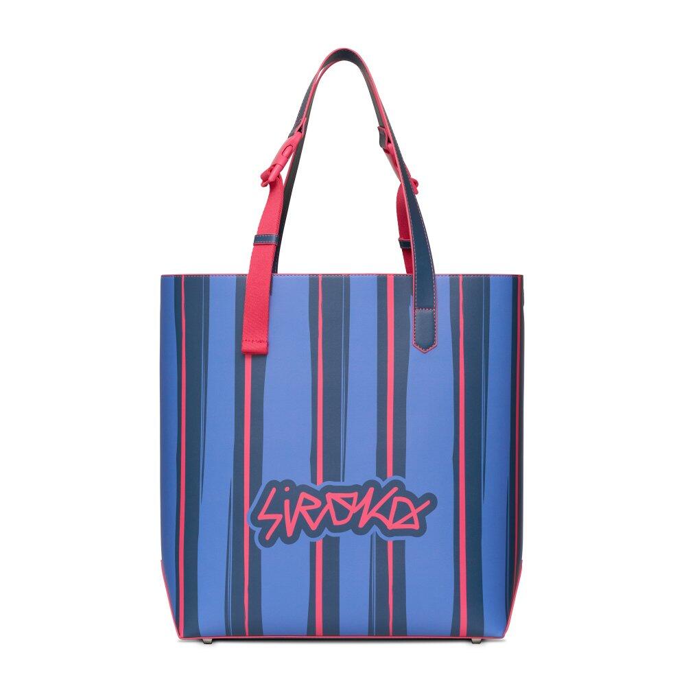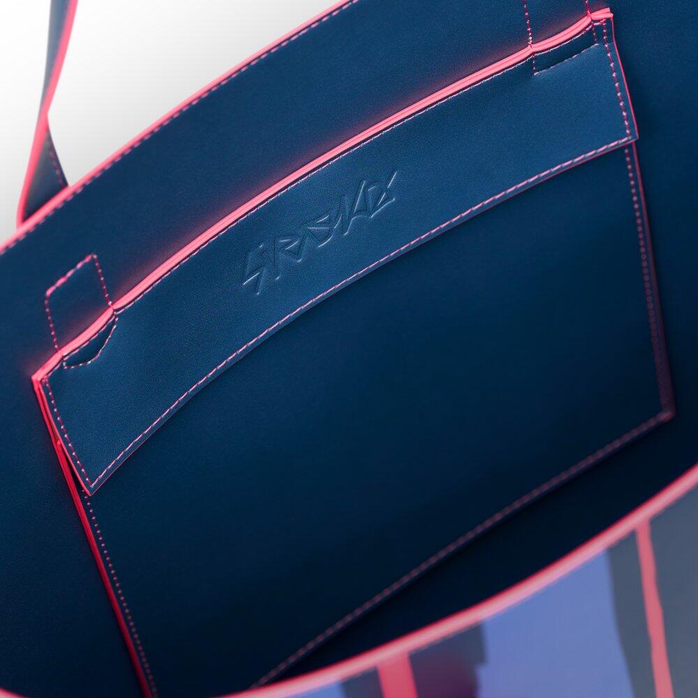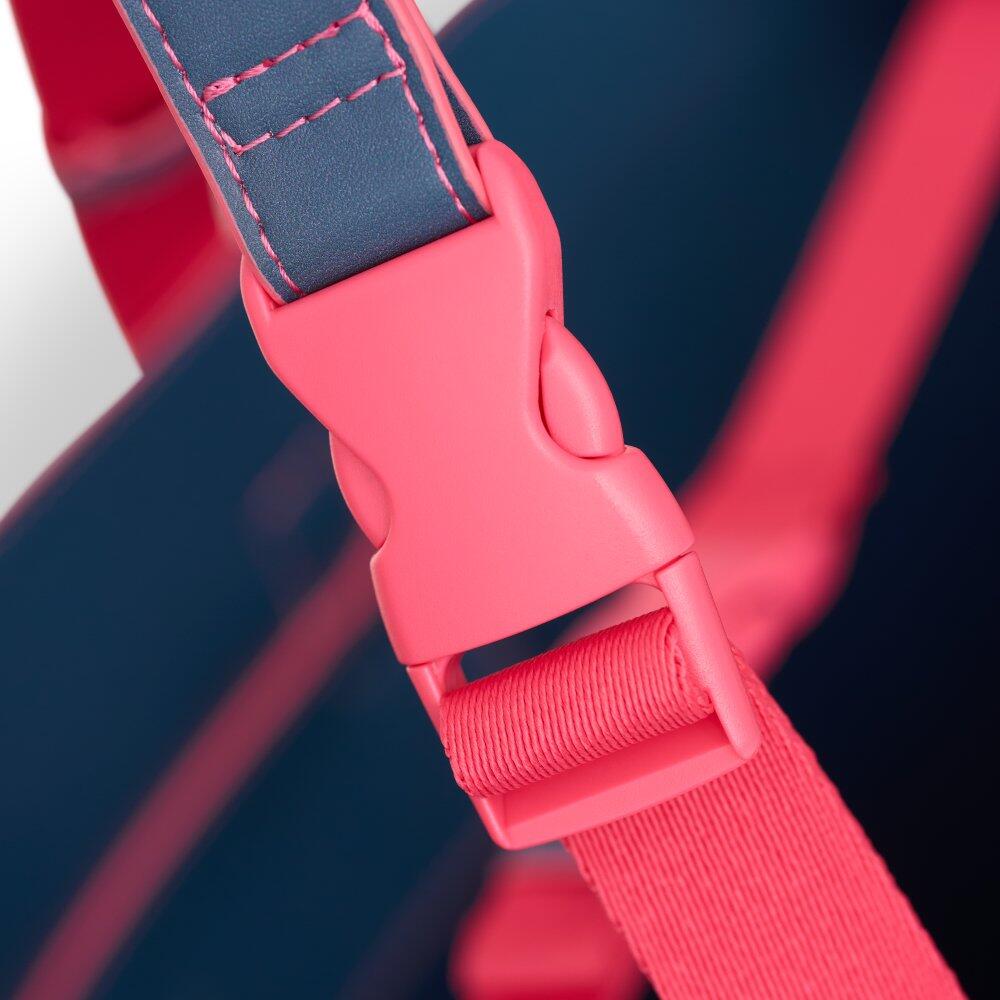 Tote bag made from double-layer recycled PVC with reinforced inner structure, piped edges for extra durability and an adjustable buckle handle.
