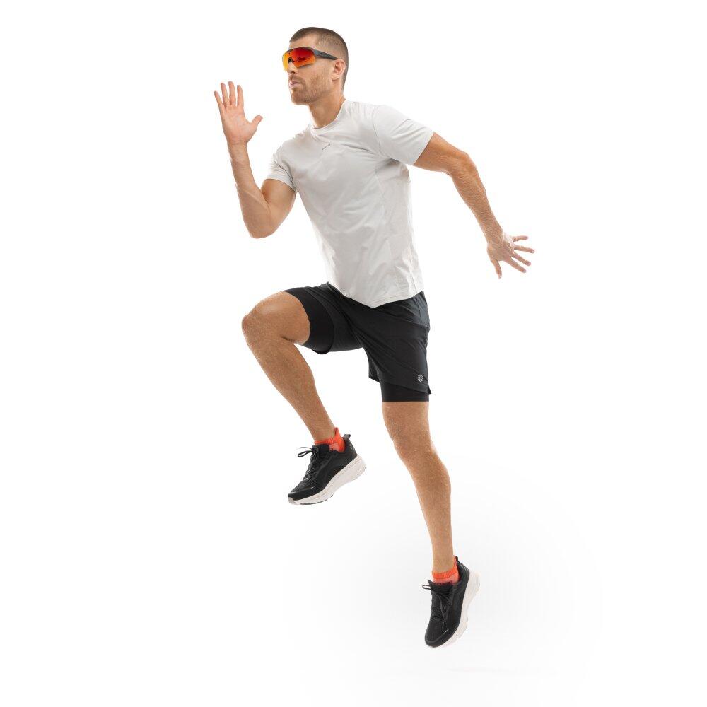 Ultralightweight, elastic and soft fabric. Designed for running, jogging, and outdoor training. Microperforated back panel, flat seams, and reflective detailing.