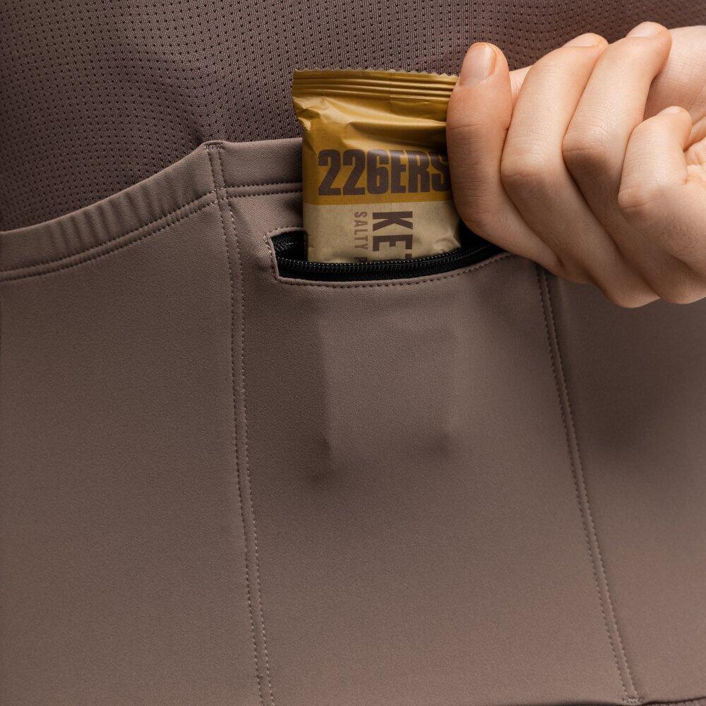 Ideal for transitional seasons and cooler days. Soft, lightweight, elastic fabric with microperforated back panel for breathability. Three rear pockets plus one small zippered pocket, laser-cut cuffs