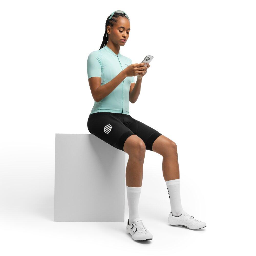Women's cycling jersey in recycled, lightweight and breathable fabric with micro-perforated panels, semi-automatic zip, non-slip hem and three rear pockets for optimal comfort in summer.
