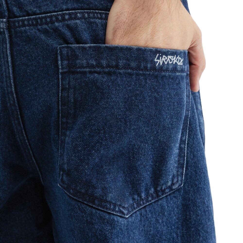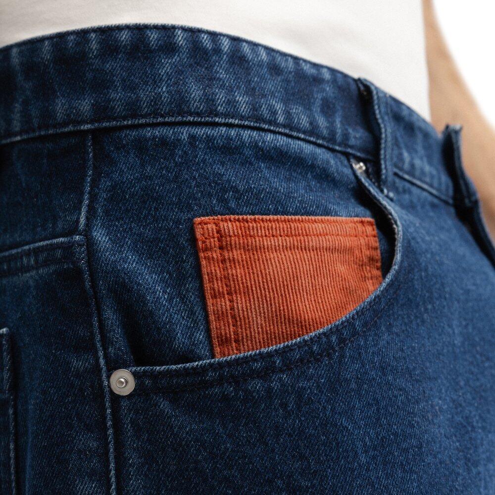 Men’s straight-leg loose-fit denim jeans made from durable cotton with a stone-washed finish. Corduroy pocket detail adds a subtle vintage twist to this modern, everyday essential. Five-pocket design