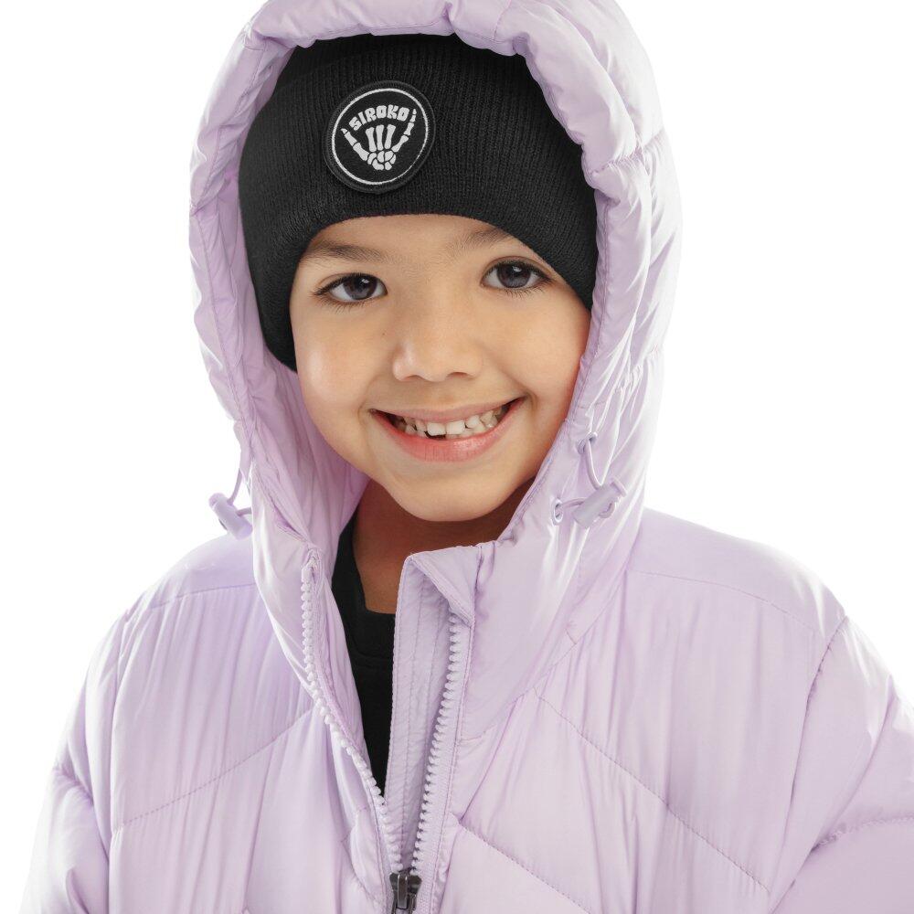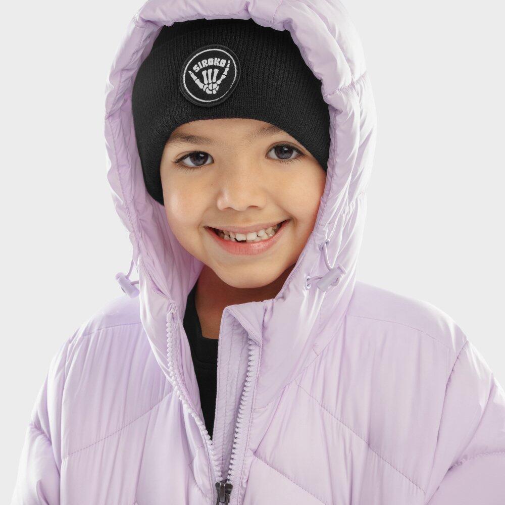 Purple boys' puffer jacket with Sorona® Aura 180 g/m² insulation, ultralight fabric and adjustable hood, featuring two zip pockets and waist adjustment hook.