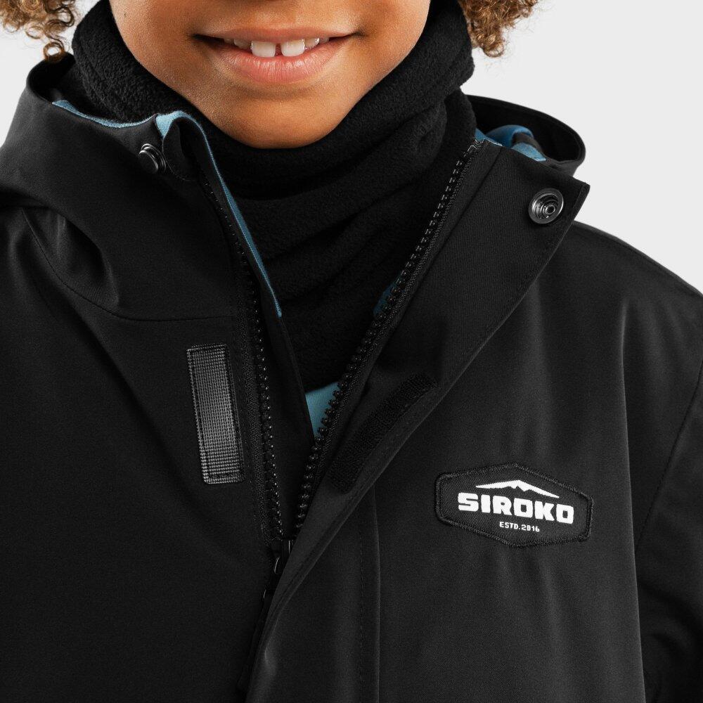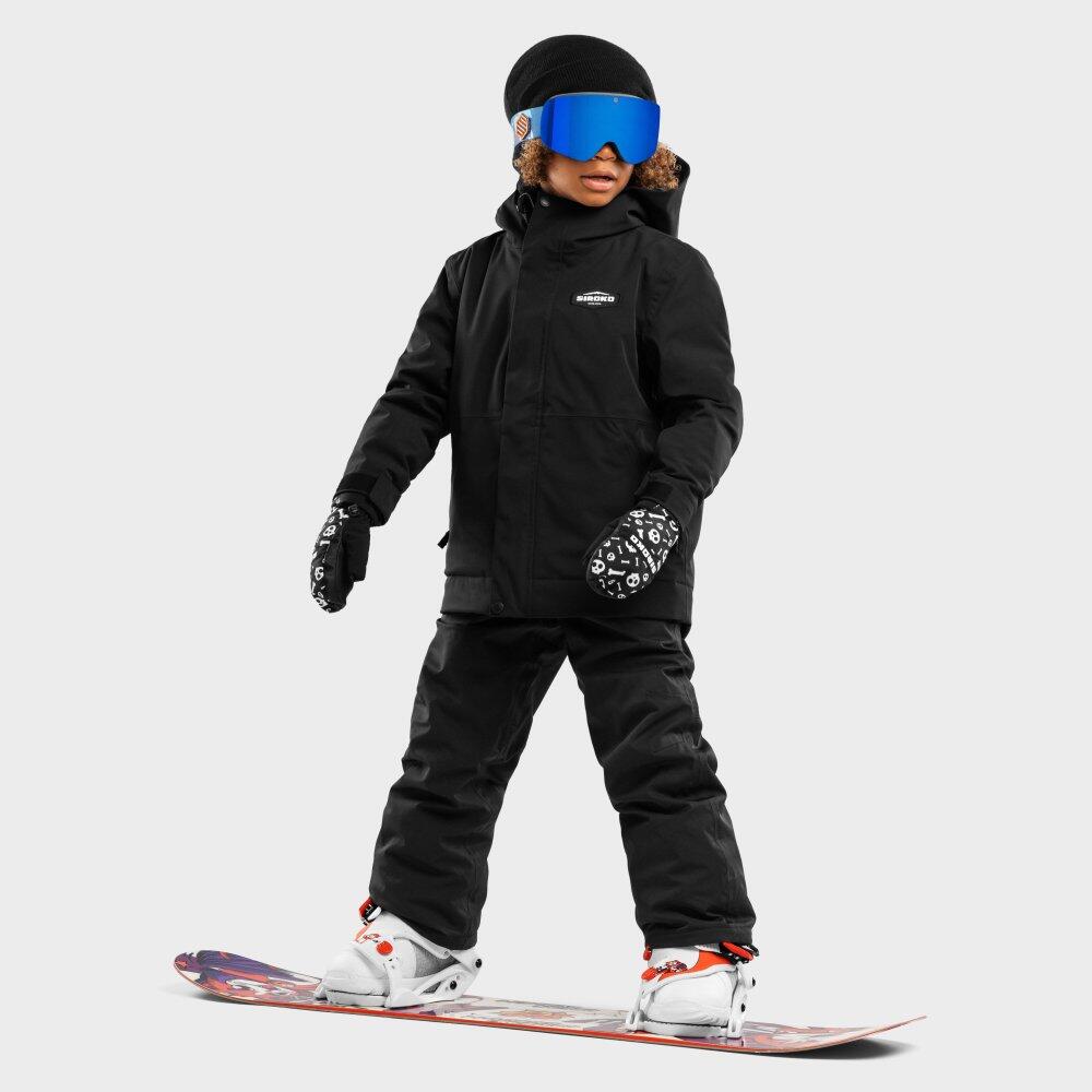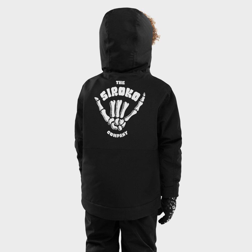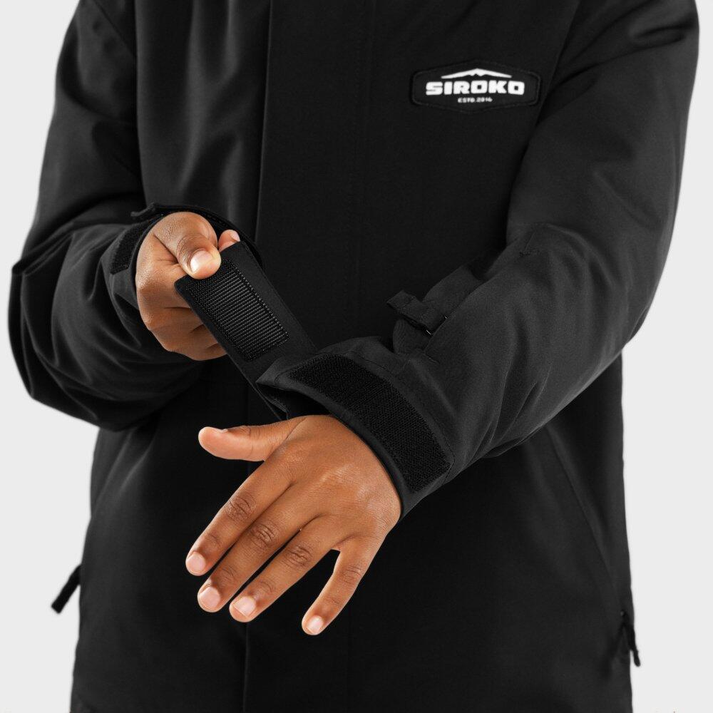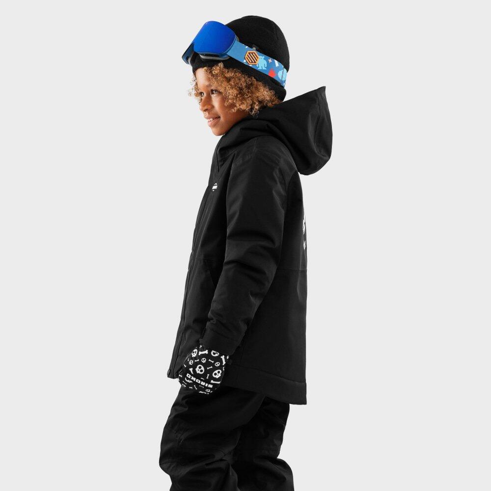 KW1 Rebel boys' snowboard jacket in black, waterproof and breathable (10,000/10,000) with Sorona® Aura insulation, Growing system and helmet-compatible hood.