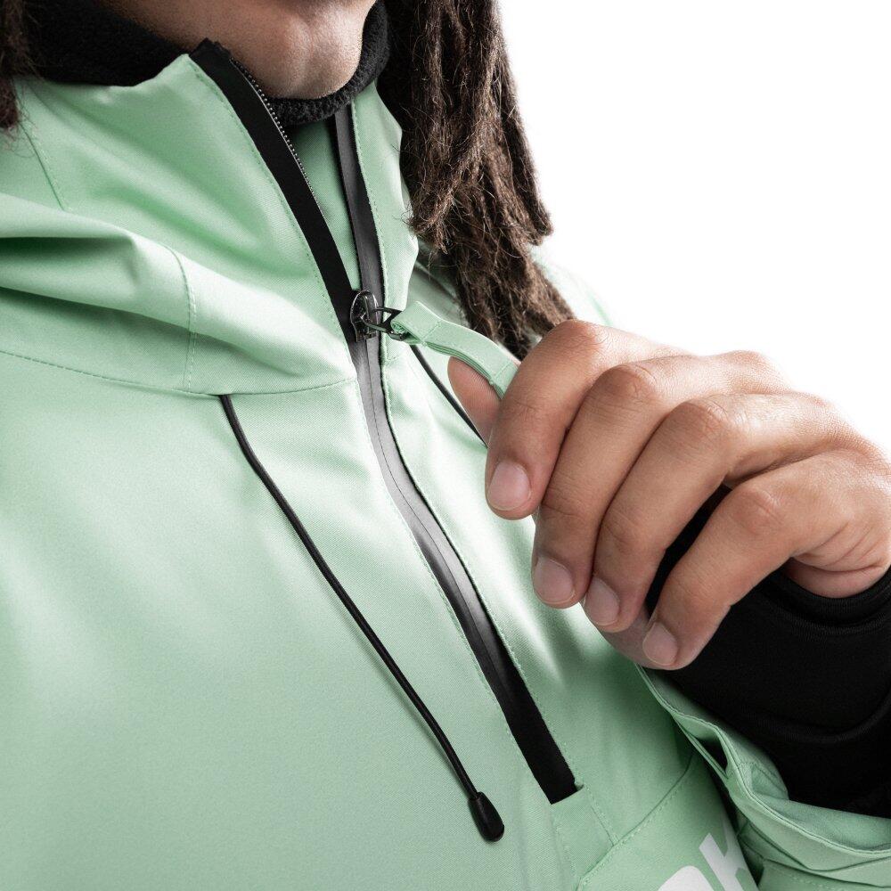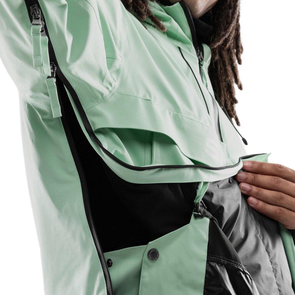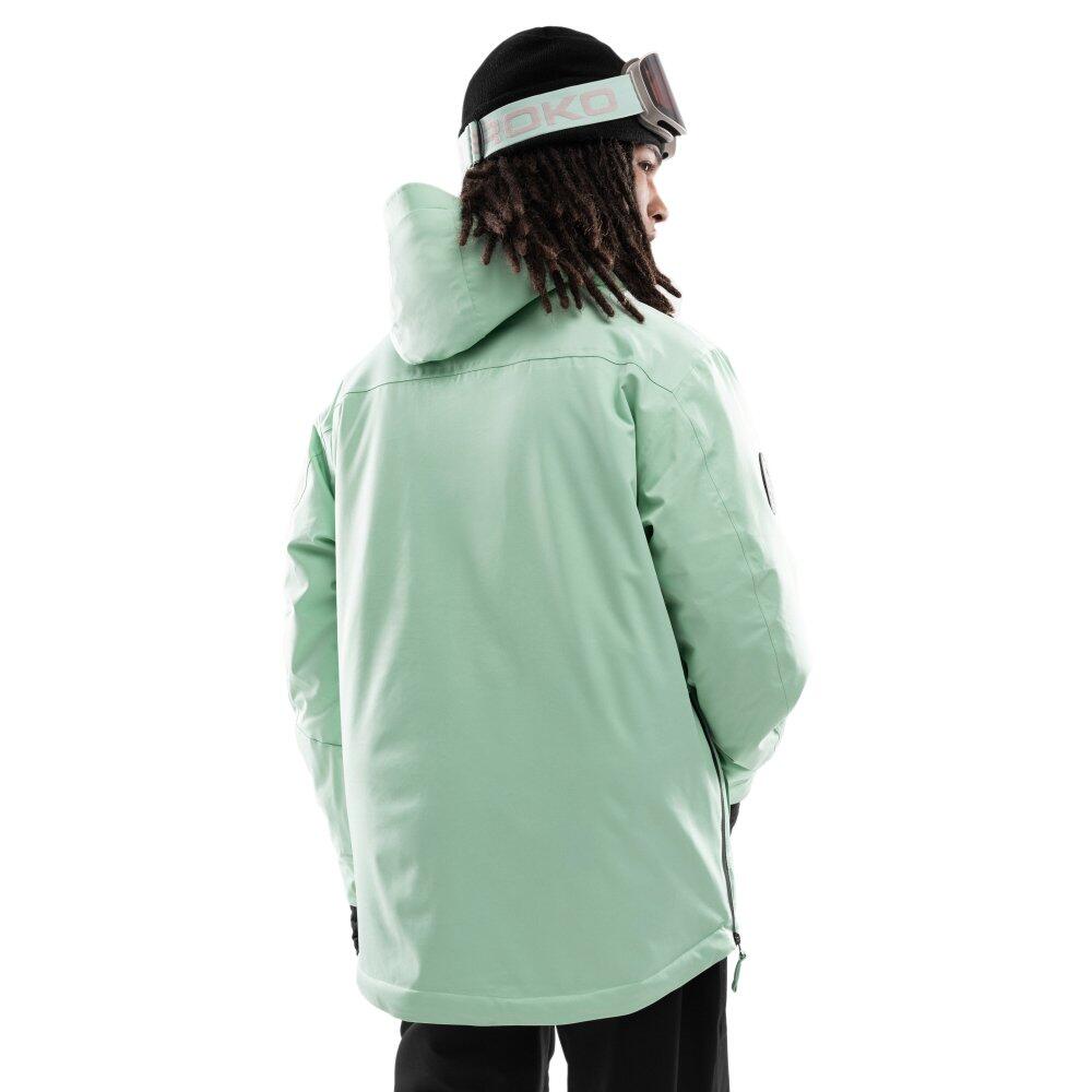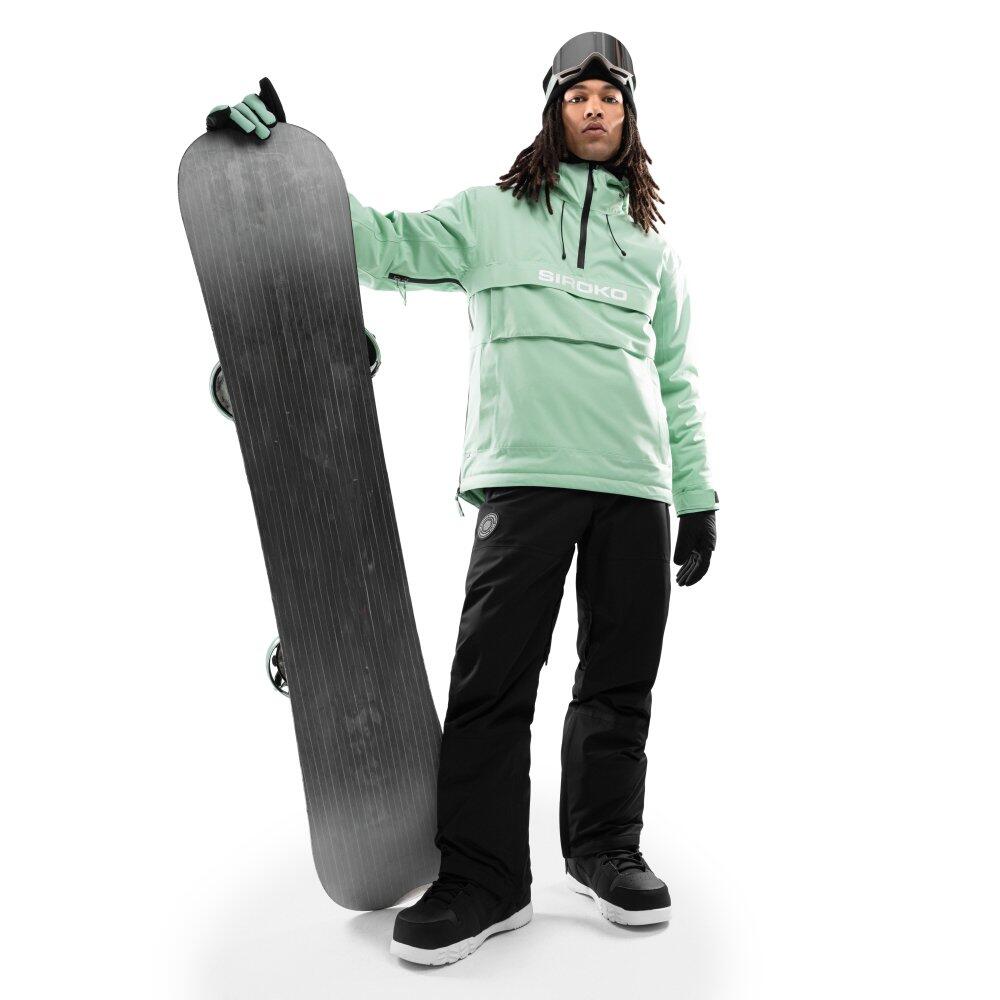 Green men's snowboard jacket with Sorona® Aura insulation sourced responsibly, 10,000 mm waterproofing and 10,000 g/m²/day breathability, featuring multimedia pockets and removable snow skirt.