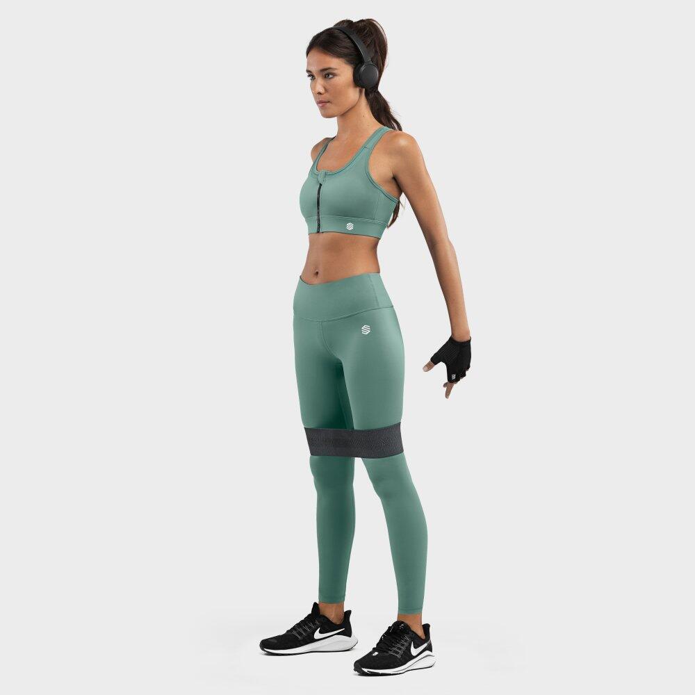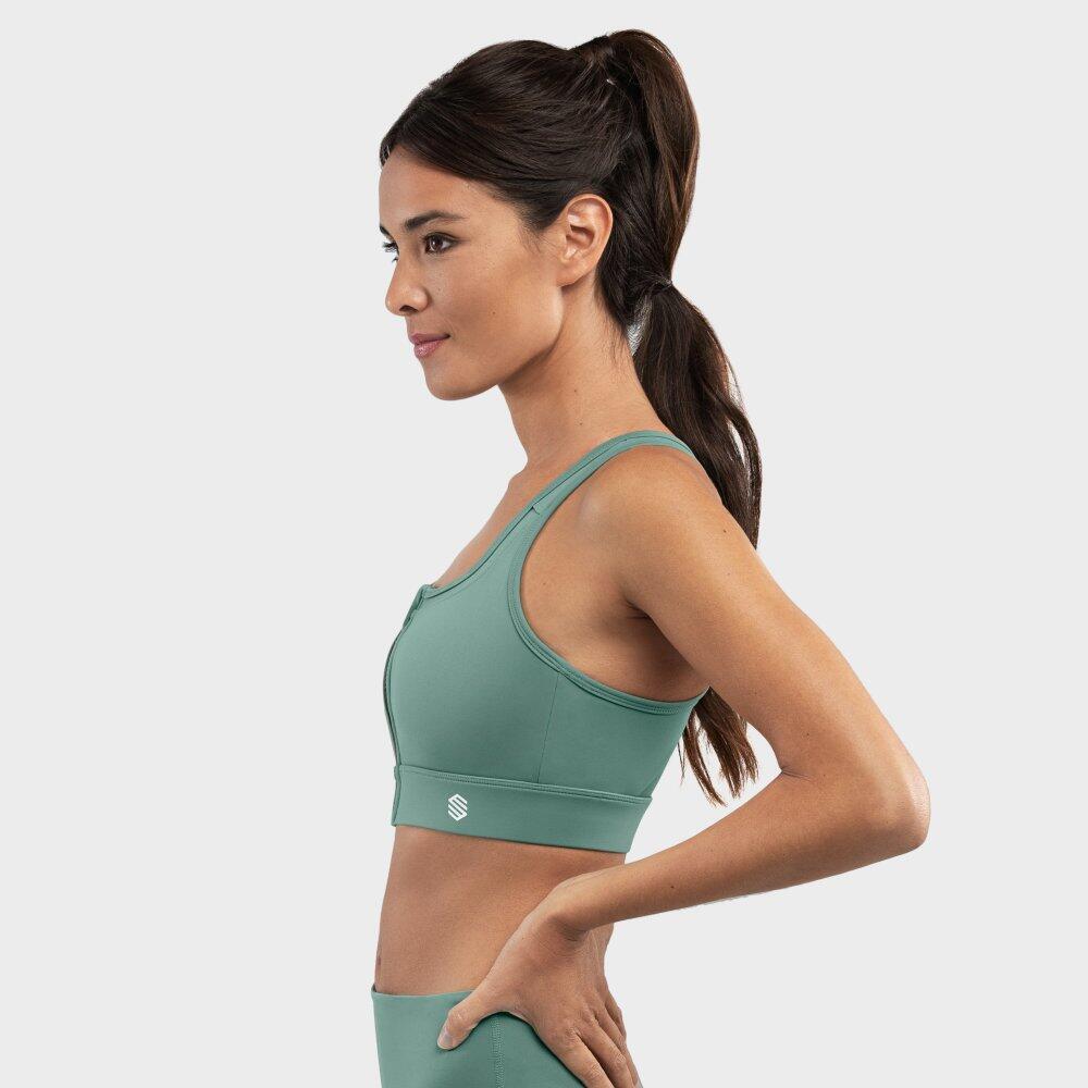 Squat Green sports bra with nylon and elastane fabric, racerback design, and zipper closure Perfect for high-impact gym and fitness workouts