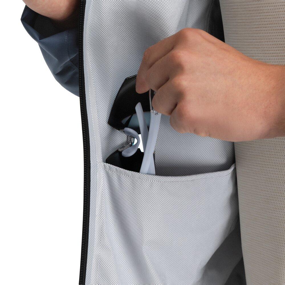 Ultralightweight hooded rain jacket for trekking and outdoor sports with 10K waterproof rating and 5K breathability. Sealed seams and waterproof main zipper. Compact and portable, features a self-stow
