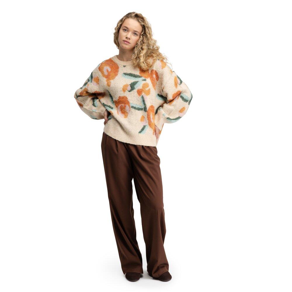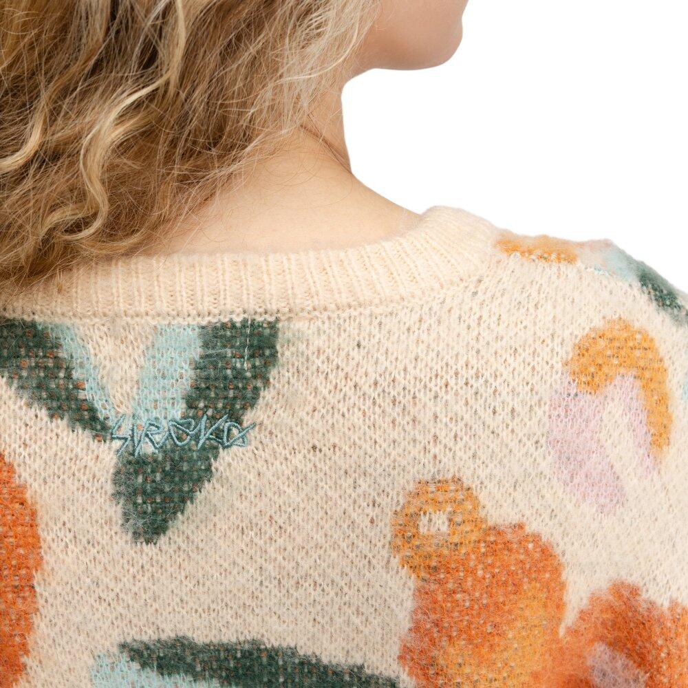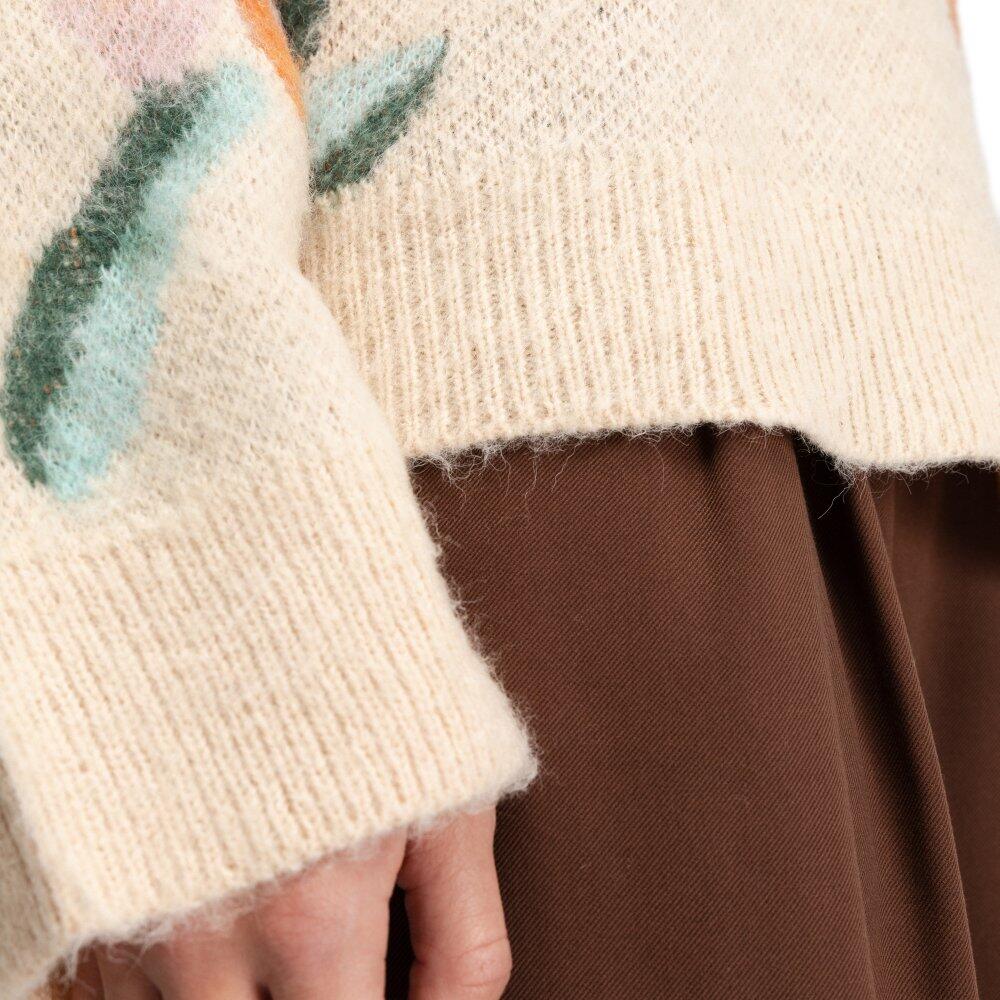 Chunky textured knit pullover with a bold multicolor intarsia motif. Soft, warm and lightweight. Relaxed, boxy fit, long sleeves and dropped shoulders.